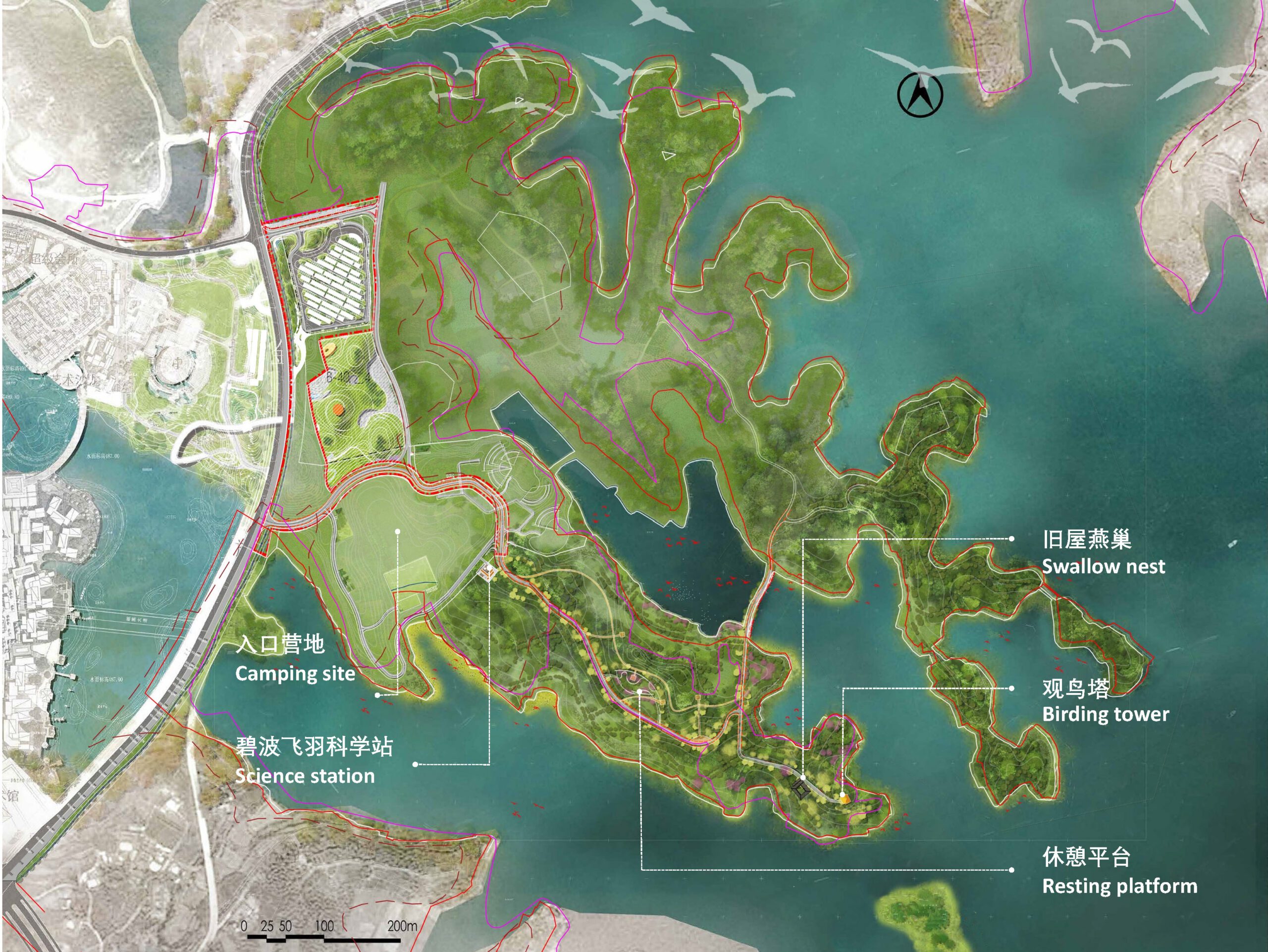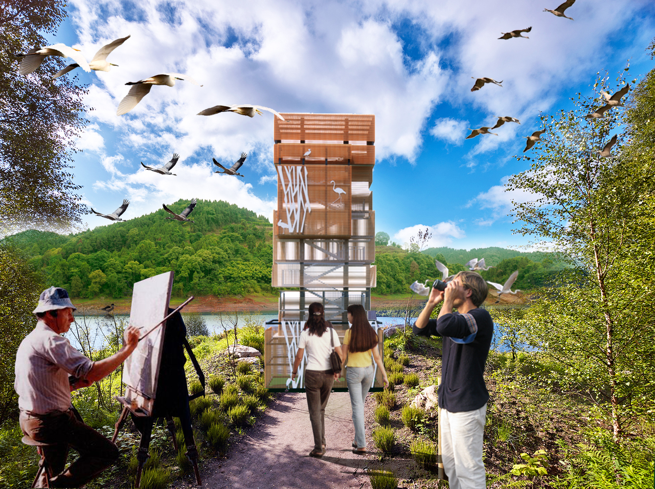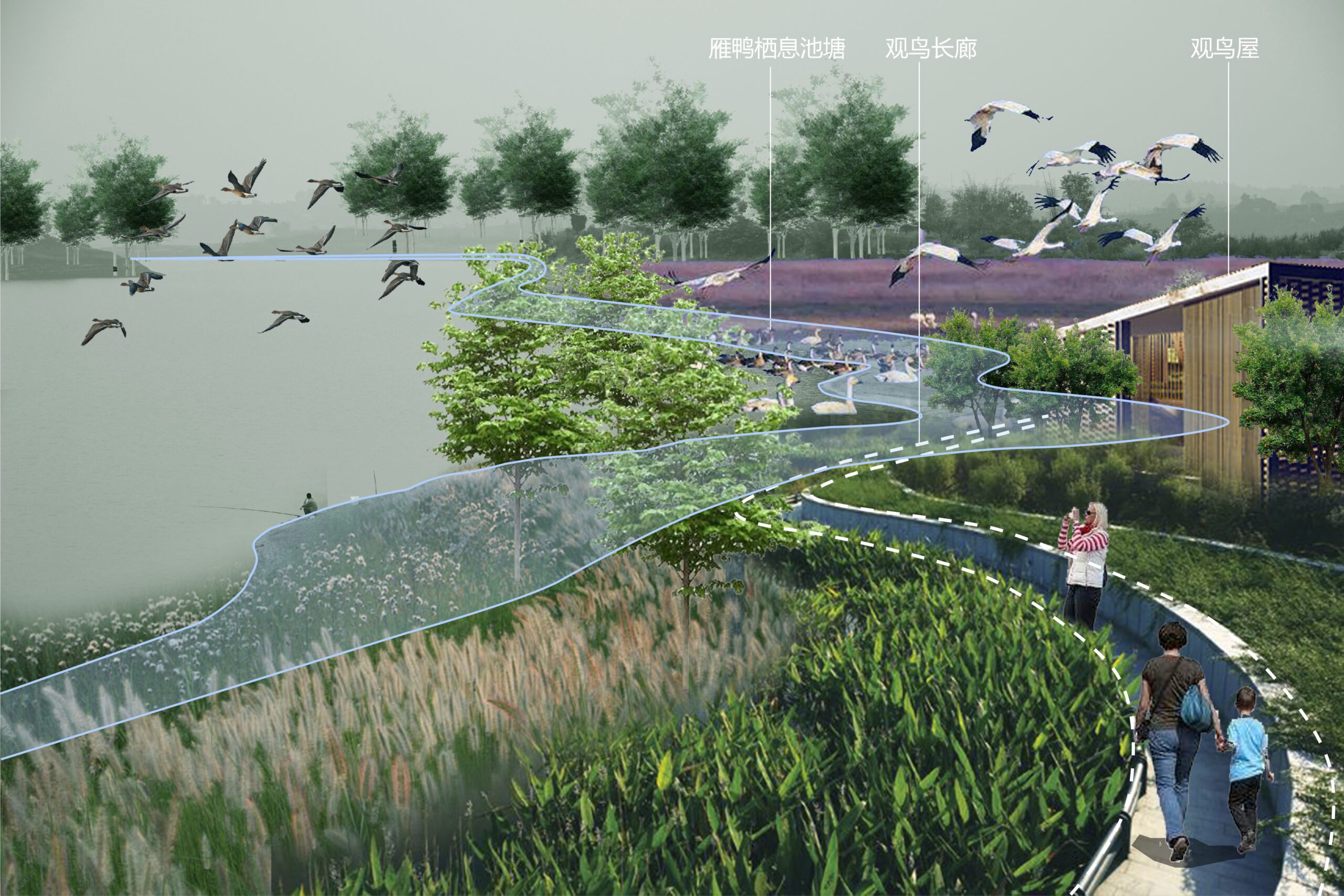 We respect the original ecological appearance of the peninsula. By adopting a natural architectural design approach, we set up a Bird-watching Tower and a Science Station. By integrating natural research and learning activities, we aim to create a natural education base for primary and secondary school students in Chengdu.