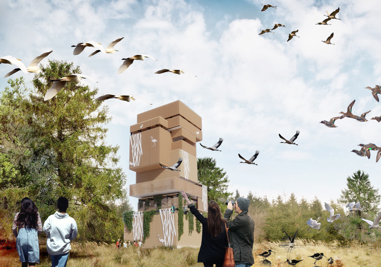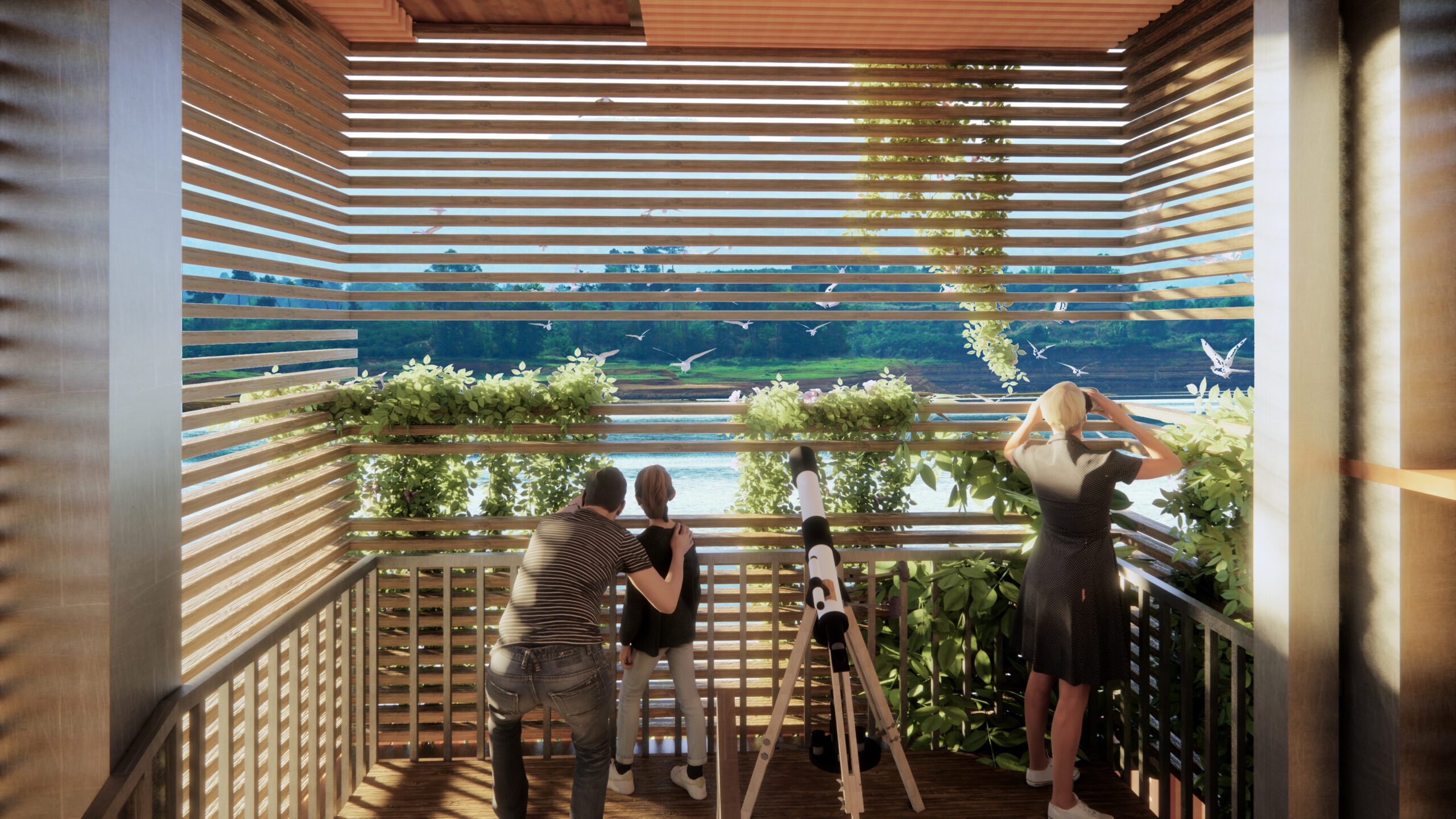 Bird experts have produced a heat map of bird distribution through field surveys. In order to fully respect the habitat space of birds, the bird watching tower was located in the woods close to the Lakes area. The concept of Bird-watching Tower is the "bird cube" - just like a Rubik's cube with changes on each side, providing a bird watching experience with different orientations. The Science Station is located at the entrance of the bird watching base and has been transformed from four containers. There is a bird's nest for swallows placed on the exterior wall of container. The function is the nature education classroom and ecological exhibition hall.