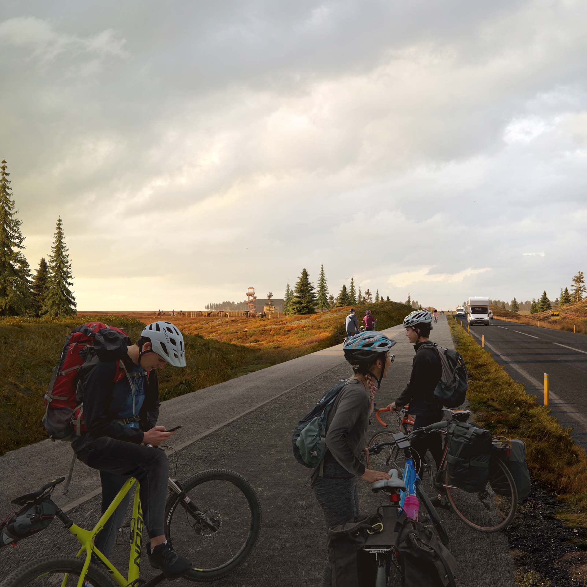 The landscape strategy takes the concept of afforestation as its basic premise to mitigate the harsh climate and create comfortable conditions that allow for shared programs, outdoor facilities and cycling networks. The vast landscape that currently separates the existing communities and new development clusters will grow into a uniting park. Organized as a network of nodes and linear elements, the proposed landscape will tie the entire peninsular together into a coherent whole referred to as the Peninsula Park. The park will bring back the original nature of the peninsula reintroducing trees as a strong part of its identity. It will connect communities, mitigate wind through landforms and reforestation. Cleaner air, less wind, new opportunities for sports, recreation and learning will improve the liveability of the area for all generations, strengthen the culture of active outdoor use. The landscape strategy for the Peninsula Park uses afforestation as a means to mitigate the climate, meanwhile creating a shared identity that refers back to the historical landscape of Suðurnes.