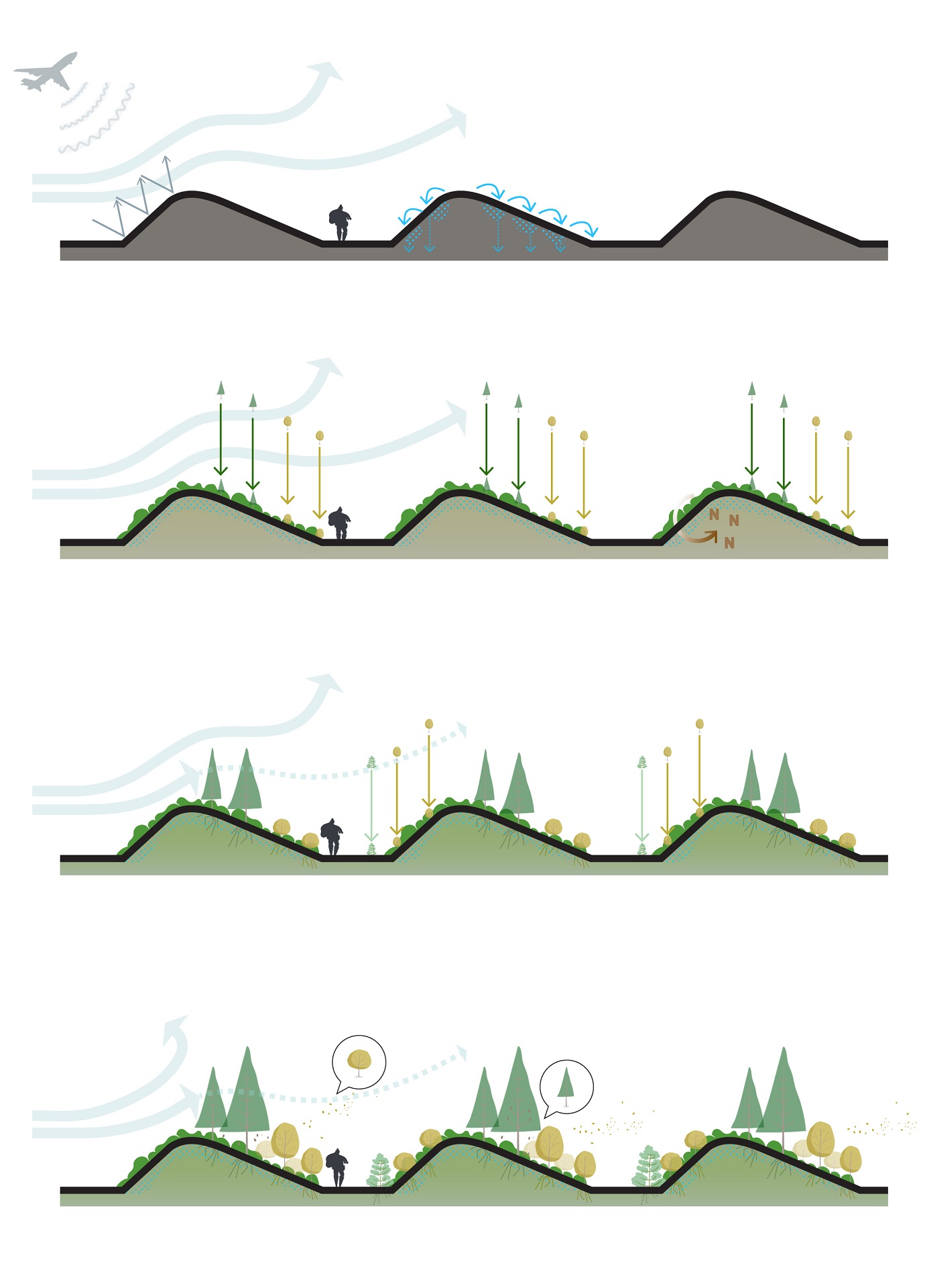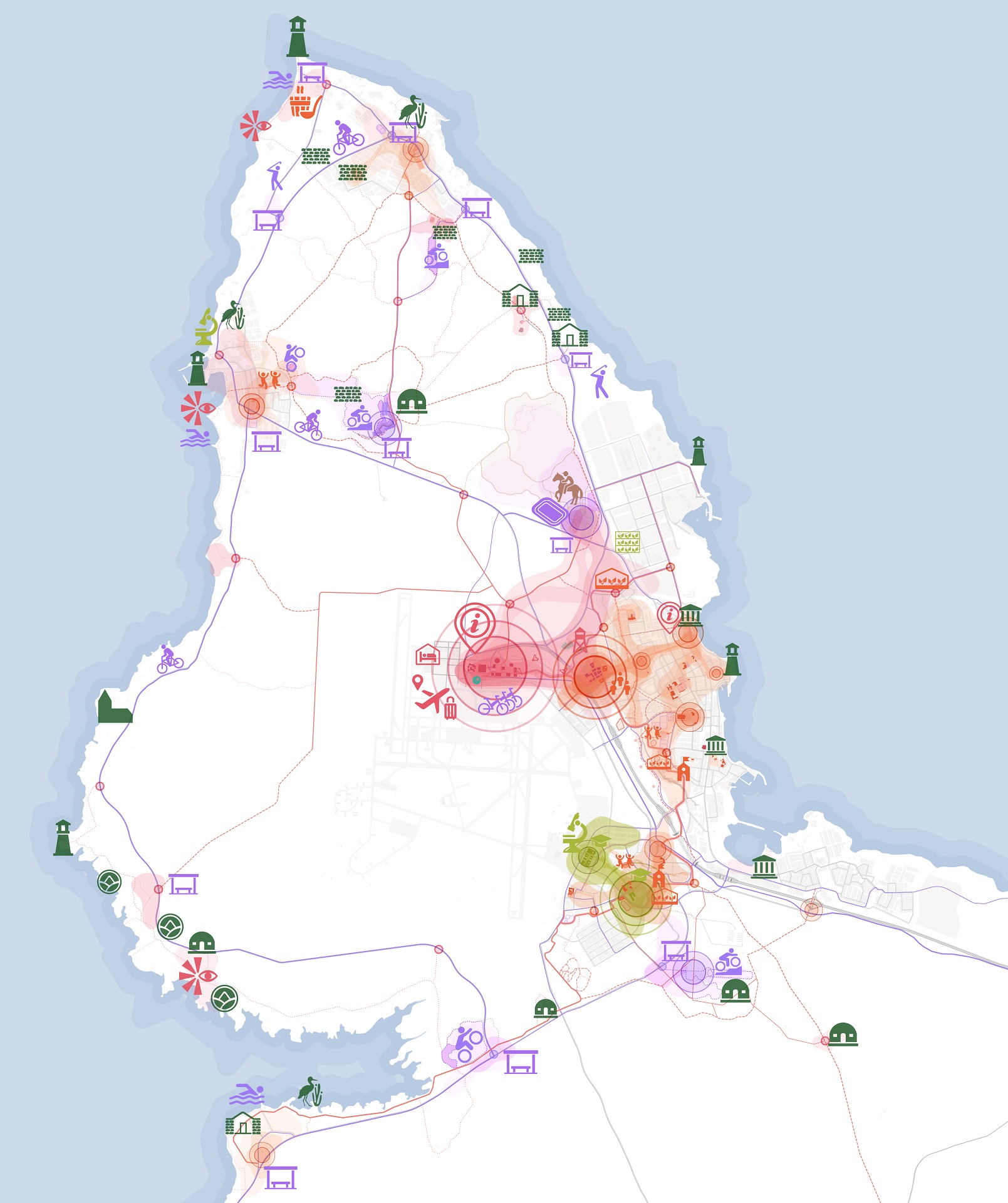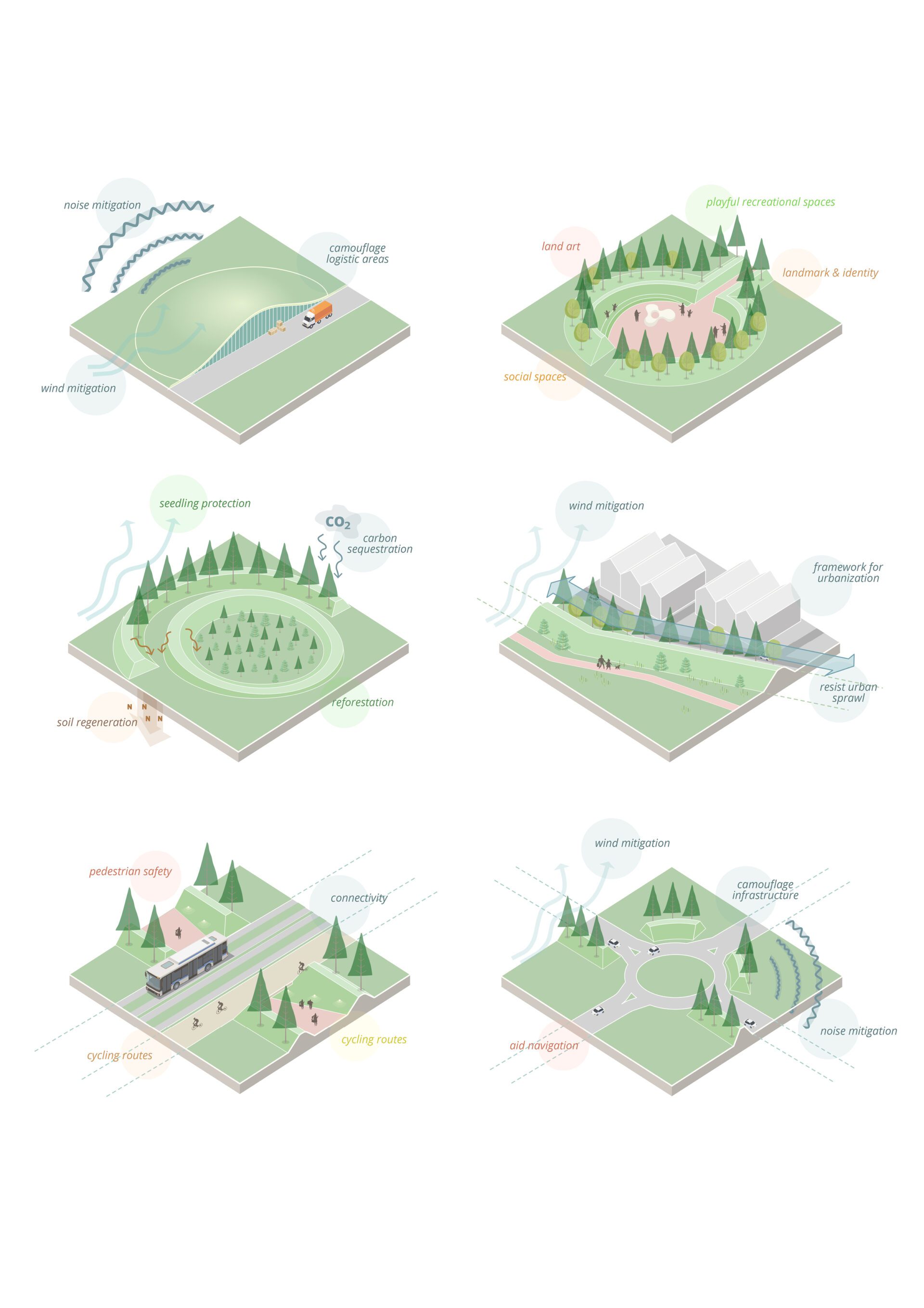 Every individual development contributes to the realization of the new Peninsula park, but the backbone of the Peninsula Park is formed by networks for walking, hiking, biking and horse-riding. They enhance and connect existing trails and circuits, strengthening the physical relation between different communities and the airport. The peninsula contains unique natural and man-made landmark ‘nodes’ - points of interest for locals and visitors. New nodes will increase traffic and improve the overall quality of the outdoor experience, adding up to a system of social facilities and embed existing public amenities. Inspired by the traditional Icelandic turf house, landforms become a natural part of the landscape and make afforestation possible. The land is sculpted with small hills and ribs, a series of landforms, berms and larger forest patches, to create protected zones against the wind. On these zones, trees can be planted and sown, allowing them to gradually turn into forests. The creation of this new sculpted landscape is linked to all new developments on the peninsula and functions as a social catalyst for the existing communities to improve their amenities. Mitigation landforms protect bike paths and walking trails from the winds, create public spaces inside urban, shelter public transport hubs.
