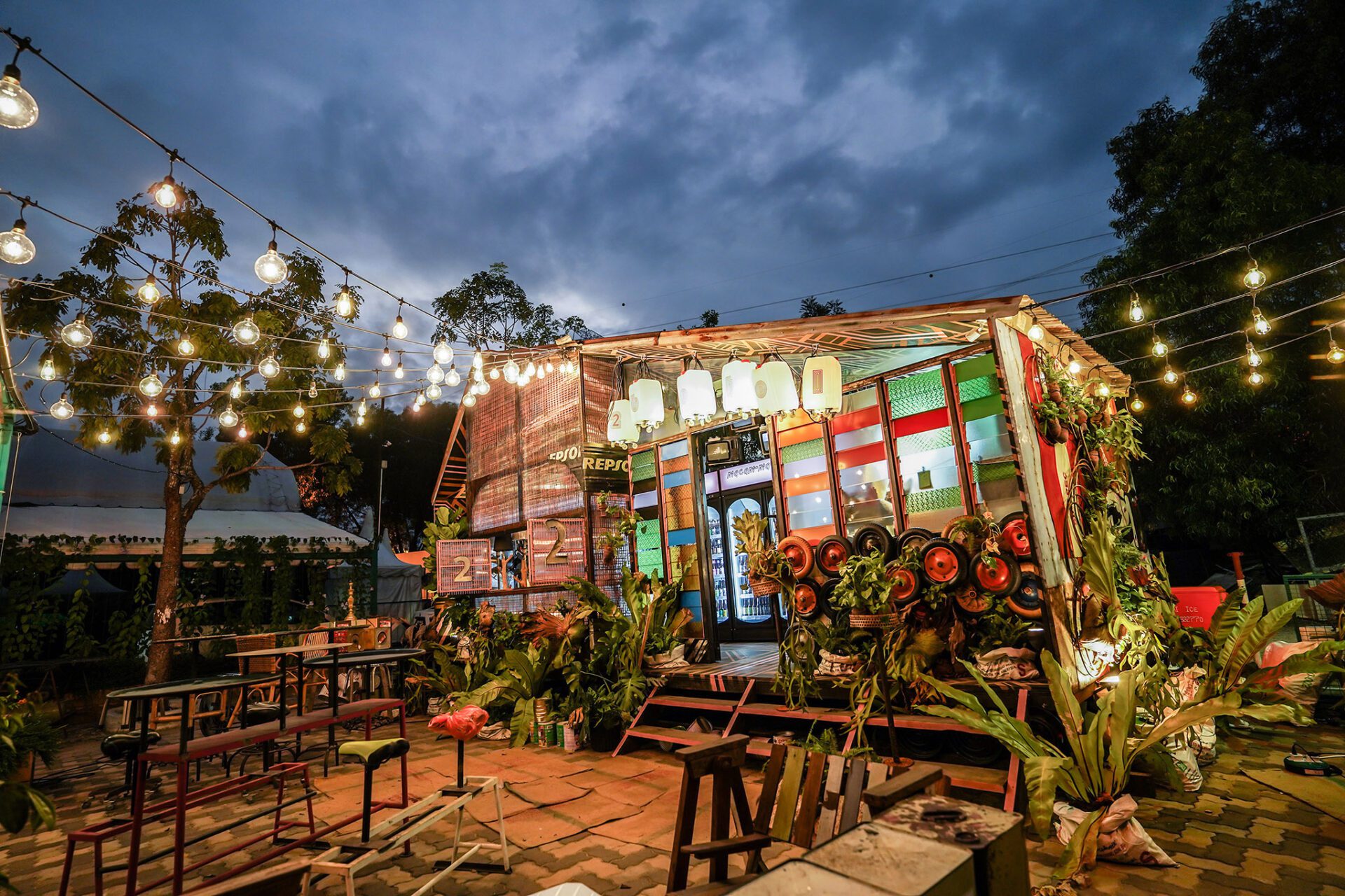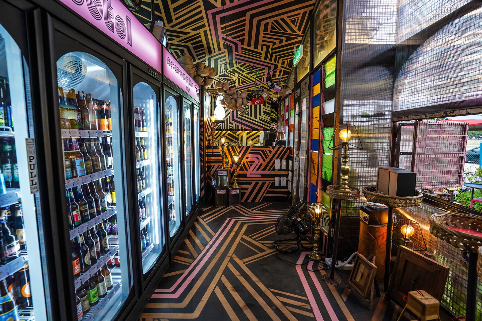 Constructed from entirely repurposed materials, the bar’s structure reflects raw authenticity and sustainability. Discarded wheel rims serve as foundational supports, while steps were reconstructed using old wooden staircases. Exterior walls were made from rusty grating panels and old oil drums, and the roof from used corrugated iron sheets. Rather than using standard aluminium frames, we selected old “kampung glass” louver windows for the right front facade, and large folding windows on the left for enhanced ventilation and openness. An extra small window was added to reduce the enclosed feel. The door is crafted from a discarded signboard with an old air pump as its handle. Above the door, a chemical barrel with an internal light source functions as the shop’s main signage. Inside, recycled wood panels finished with paint line the floors and walls.
