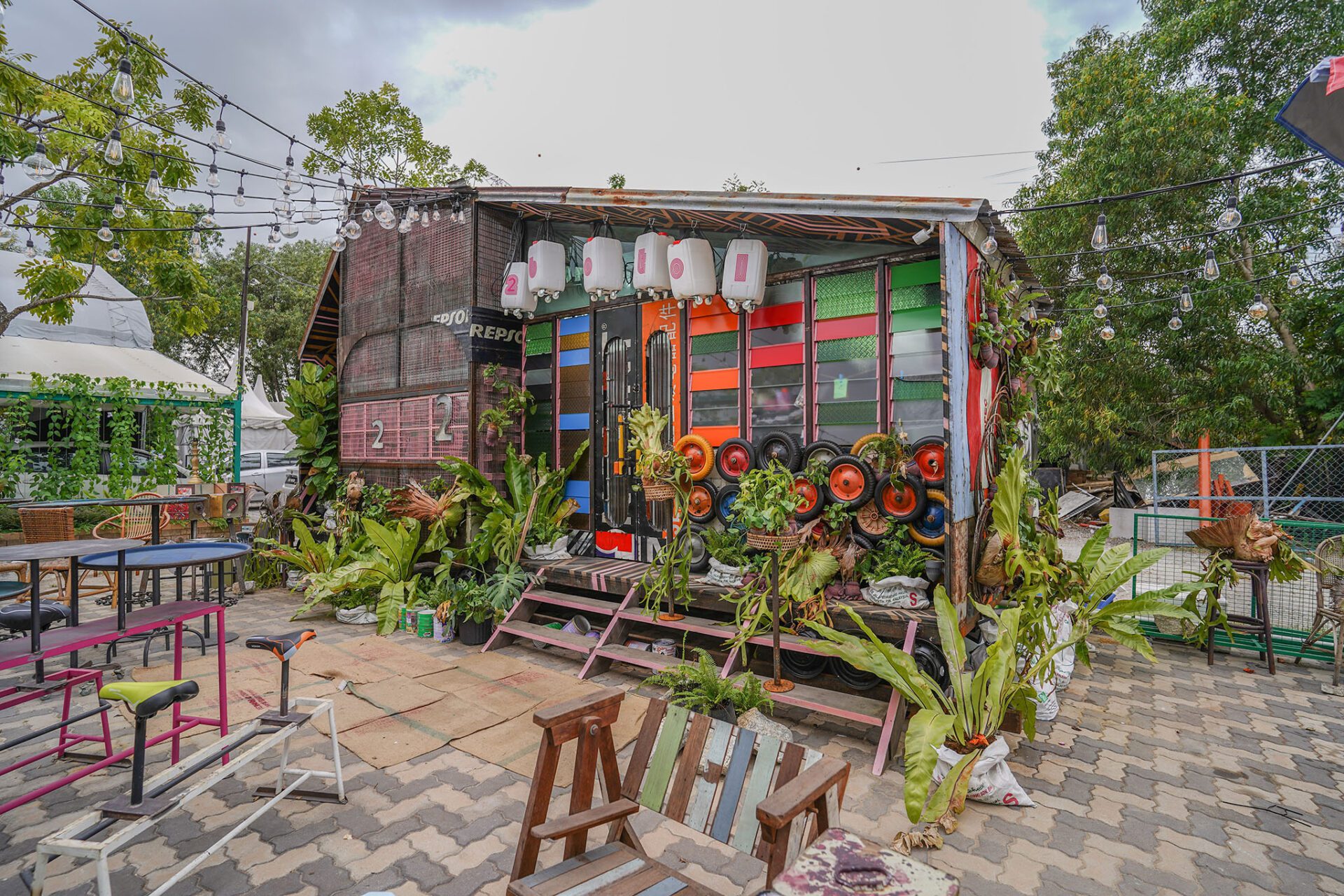 All guest seating is constructed from discarded materials. Table tops are crafted from polished oil drum lids, while the legs were repurposed from old metal frames to ensure durability. Chairs and benches were sourced from second-hand shops, then reworked for comfort and stylistic cohesion. Each furniture piece was carefully processed to retain its character while gaining renewed life and function. This approach not only extended the utility of discarded objects but gave them artistic and emotional resonance.