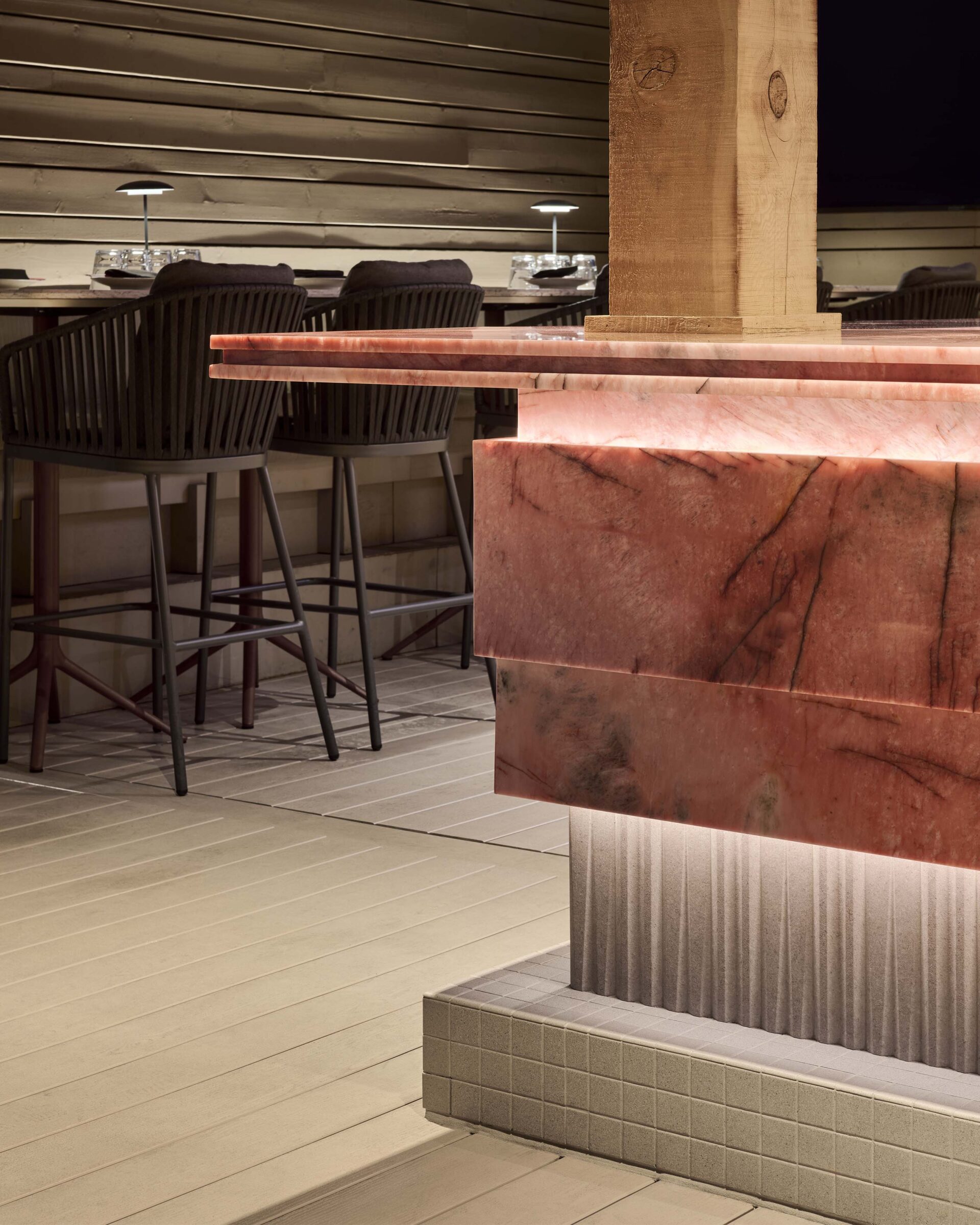 The redesigned space enhances flow and experience. A custom breeze wall, crafted from black brick in a Tetris pattern, elevates a functional necessity into a design statement. At night, a halo of circular light from adjacent sconces creates a striking welcome. The bar, originally bisecting the space and disrupting movement, was relocated to the entrance, transforming the guest experience. Crowned in Cosmopolitan Quartzite, a pink-veined stone with a natural glow, it now serves as the primary touchpoint, balancing the lounge at the rear.