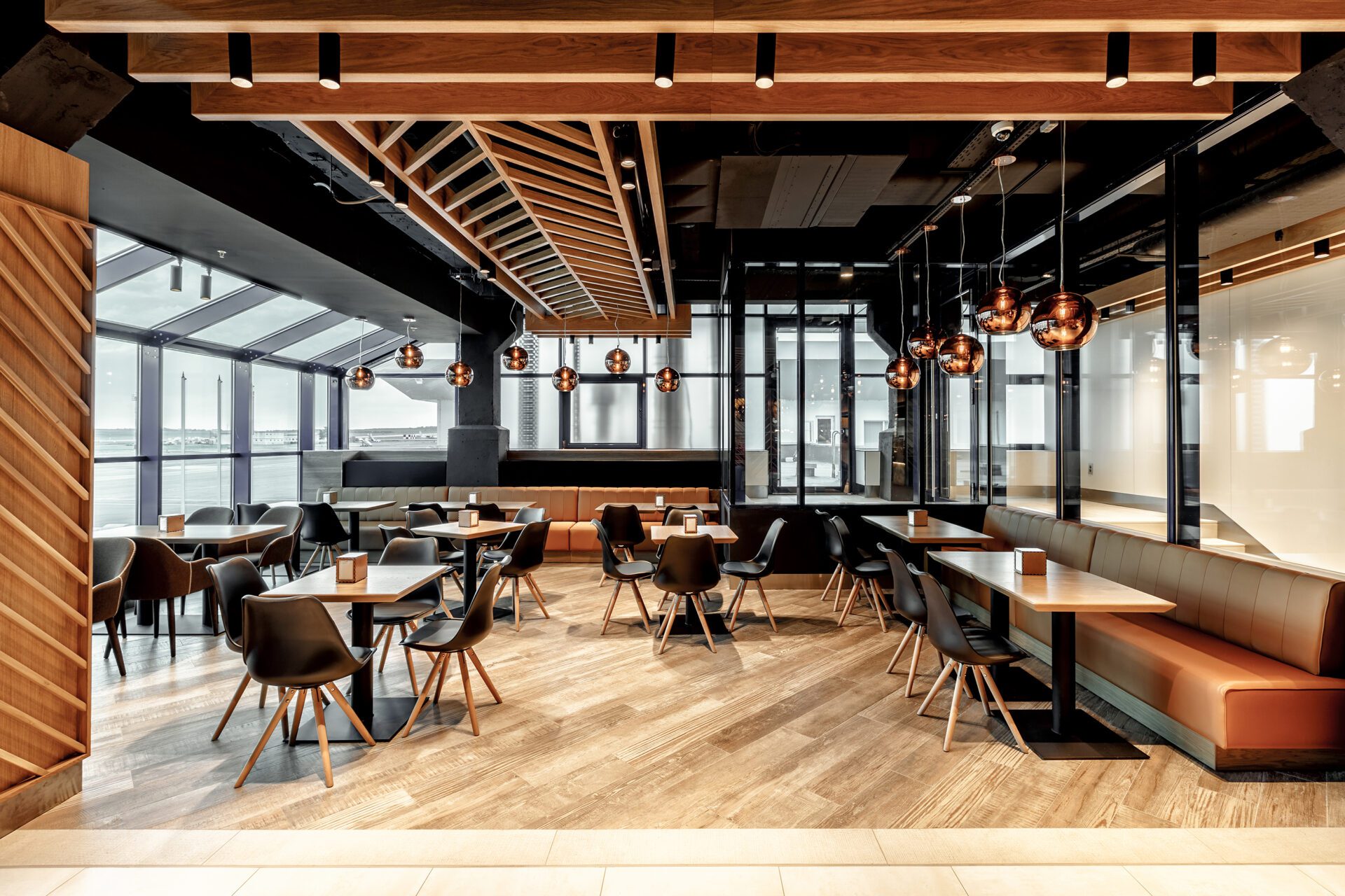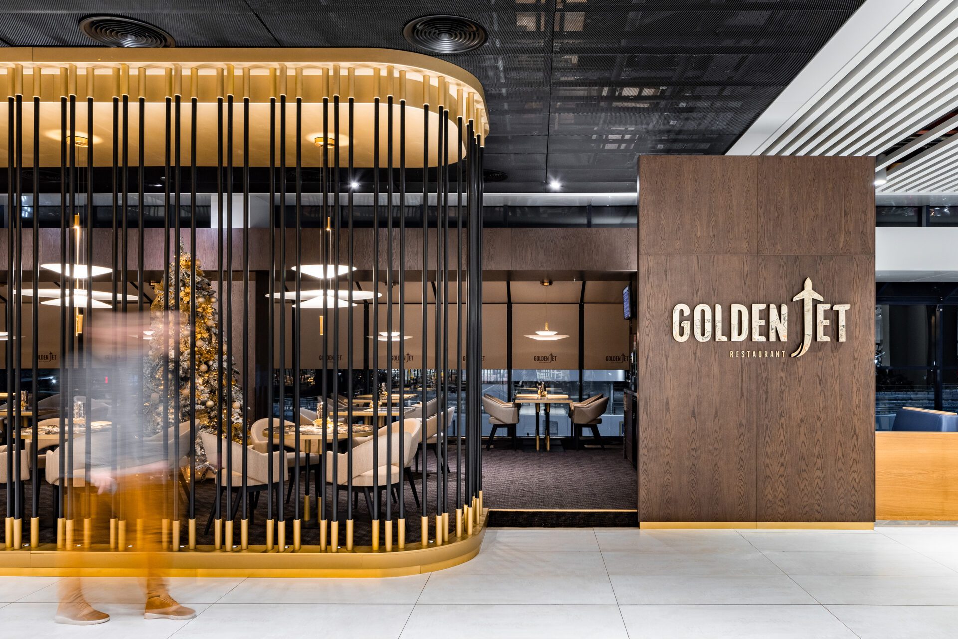 At the same level, Golden Jet Restaurant offers passengers a more private and refined dining experience. Elevated on a podium and separated from the main flow of passengers by a decorative metal façade, the restaurant exudes elegance with its warm color palette of wood, marble, and brass accents. Panoramic windows provide views of the surrounding airport area, while the open bar area at the entrance adds a casual touch to the sophisticated setting. Both the Golden Jet Restaurant and Aircafe are located on the second floor, offering a range of dining options that cater to different needs and moods within the same space.