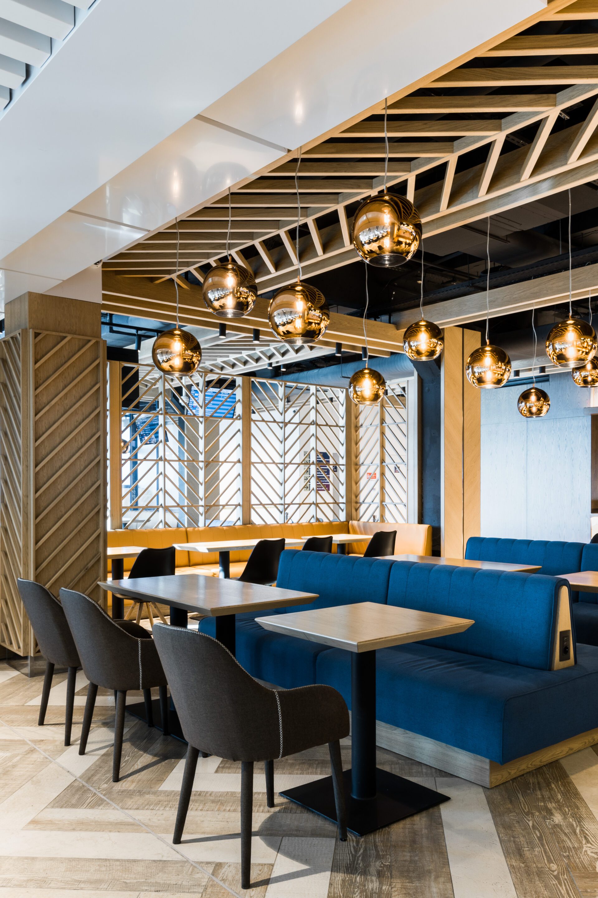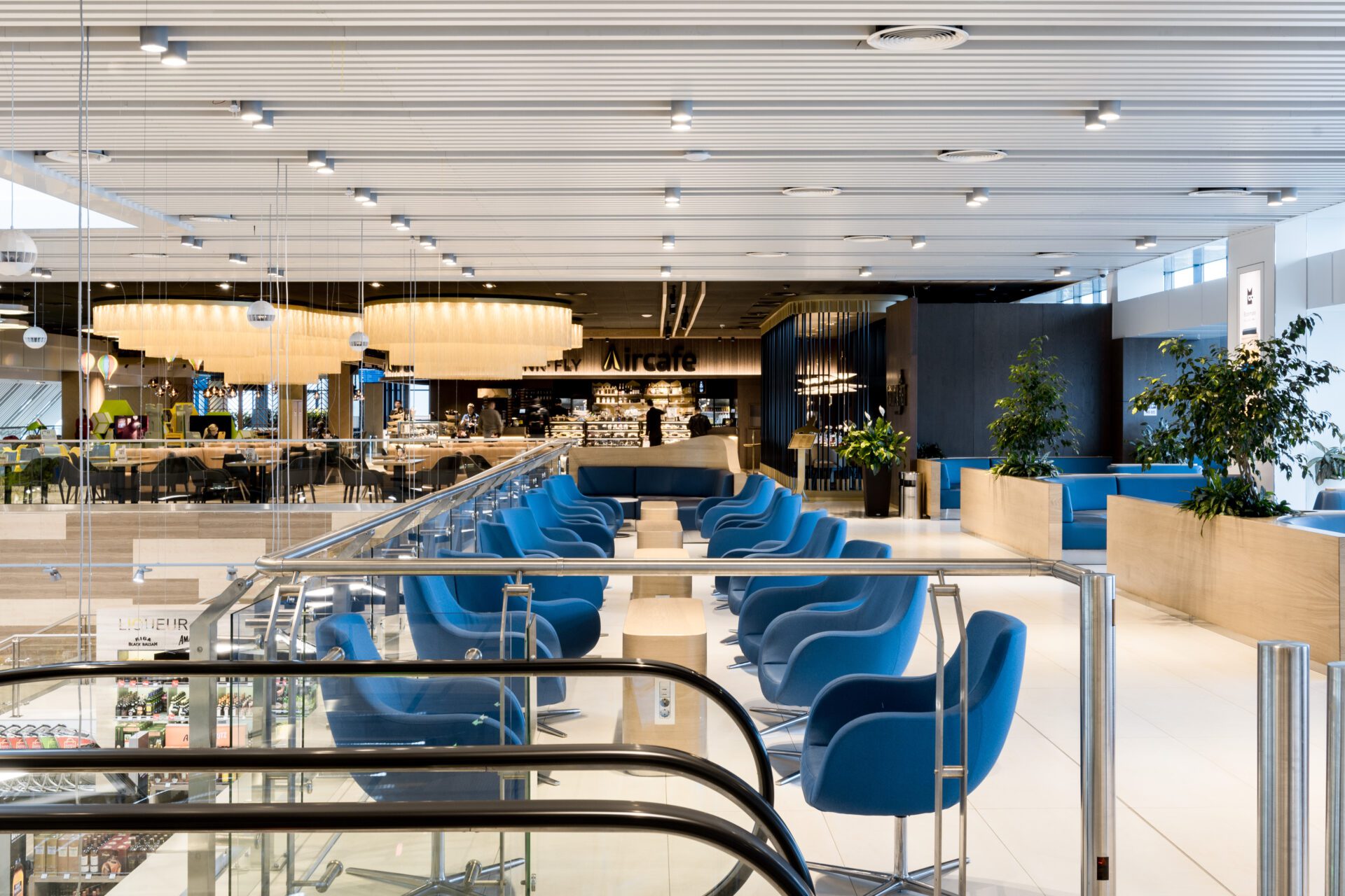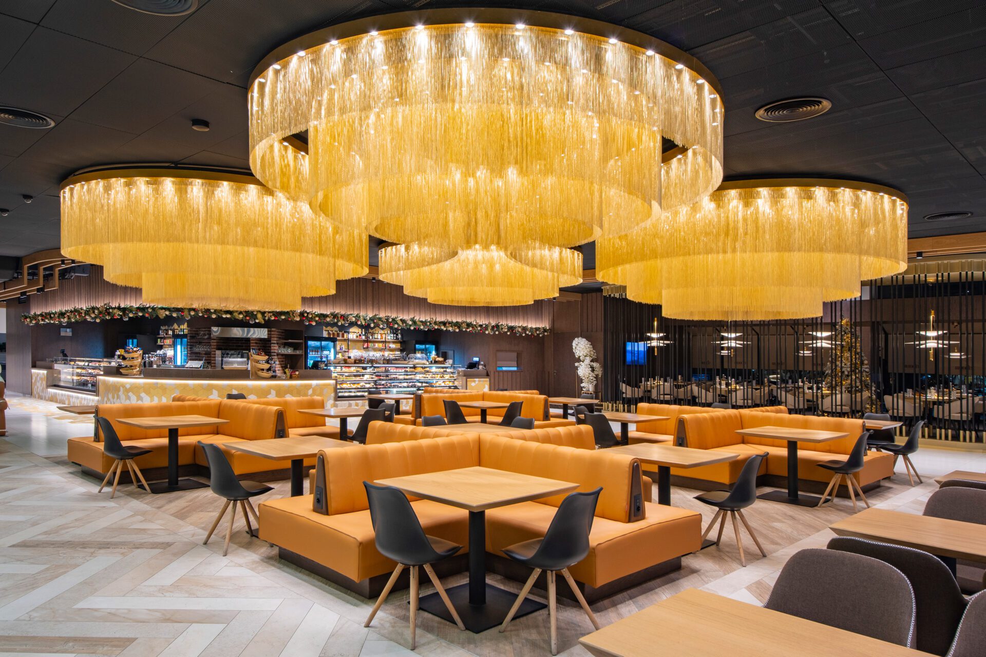 The Aircafe, located on the second floor of the departure hall, offers a dynamic food-court experience with quick-service cafés, an ice cream station, and a children’s playground. At the heart of the space is a bar area, designed for efficient service, with four cash registers and a mini-bakery to cater to a large volume of passengers. A dramatic light installation acts as a visual focal point, drawing attention from both the first and second floors. The installation consists of brass-painted aluminum chains, suspended from a central box, creating an airy, ephemeral effect. Measuring 16m × 16m and weighing 1.5 tons, it adds a striking visual element to the space.