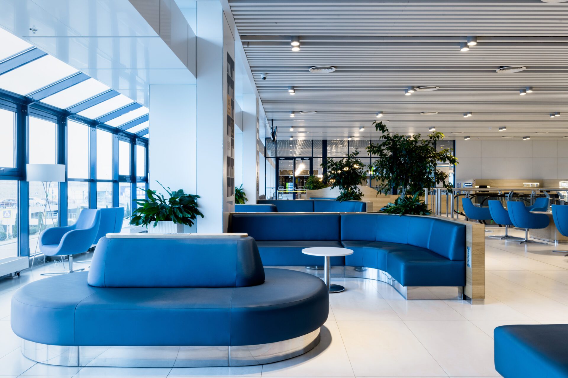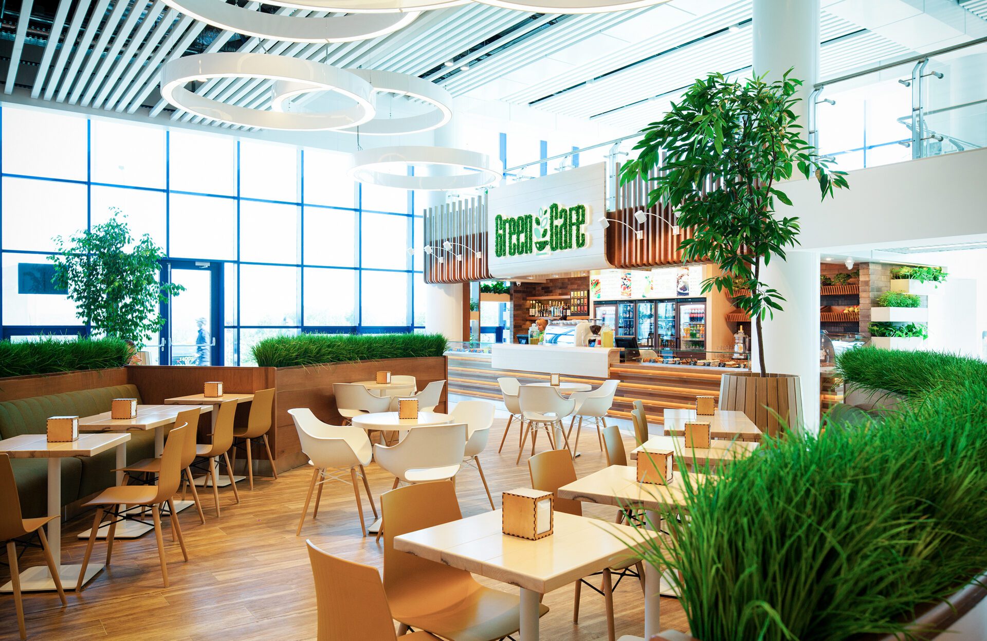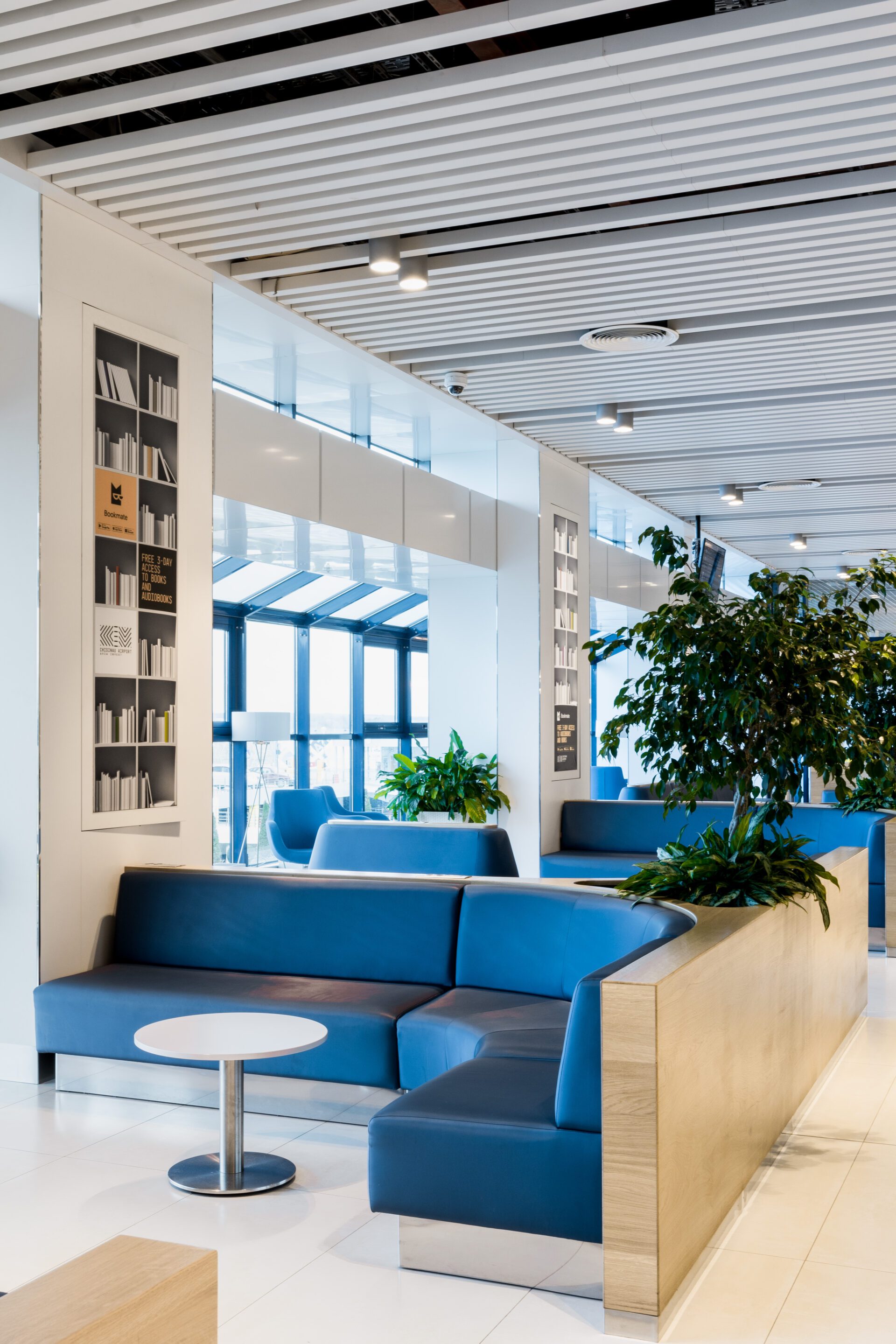The design of Chisinau International Airport focuses on creating distinct and elegant spaces that meet the diverse needs of passengers, seamlessly blending functionality with comfort and sophistication. Green tones are prominently featured throughout the airport, fostering a calming atmosphere that extends from the seating areas in the departure zone to the Green Cafe in the arrival zone. Blue accents are introduced in the upper-floor waiting zone, enhancing the spatial differentiation.