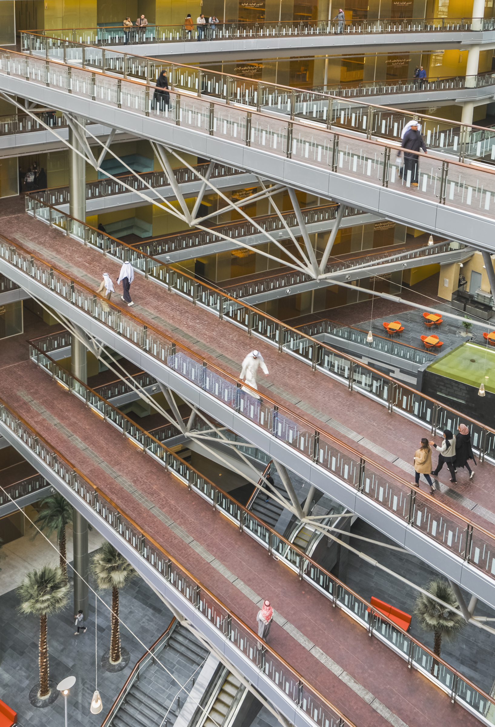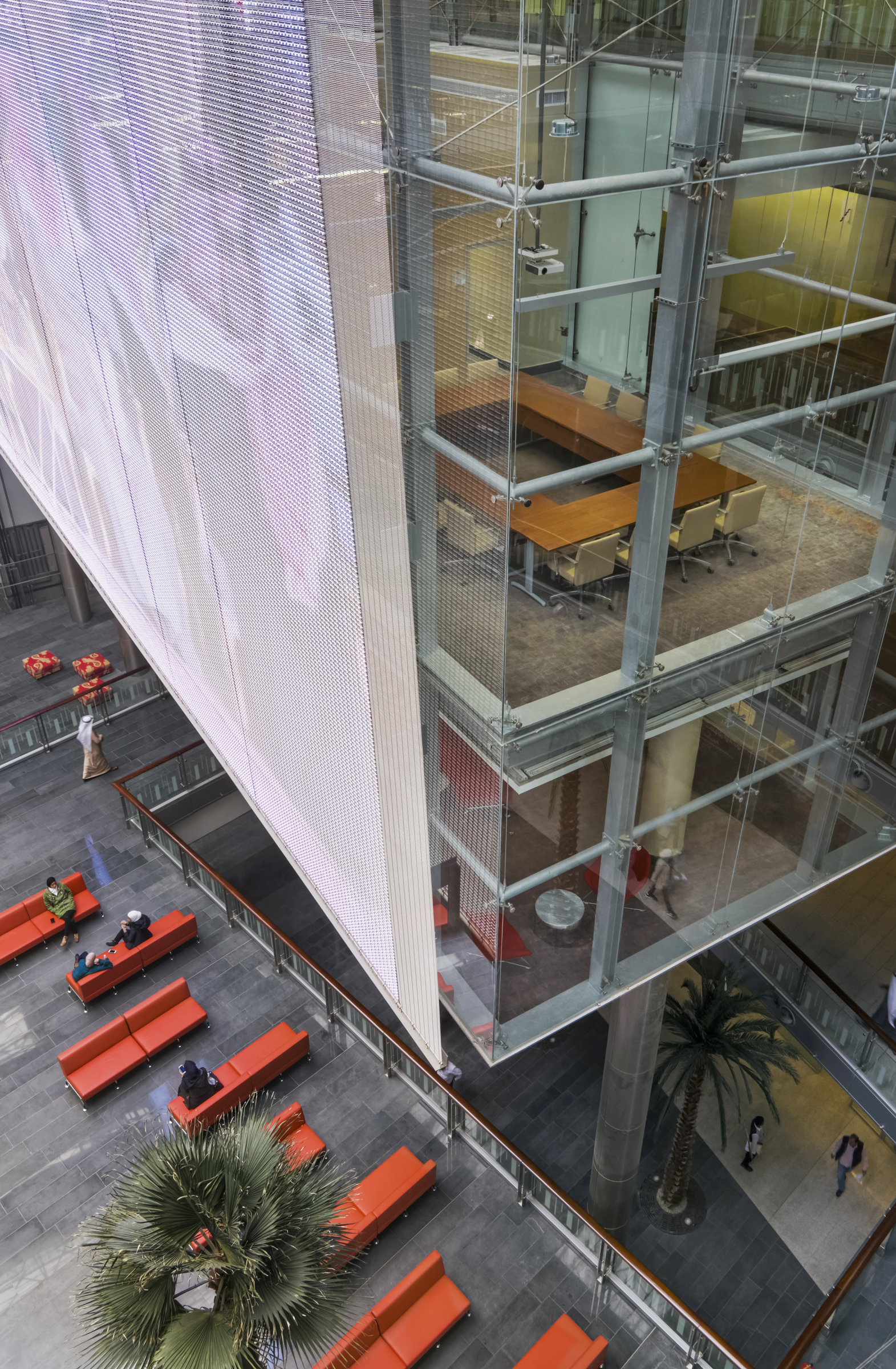 A series of hanging stairs, bridges and open decks crisscross the atrium and connect the multiple office levels and north and south towers. A grand stair and escalator flank a striking, stepped water feature that leads to the main lobby where a water wall directs visitors to the auditorium. The graceful, glass-edged circulation paths embody and promote the ministry’s commitment to open and accessible service for the citizens of Kuwait.