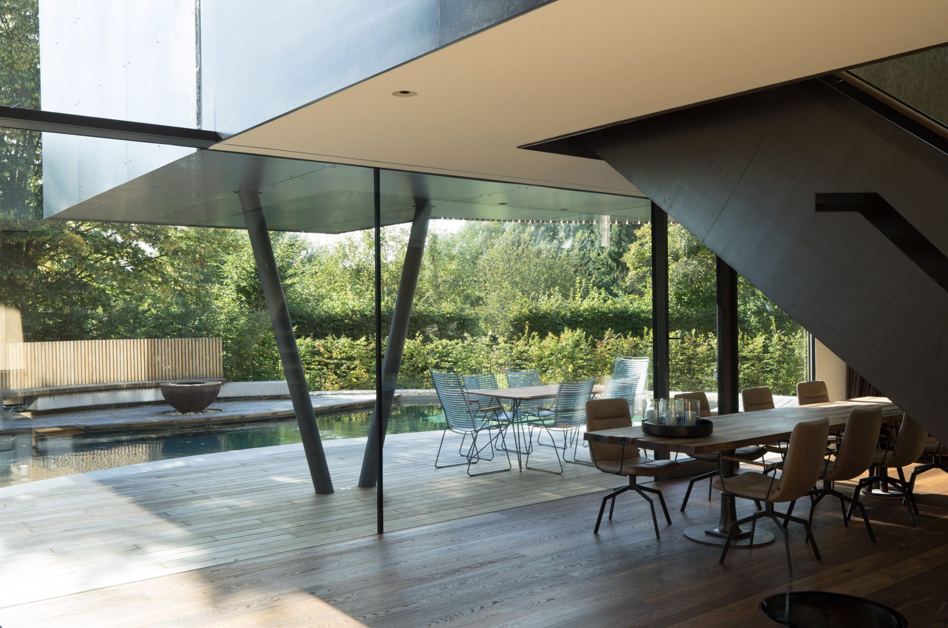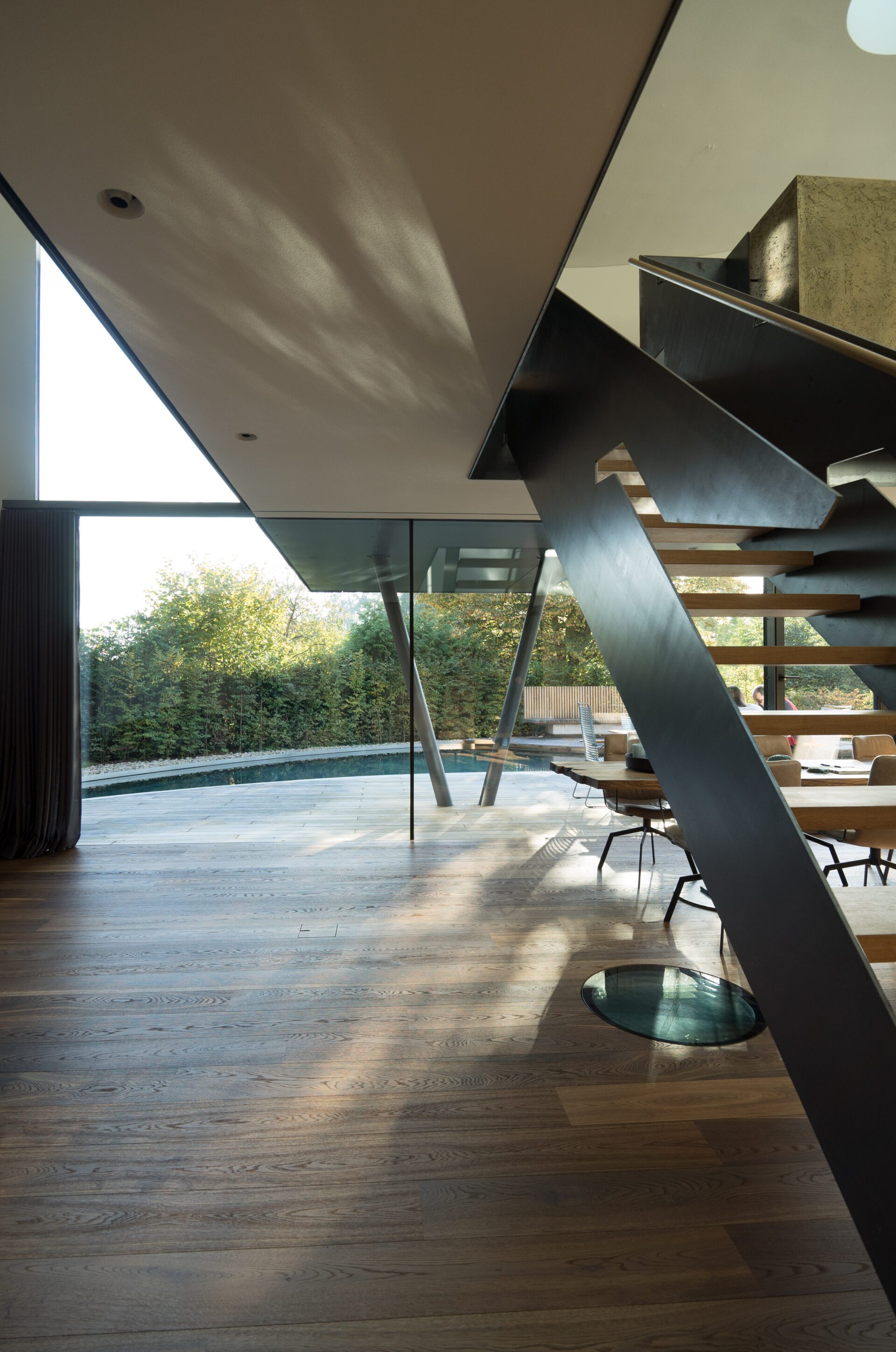 The living area forms the heart of the building with a high, open-air space and a dynamically designed staircase made of steel. The functional areas are arranged around this air space as freely formed architectural elements.