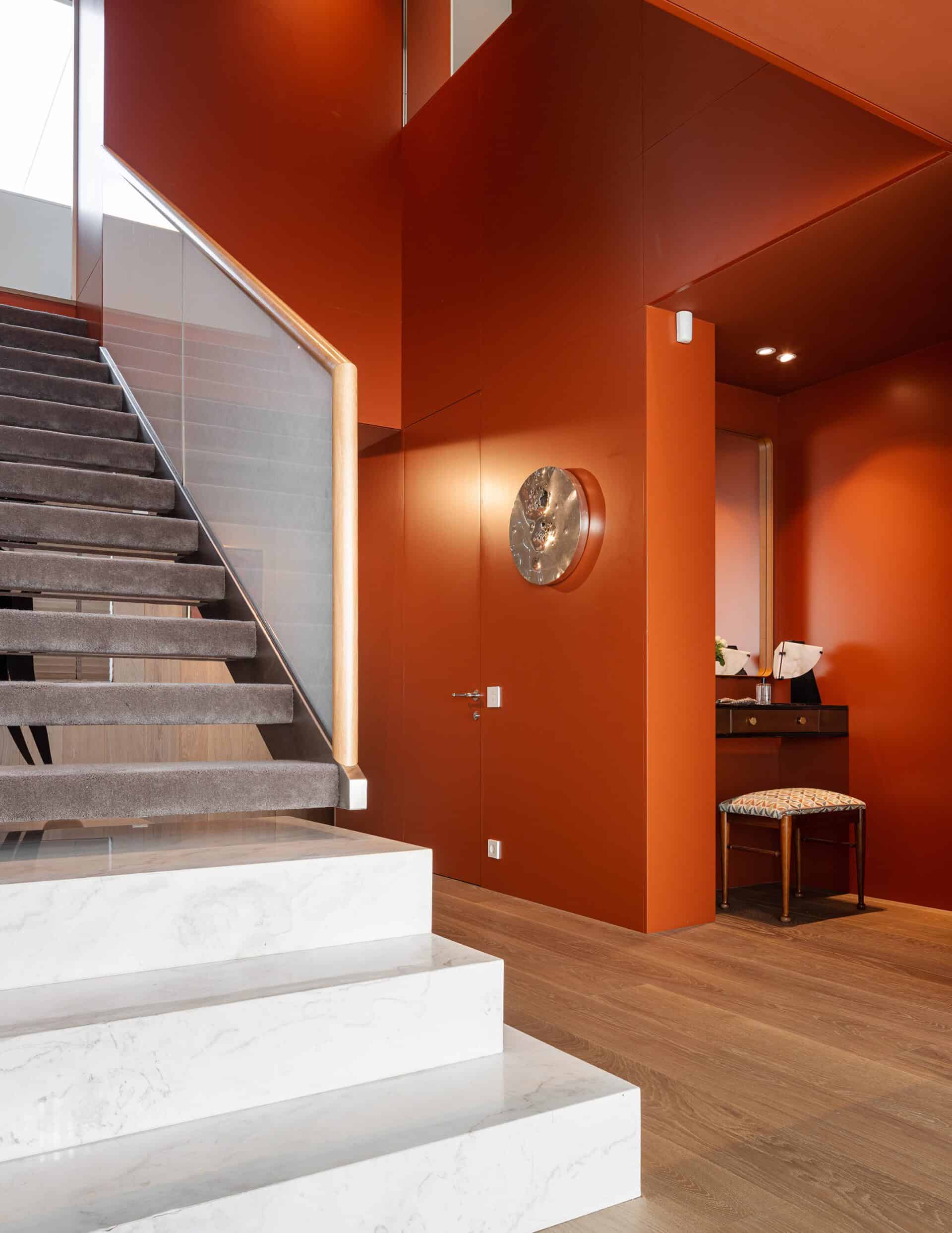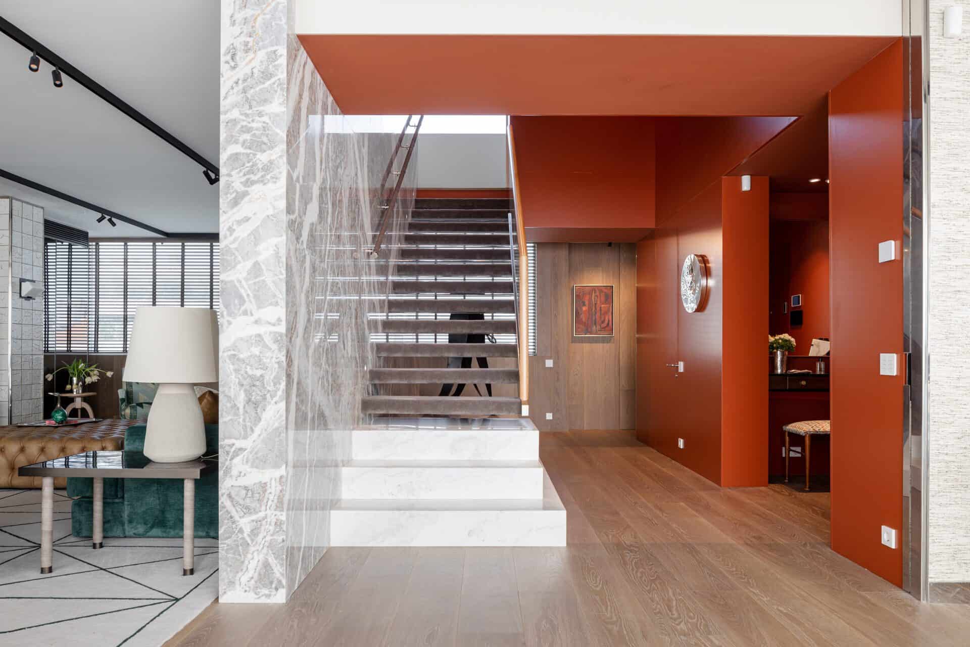 To complement the sea view, the design used a light and calming color palette. Lacquered carpentry in soft tones contrasts beautifully with the dark wood flooring, grounding the space and providing a backdrop for the art pieces. Key elements of the design, such as the striking orange entrance and the dramatic double-height staircase, create an immediate visual impact upon entering the apartment. These bold decisions help set the tone for the interior, which combines simplicity with subtle complexity. The use of varied materials, such as Fiori de Pesco marble on the stairs, black oak, and handcrafted tiles in the living room, creates a sense of movement and texture while maintaining harmony between spaces.