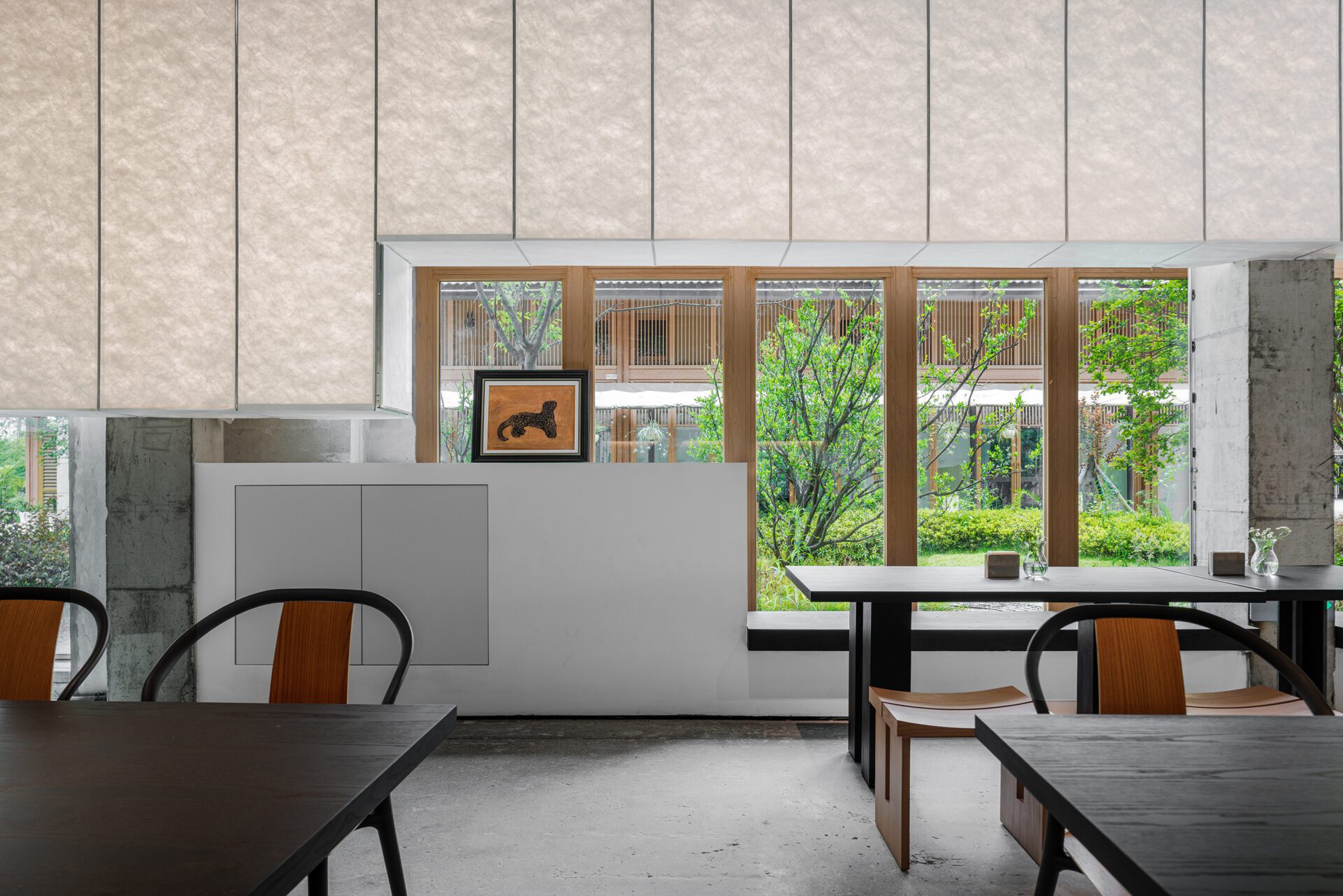The long scrolls installed carry different functions. In addition to the exhibition wall, a small display platform is also set up above the low wall in the dining section, allowing the two sides of the space to be both separated and intertwined, and the canteen section responds more to light. Tyvek softens the light and limits the penetration of the outdoor environment. The white wall stretches out to form the cabinets and seating in the restaurant, which is integrated with the Tyvek light box hanging from the window.