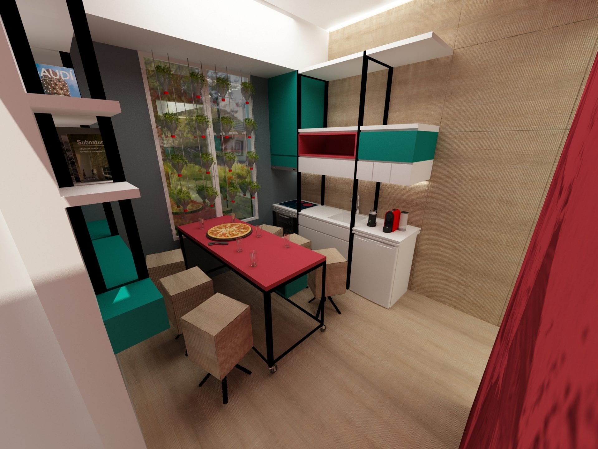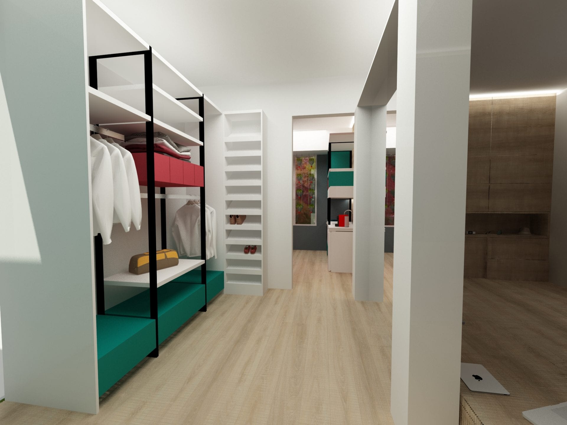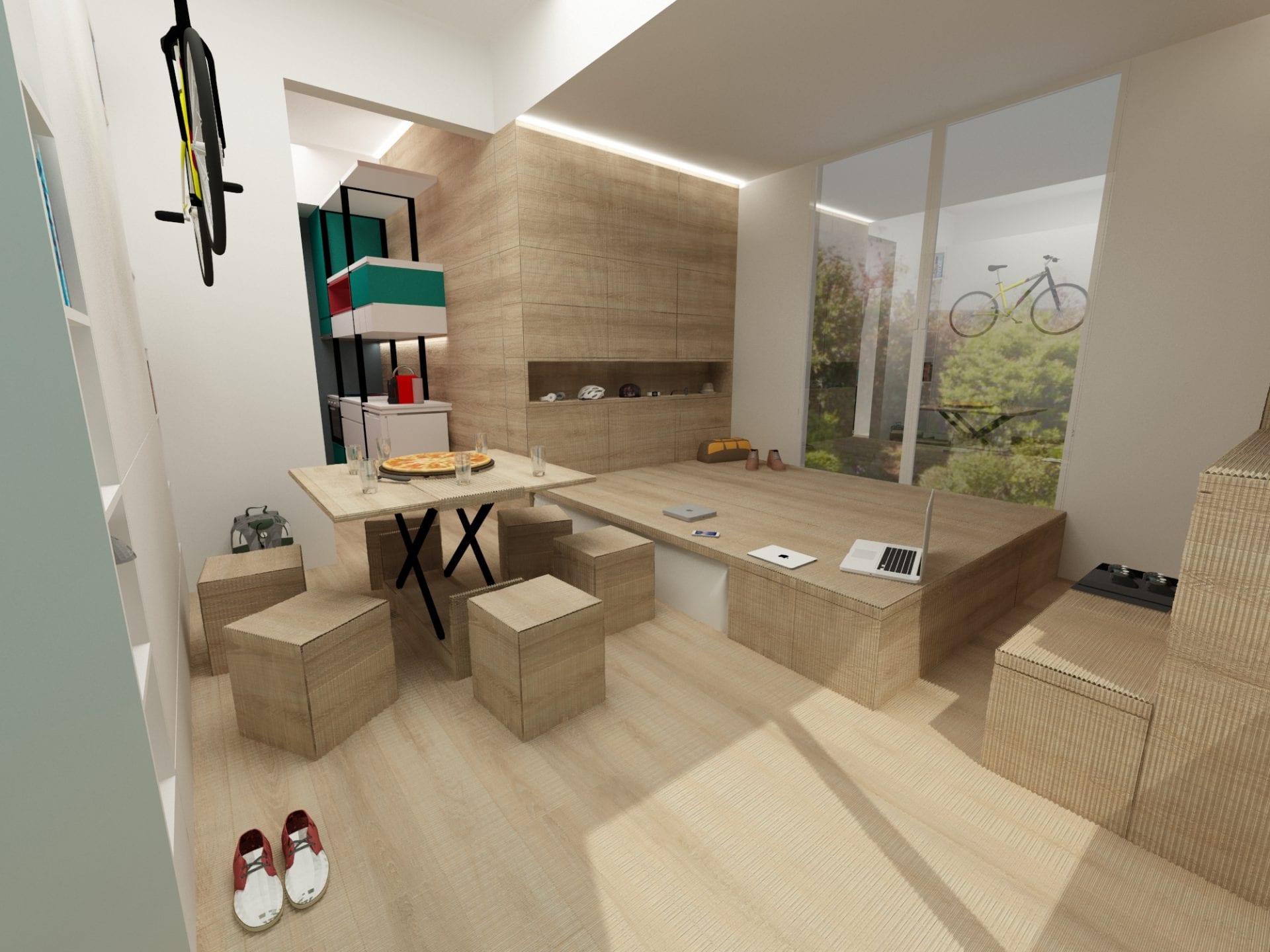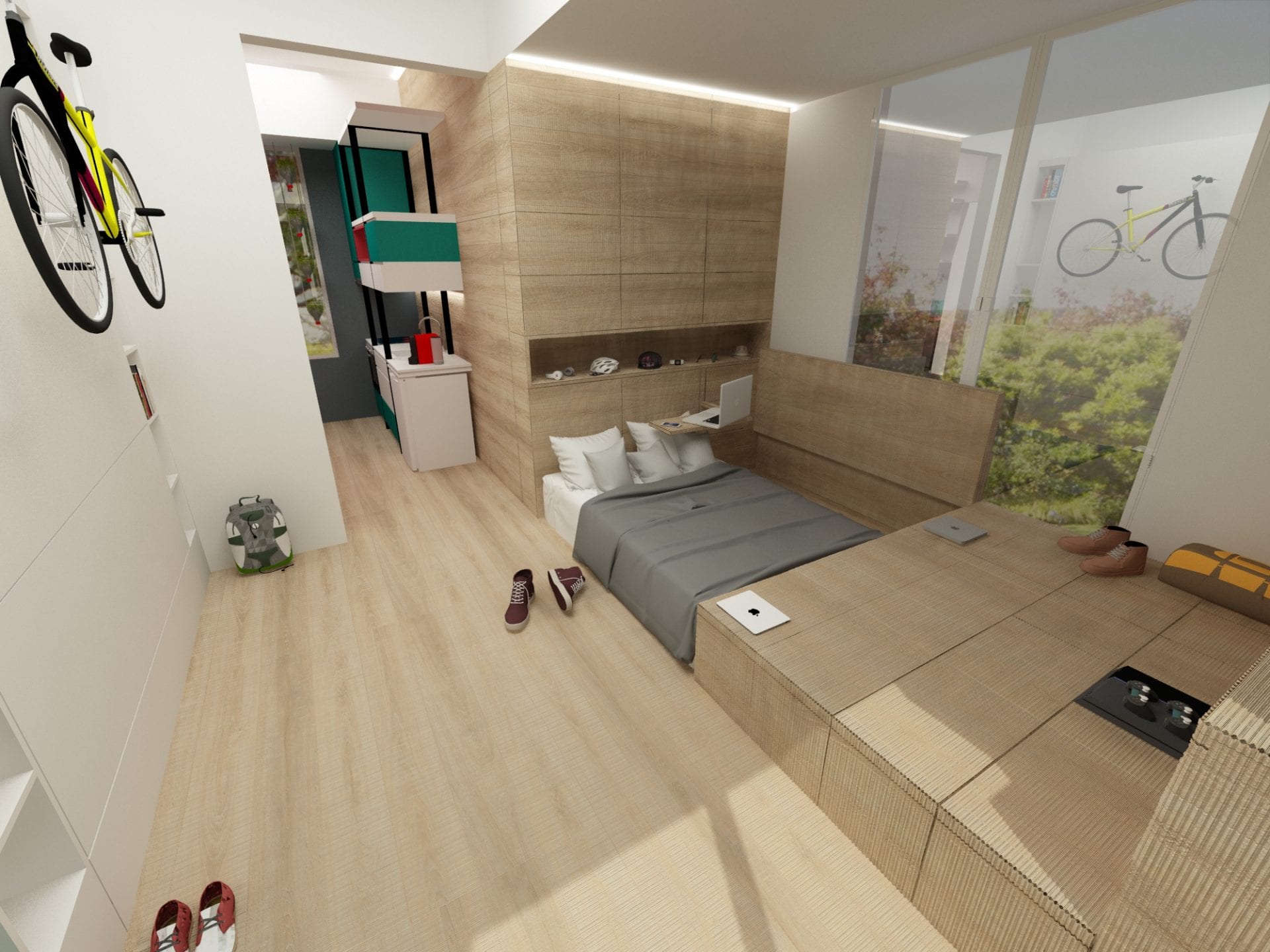 The millennial generation needs a live-work-play environment. This 35 sqm two-room flat was projected to satisfy multiple daily activities of a male user for about 28 years old. We access from outside through the kitchen / remote working area, where a table mobile and adjustable is the main element, giving the area great adaptability. Annexed, we find a versatile room with a built-in furniture system incorporated. The spotlight piece is a hollow box that contains a modular platform with an electronic mechanism. The sidewalls of the structure accommodate multipurpose modules. As independent pieces, the removable modules from both the walls and the floor can adapt to versatile furniture and saving solutions. In front of the platform, there is a closet hidden behind a movable false wall. This panel can be used as a library with drawers and shelves, on one side, and a large mirror that takes photos; and a folding armchair on the other side. By separating the movable wall from the closet, the hallway becomes a dressing room. Through an app, different comfort commands and sustainable resources are managed.