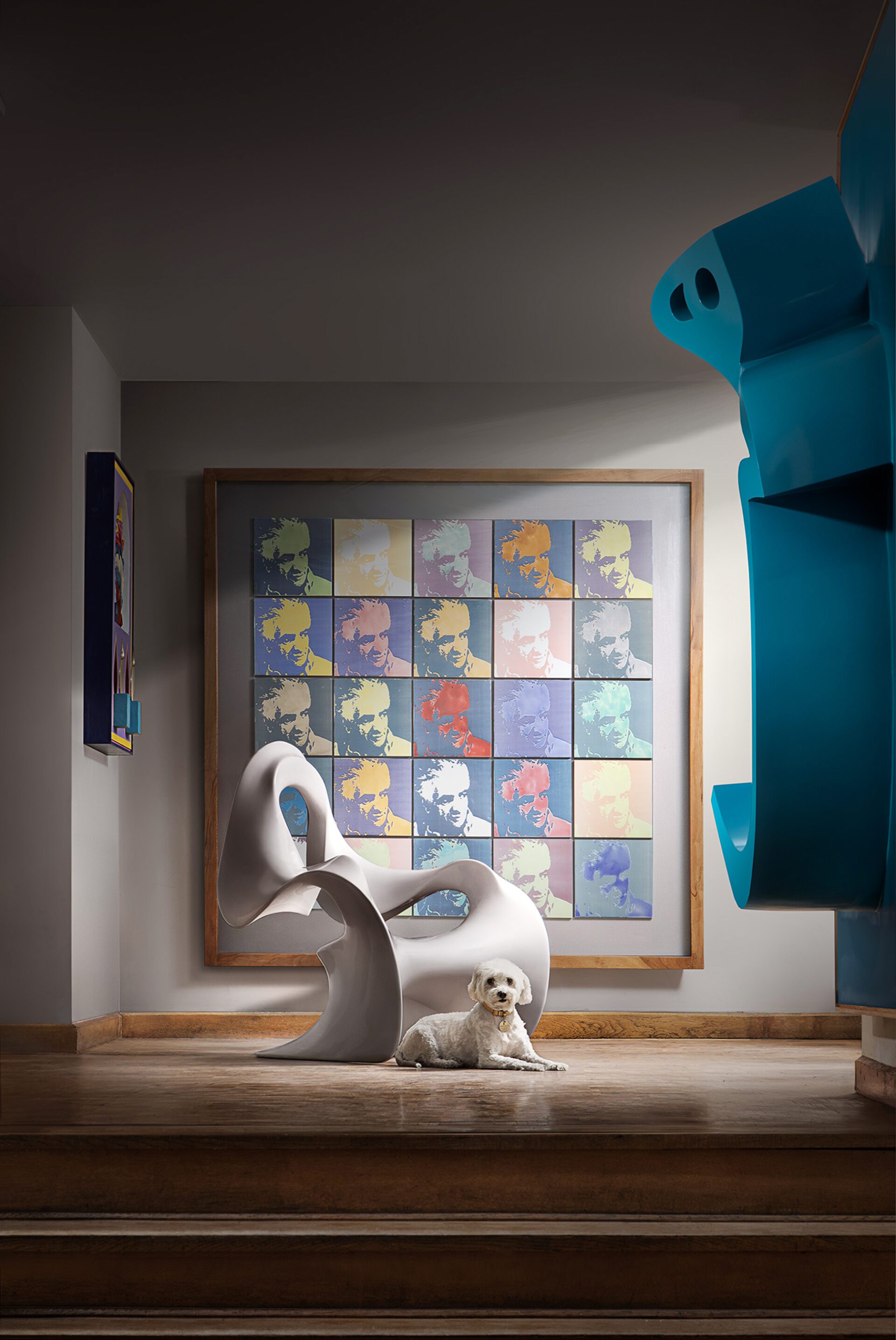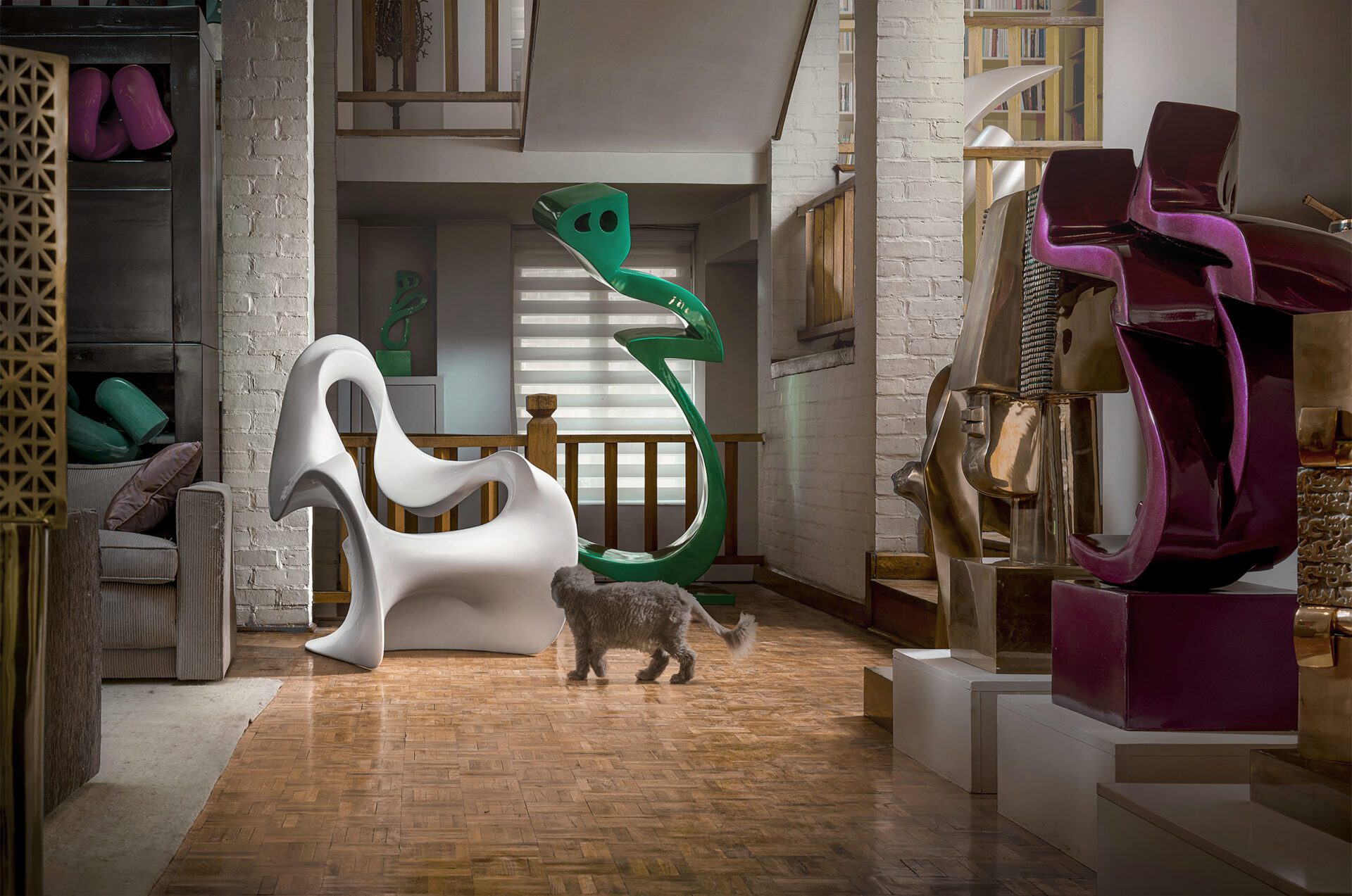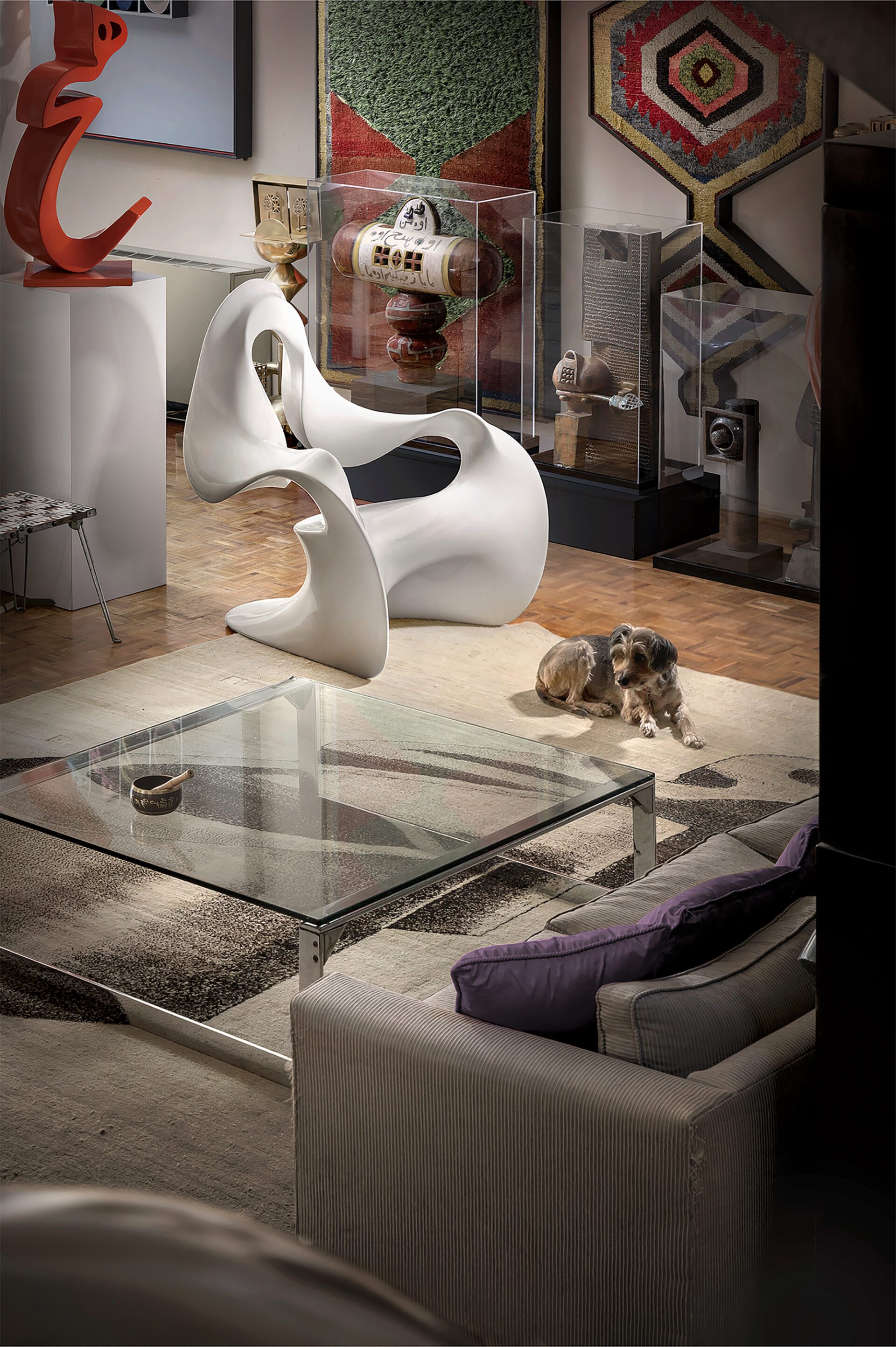 This commission is about capturing the interior of the living environment of the art figure (Parvis Tanavoli). the subject of the commission was the white armchair designed by Sa company. It is noticeable that the armchair is analogous to the sculptural pieces inside the place, and at first glance reminds Mr. Tanavoli's artworks. The aim of the photographer was to unite the product with the artistic environment and context.