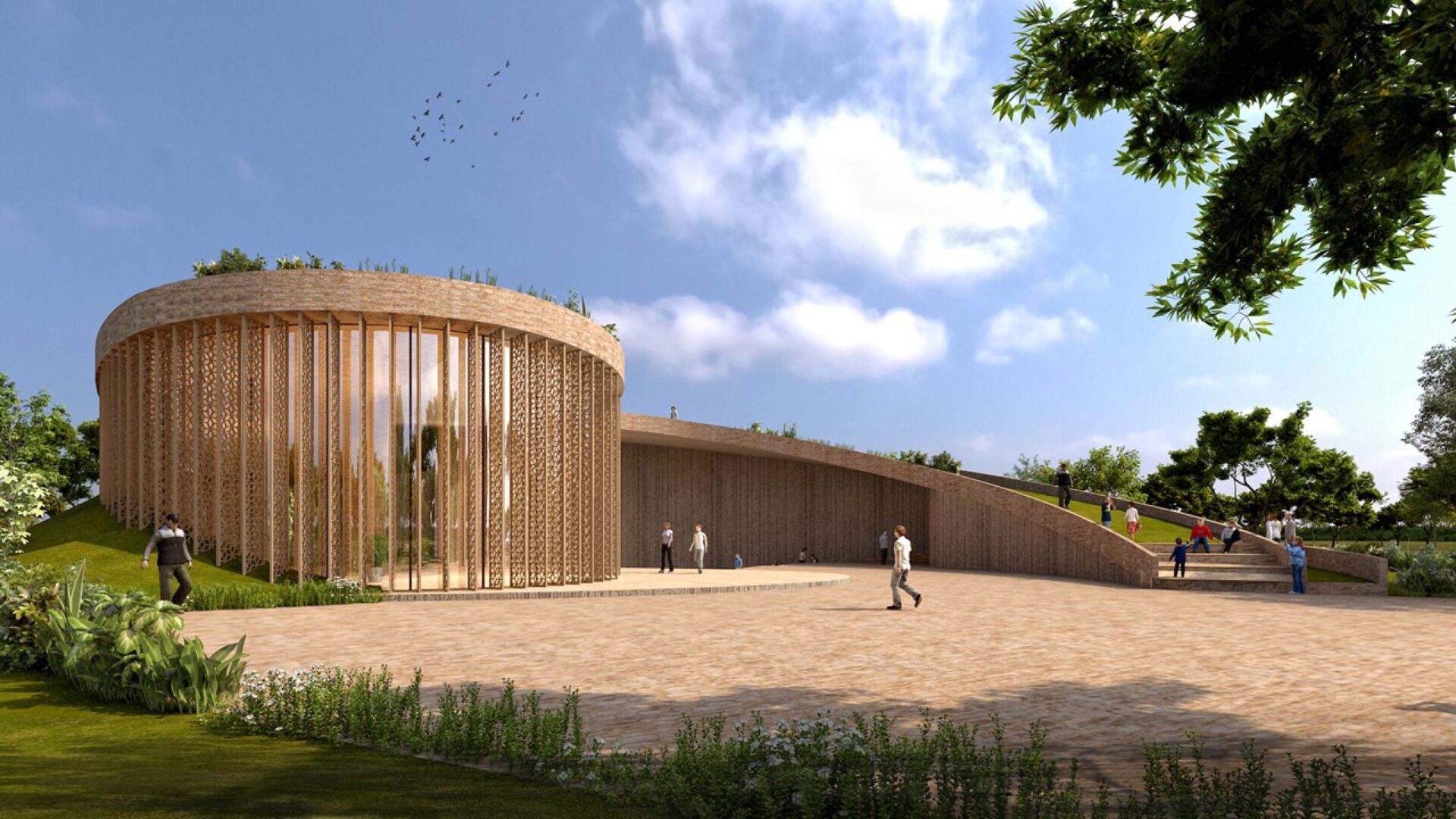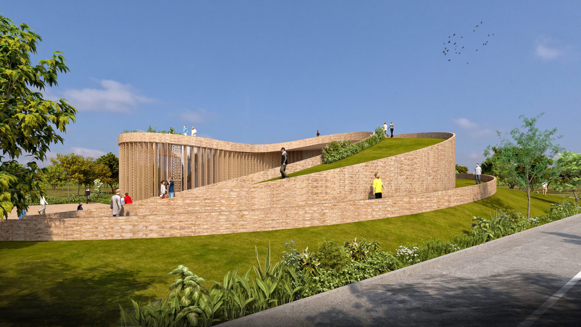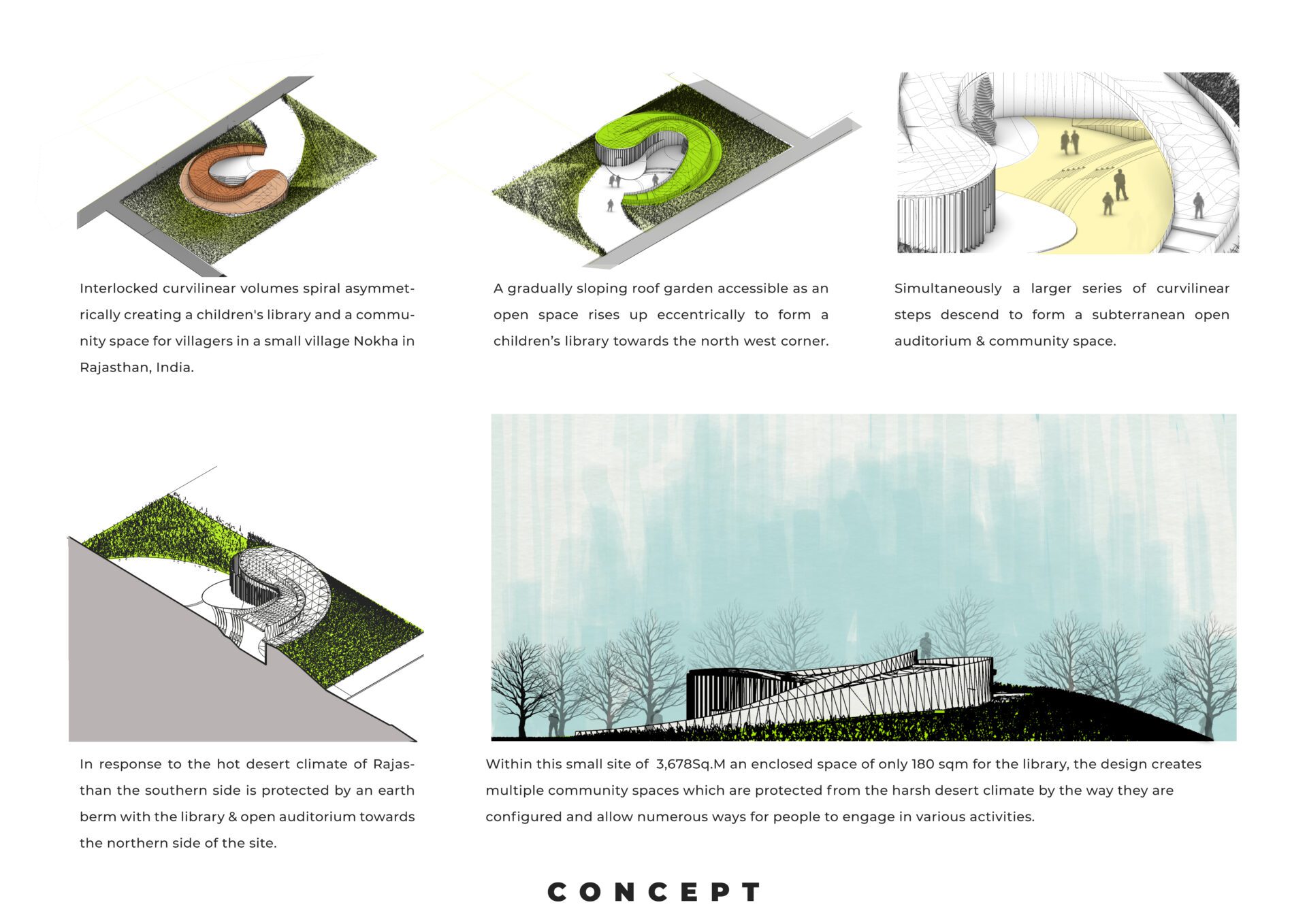 Interlocked curvilinear volumes spiral asymmetrically creating a children's library and a community space for villagers in a small village Nokha in Rajasthan, India.
