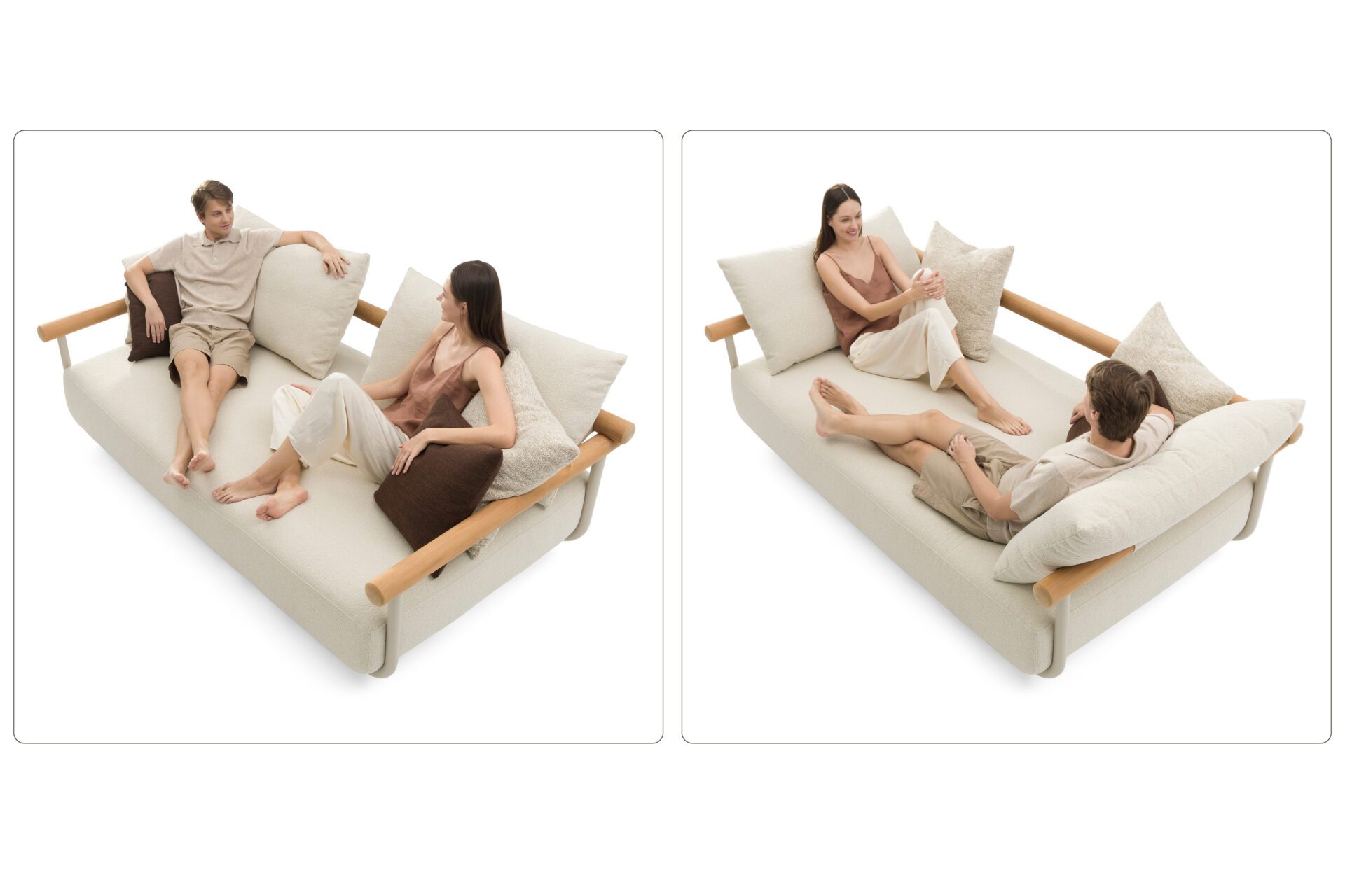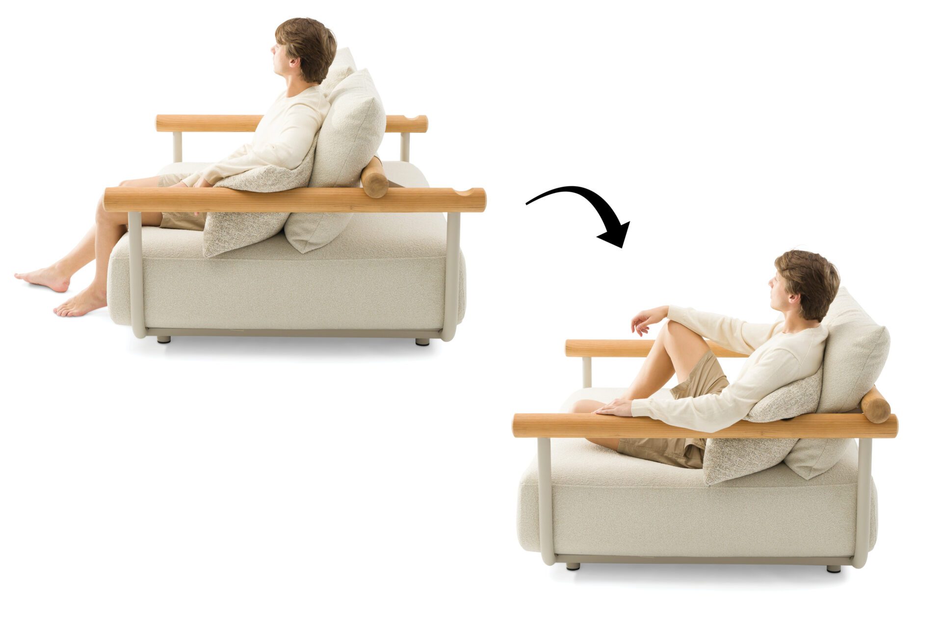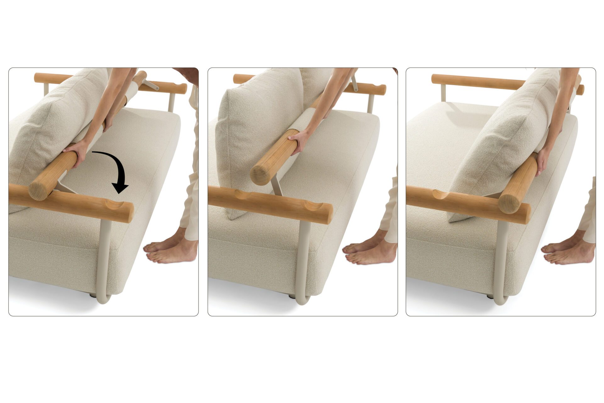 Lounge Mode – Lift the round backrest beam and slide it back. The cushions shift with it, instantly creating a deeper, more relaxed seat—perfect for reading, casual conversation, or coffee by the pool.