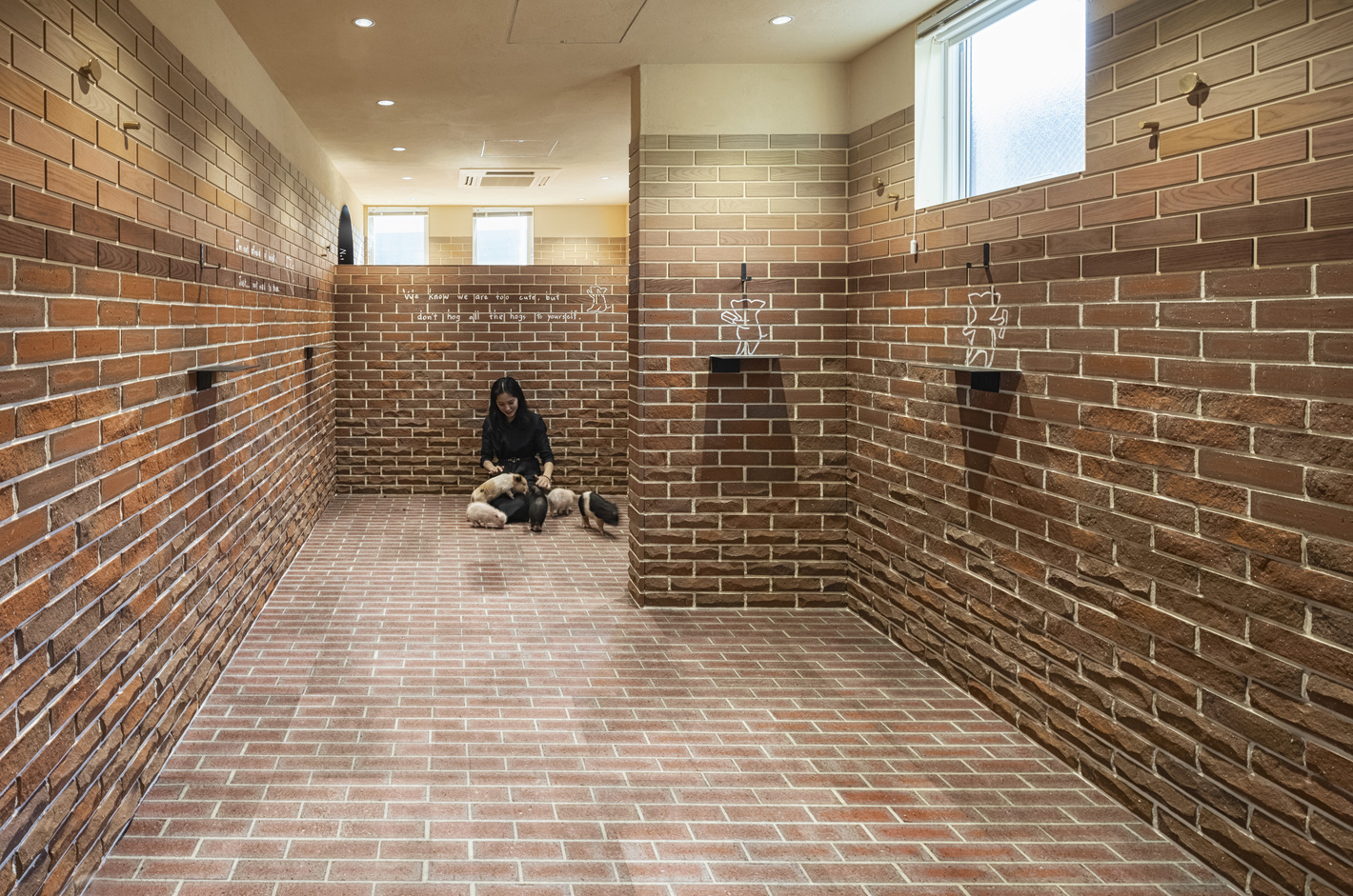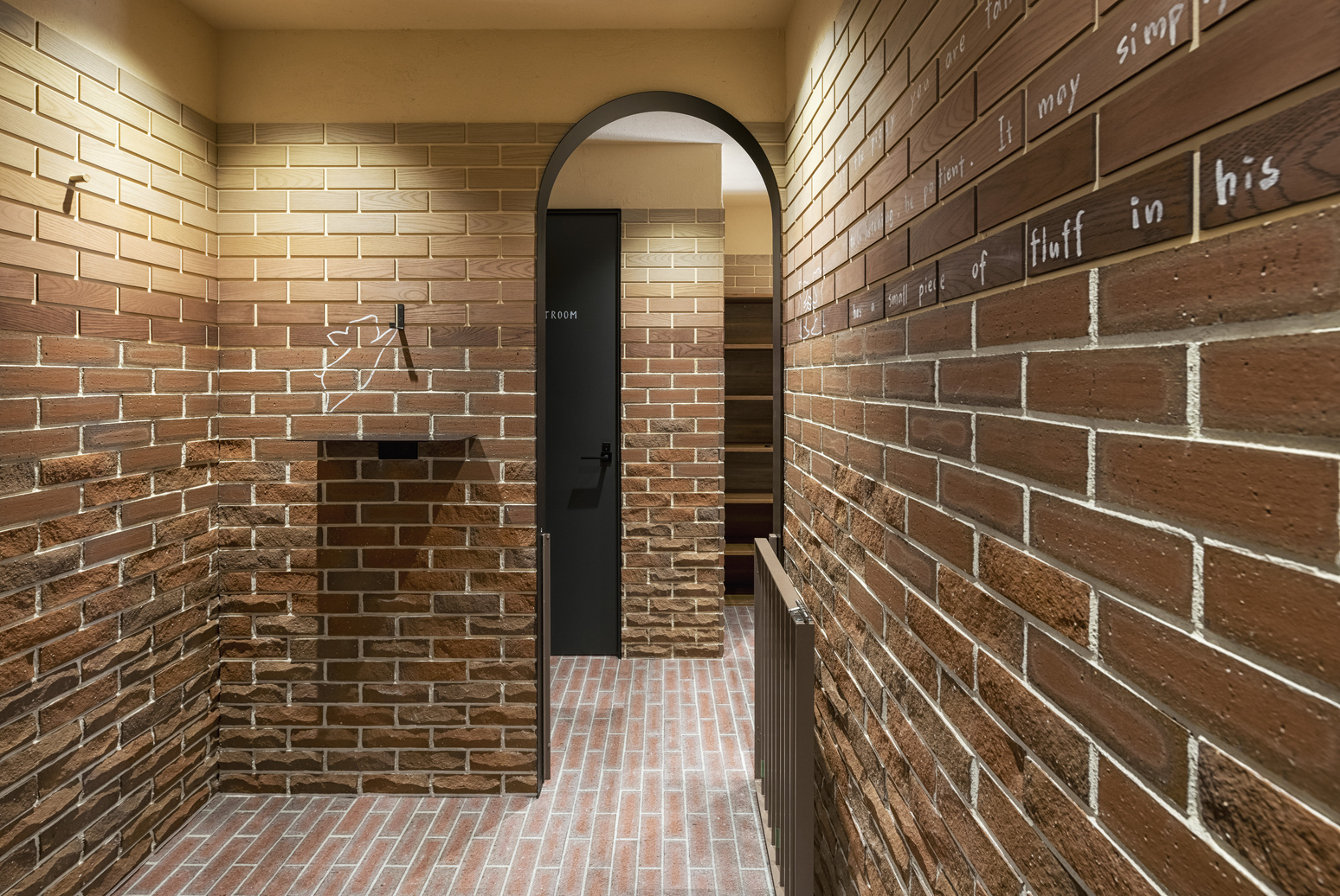 Bricks are applied from floor to the ceiling and then they change into the wood, cut in the brick size. The area from near the ceiling is a plaster finish that incorporates straw.