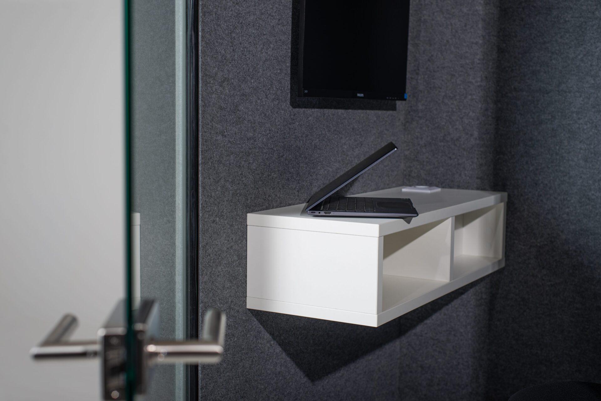 Our double layered table with power socket looks great and is also a structural element of the phone booth.