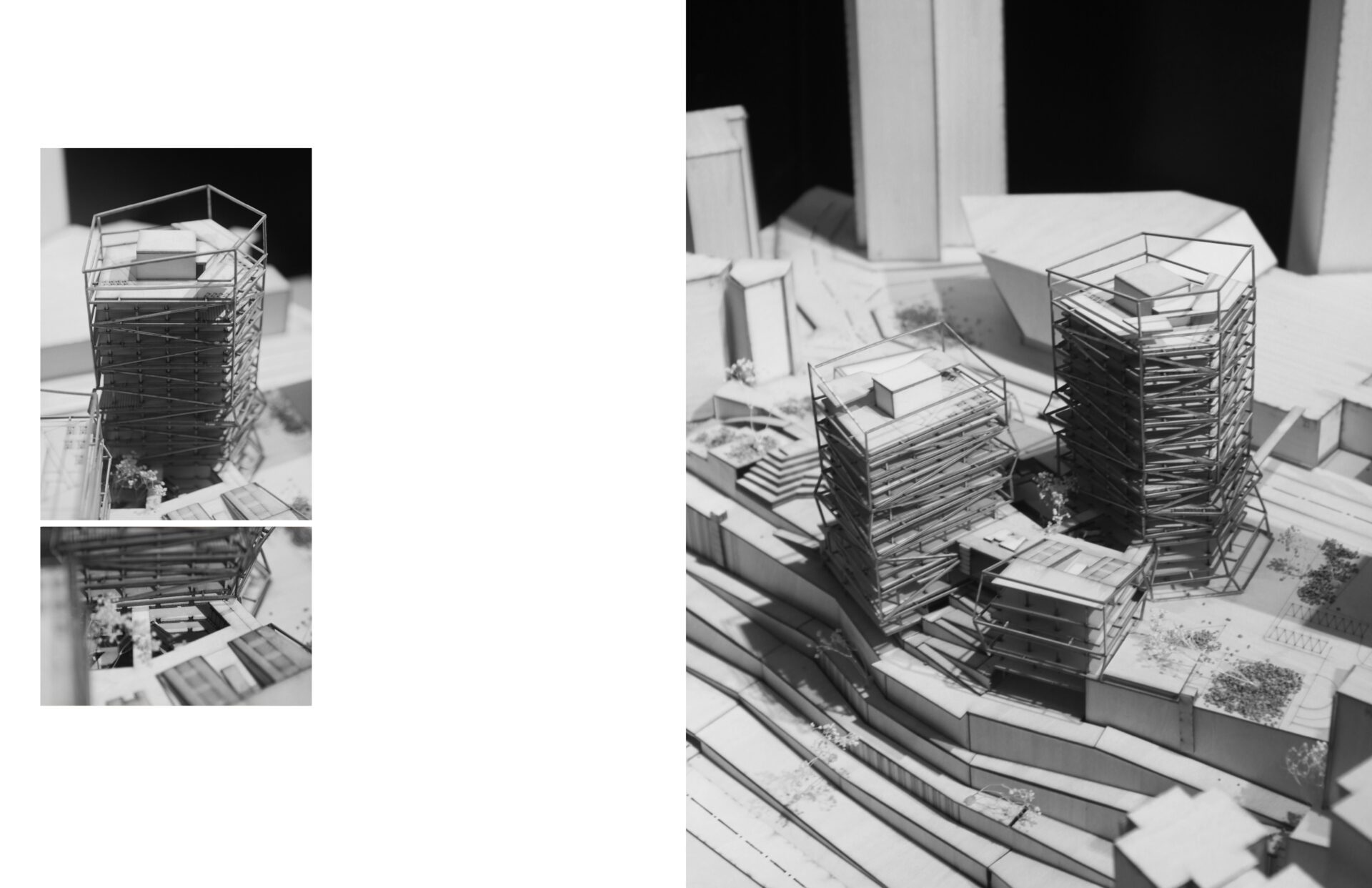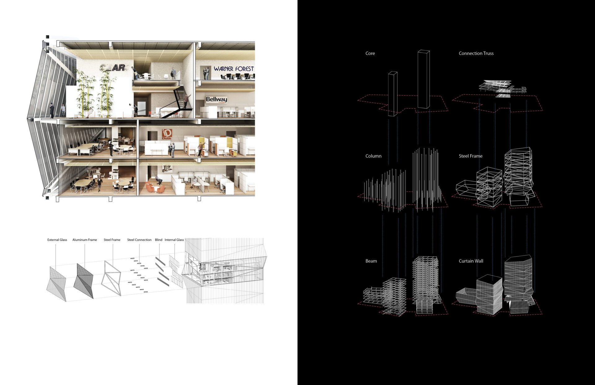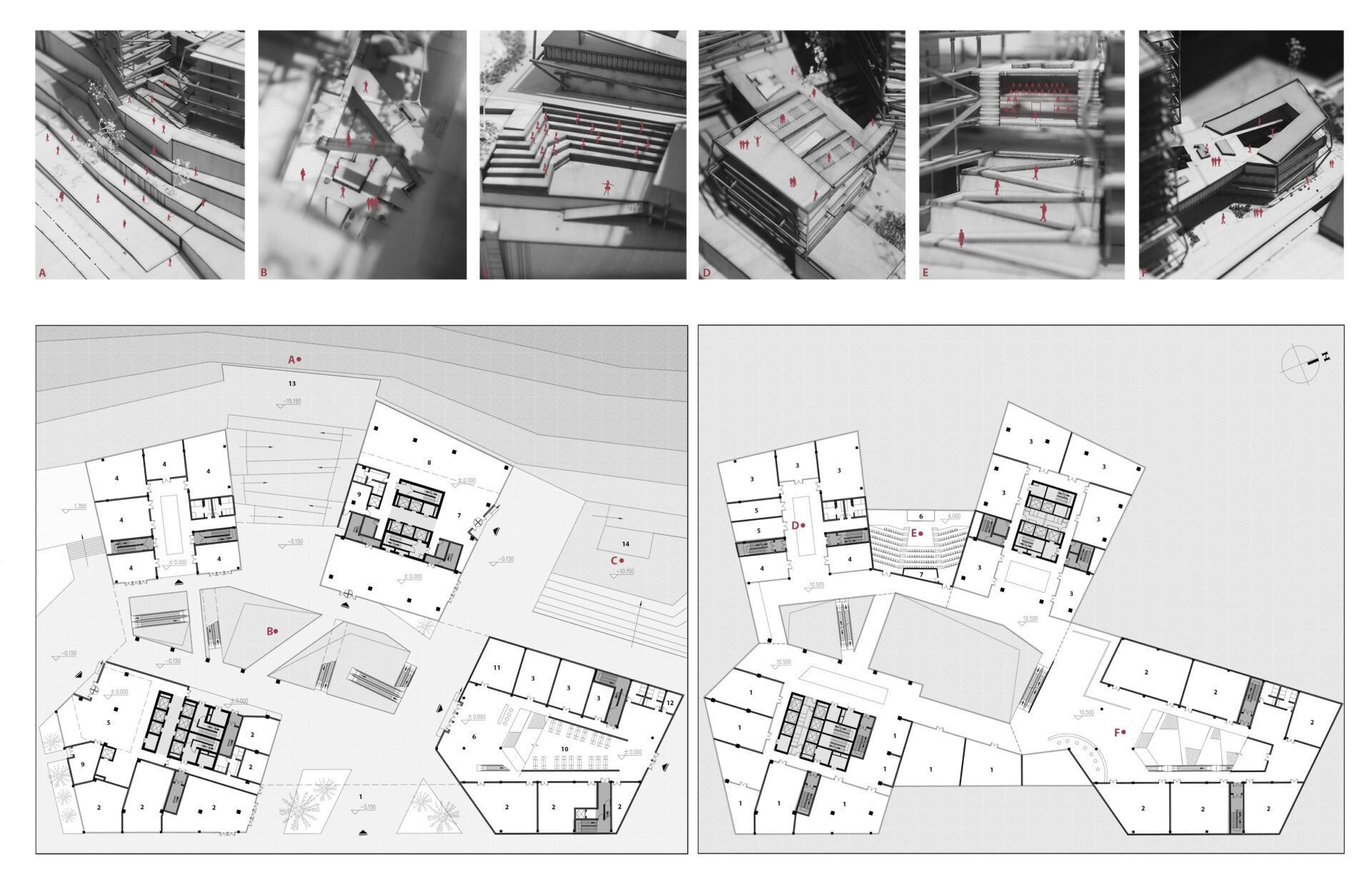 Podium: The lower levels house commercial spaces and a small exhibition hall, structured as four independent volumes linked by an underground atrium, sky corridors, and escalators.