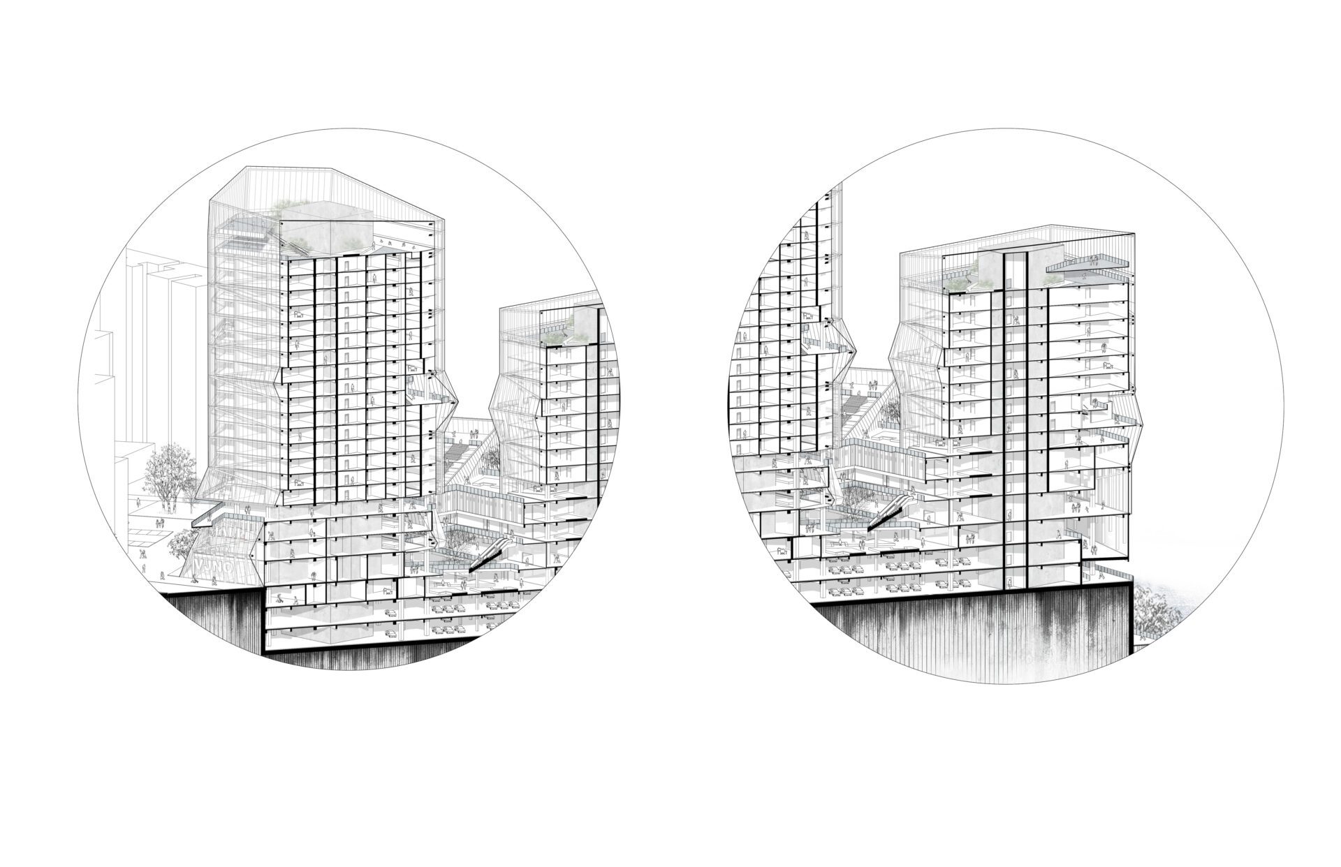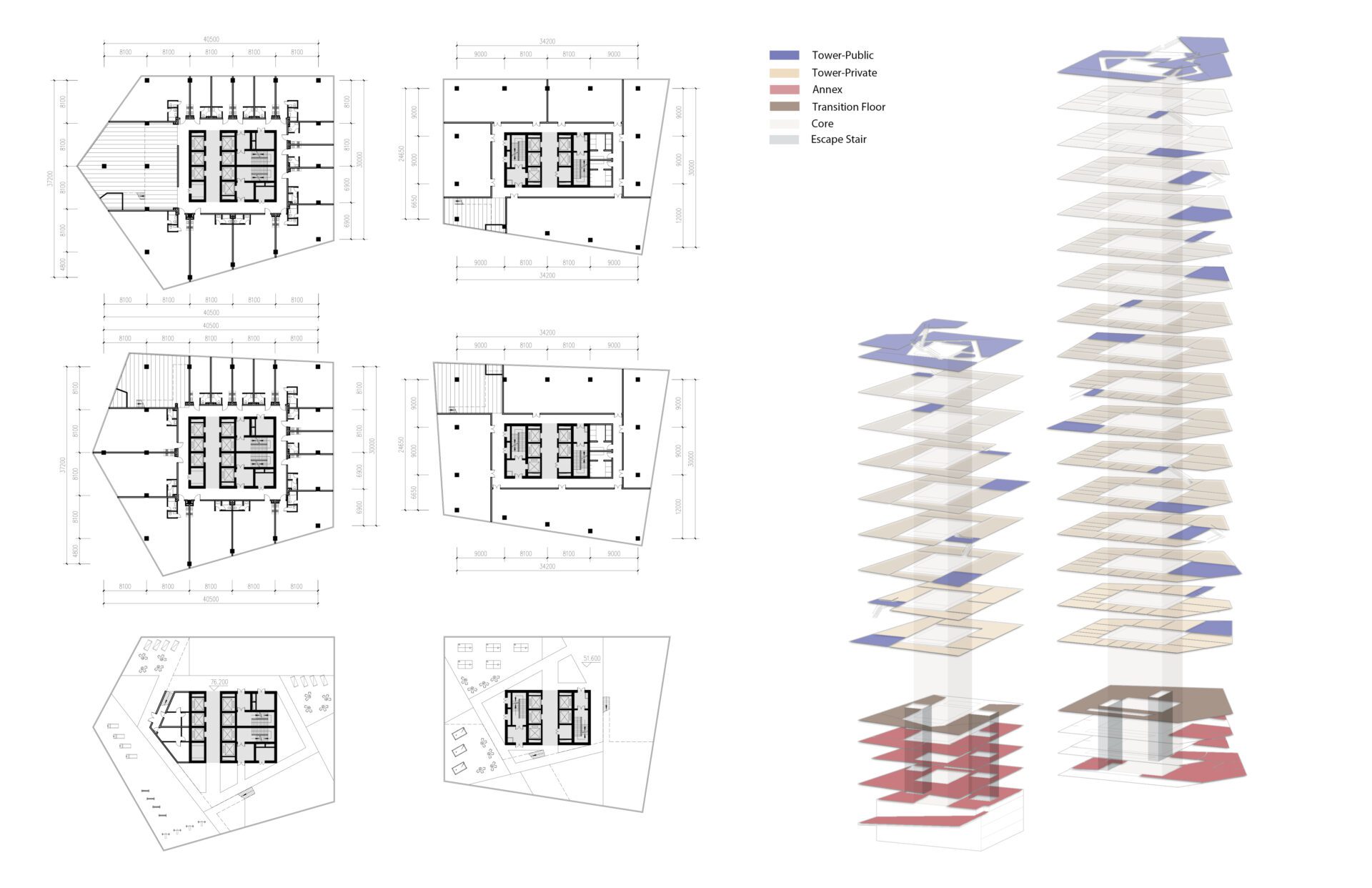 Twin Towers: The upper levels are dedicated to private residences and offices, featuring bi-level rest spaces every two floors and a rooftop swimming pool.