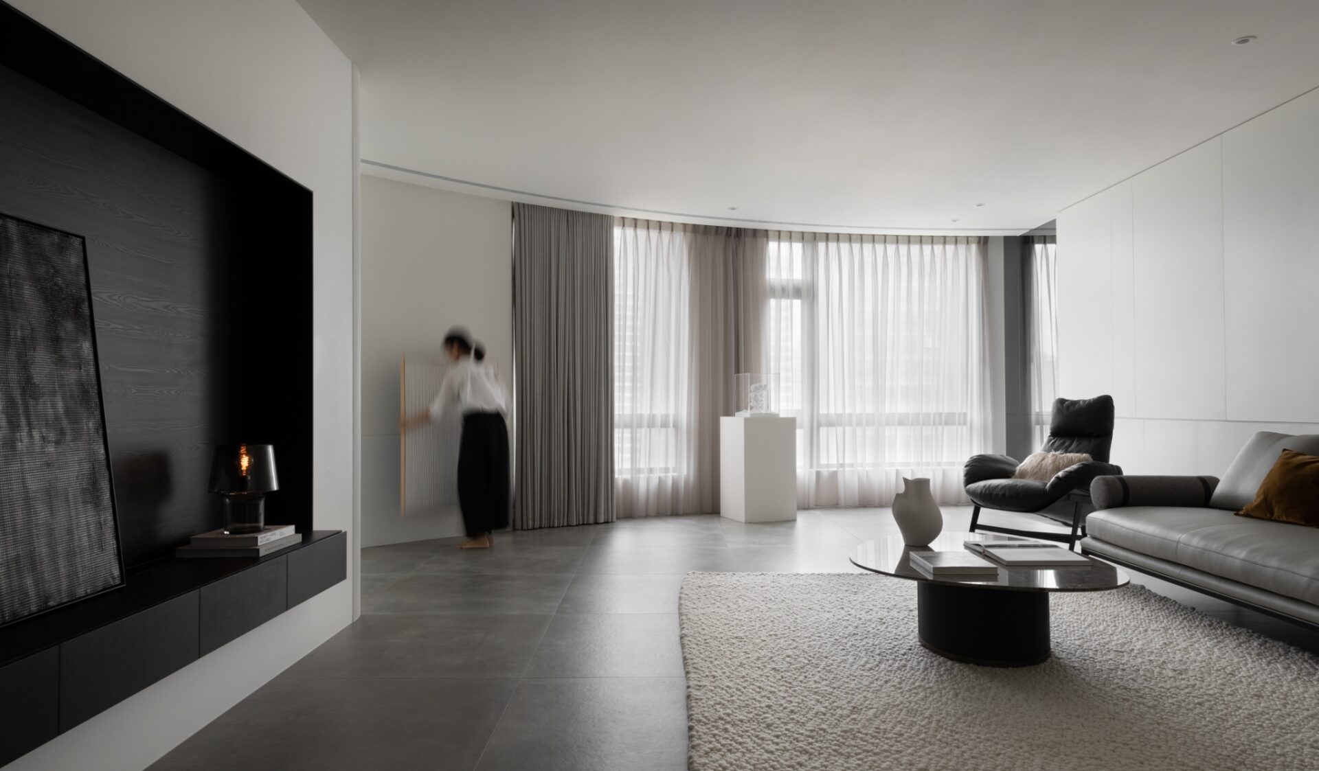 Embracing the essence of space, the concept of zeroing is employed to harmonize all through the fusion of black and white. White lines, paint, wood grain, accompanied by shades of grey and black, reveal the intangible abundance within the space, symbolizing spiritual richness. The quarter-circle structure creates suggestive dotted lines, forming entrances and corridors, enhancing flow and spaciousness. The layout evenly distributes light, reserving it for communal areas, fostering emotional warmth for the family.