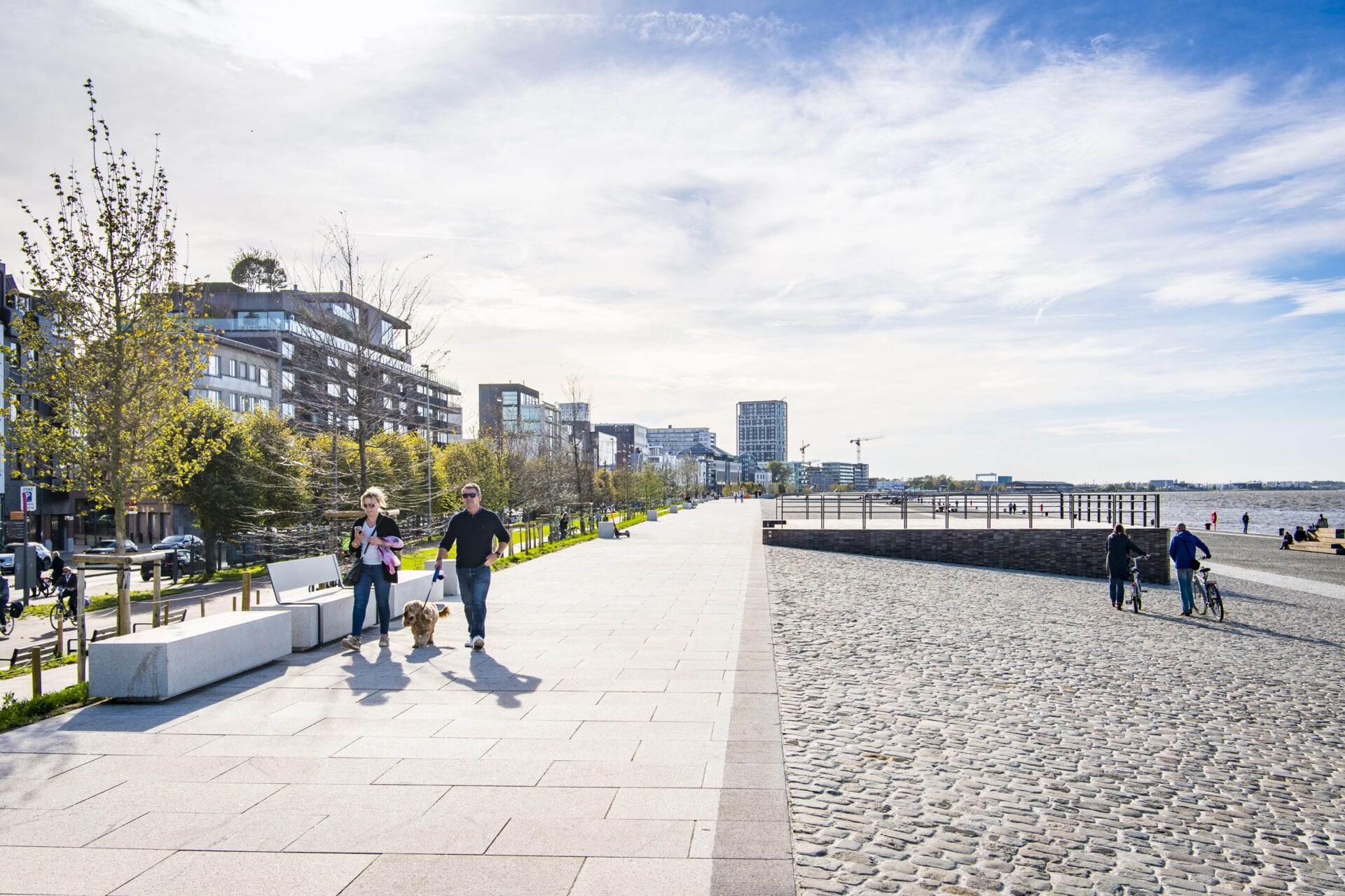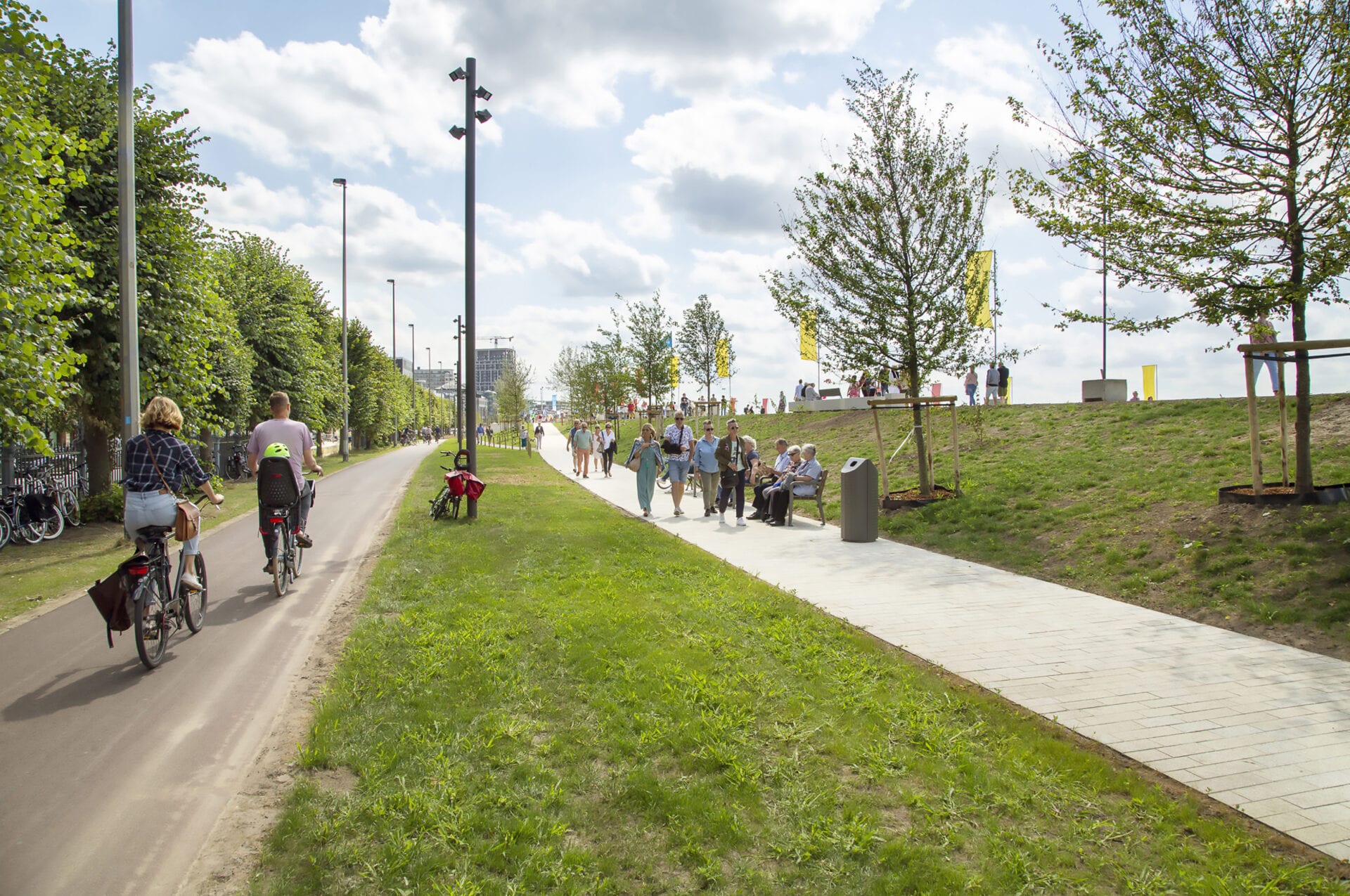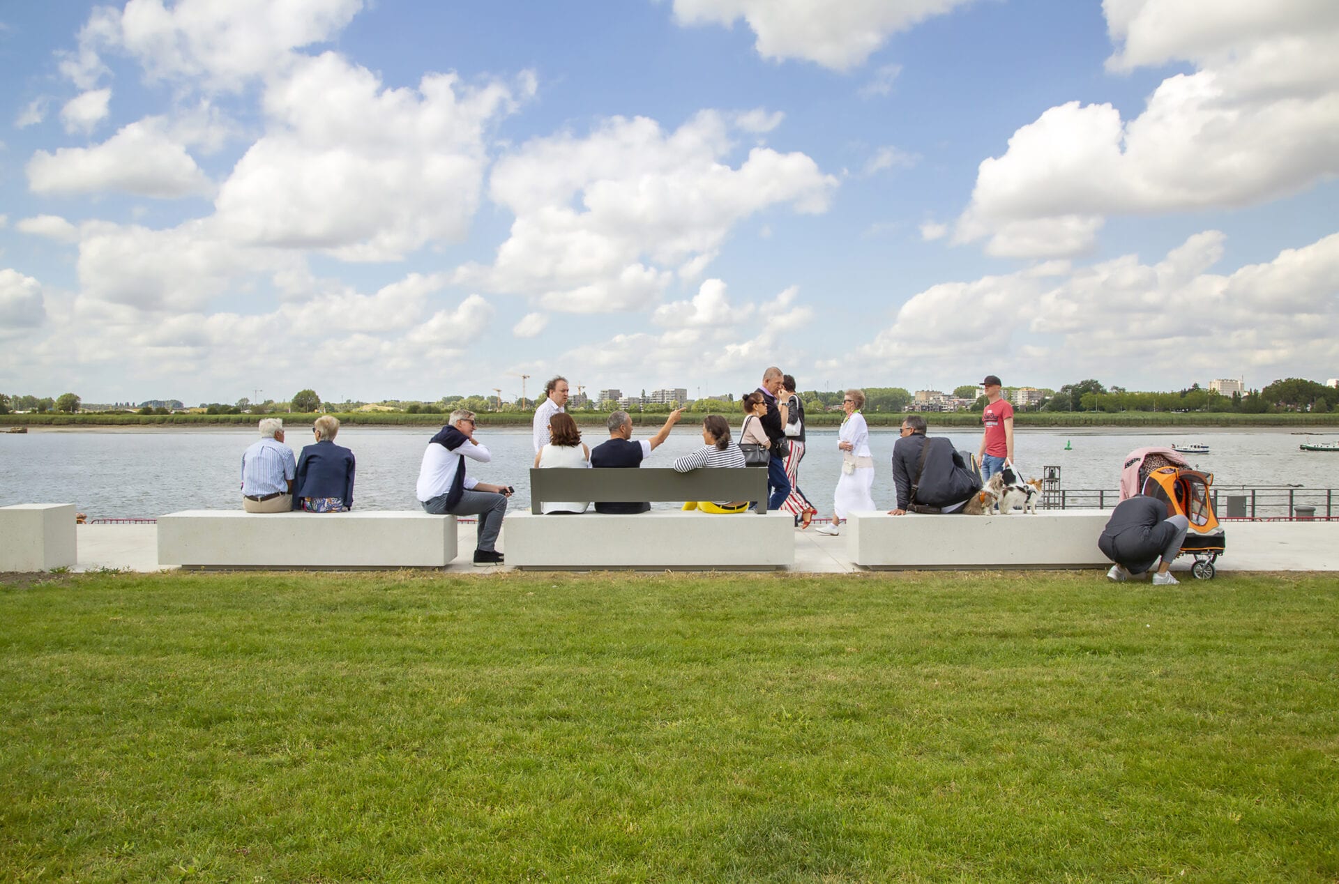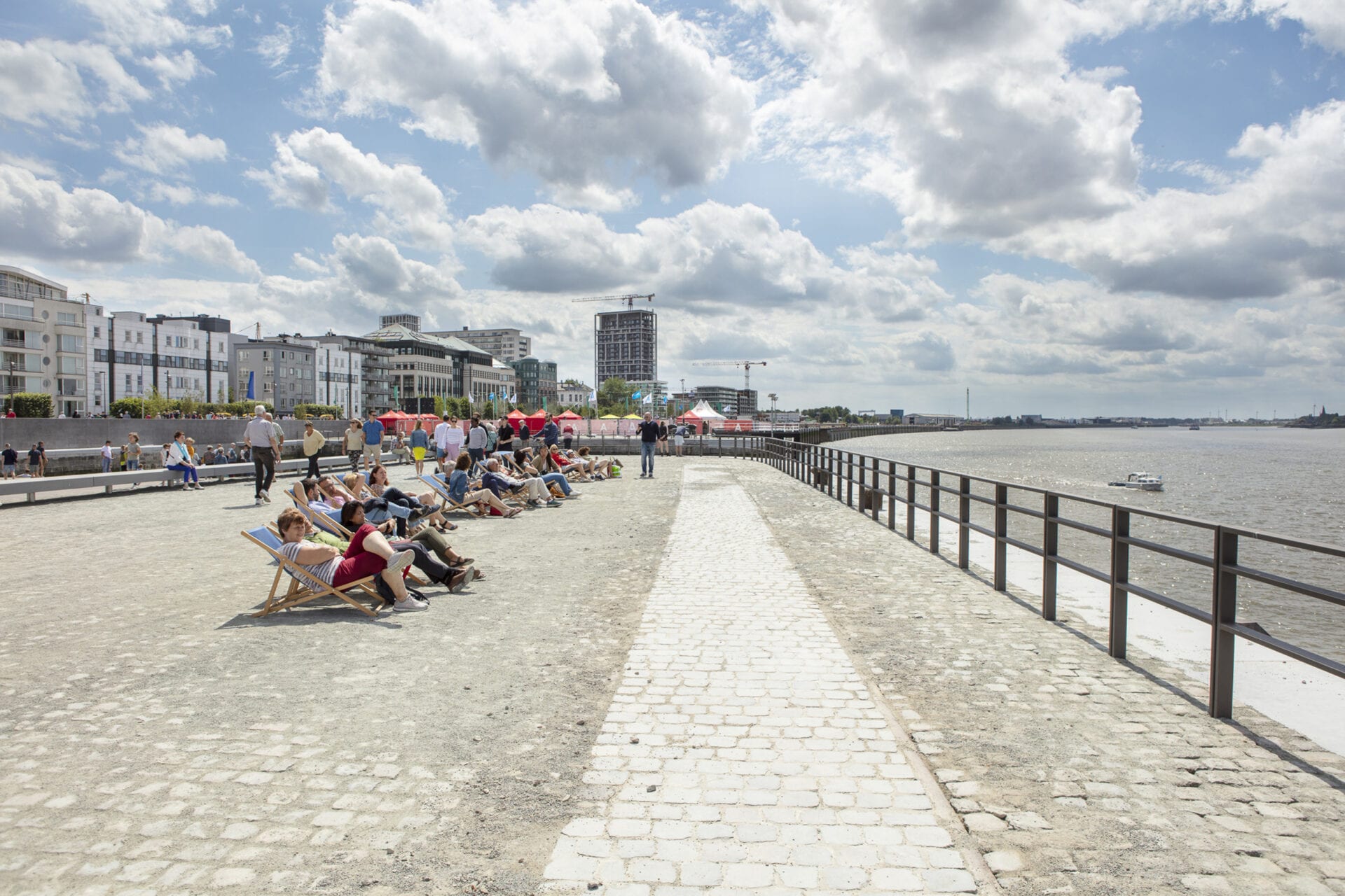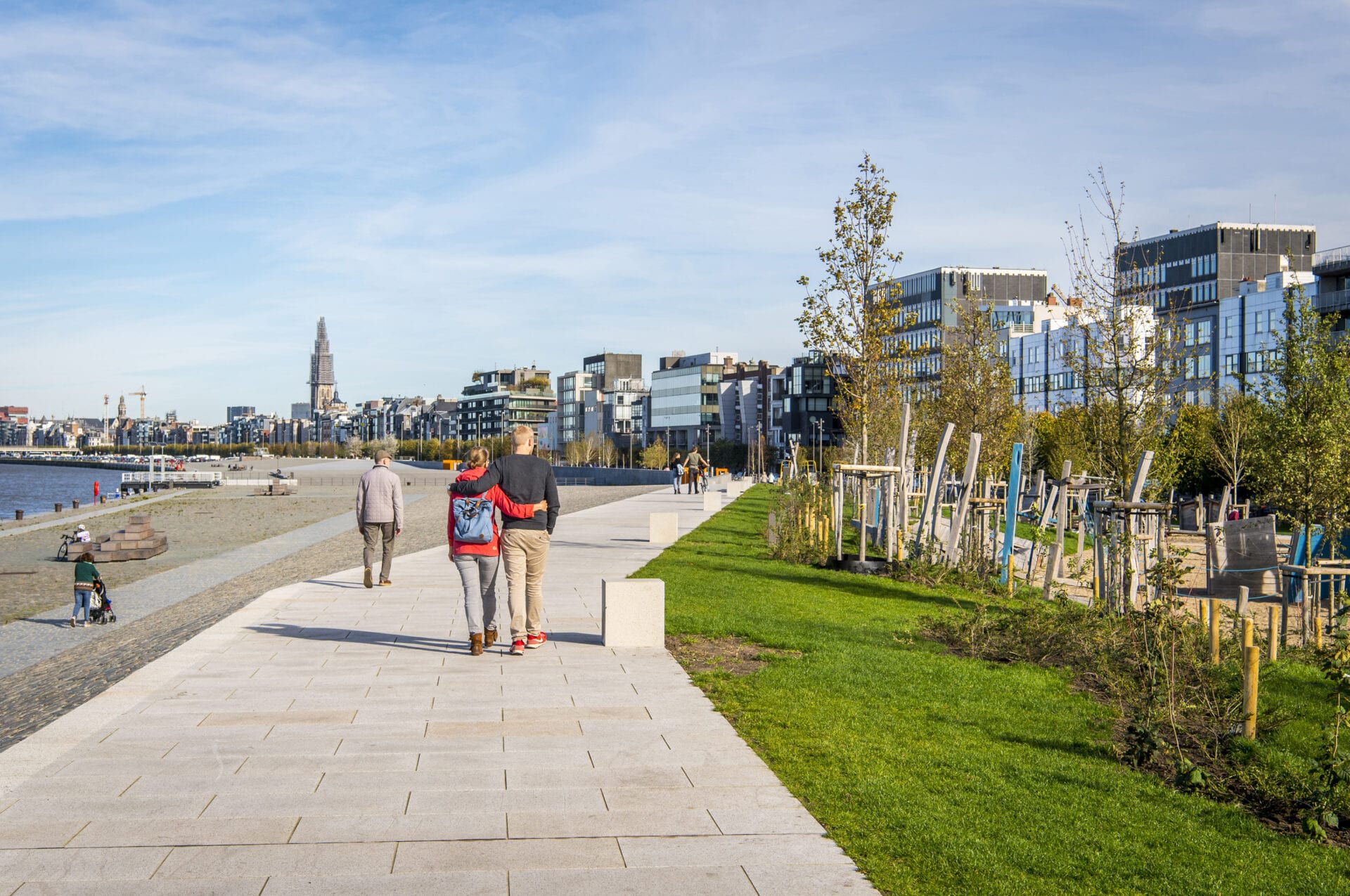 The ‘Sint-Andries en Zuid’project is an important component of the Quays masterplan of the Schelde that was developed in the 2006-2010 period by the Temporary Association of Proap-WIT-D-Recta. The Quays masterplan of the Schelde was tasked with identifying the outlines for the reconstruction of the Quays of the Schelde, from Het Eilandje in northern Antwerp to Blue Gate Antwerp in the south of the city. It covers 7 sub-areas in total. Over a distance of almost 7km along the banks of the Schelde, the inner city’s ambition is to reconcile a new public space on the waterfront with a new, higher dyke to protect the city from this water. The project for the ‘Sint-Andries en Zuid’ area, one of the master plan’s seven sub-areas, began in 2009. This master plan aimed to reconcile two seemingly incompatible agendas with one another. On the one hand, implementing a City on the River, whereby the quays act as a public space for the inner city that upholds the bond between river and city once more. On the other hand, following the guidelines in the Sigma Plan for protecting the city against the water flow by putting up a new uninterrupted dyke at the level of 9.25m TAW (Second General Water Level). The dyke divides the quay area into a dry city side and a submersible river side. The dry and wet sides are distinguished from one another by their usage and materials. On the city side, a rich range of surfacings, alternating with green spaces, links in with a long list of small-scale programmes. The wet side can be identified from the extensive cobbled surface, providing ample service for temporary uses for as long as the river permits. In the area of the ‘Sint-Andries en Zuid’ parts of the city, the urban structure covers a relatively extensive surface area of public spaces, thanks to the presence of the ’Gedempte Zuiderdokken’, where a park of nearly 10 hectares is being implemented. This can serve to limit the supplementary range of urban public facilities on the quays themselves. This makes the ‘Sint-Andries en Zuid’ project area a unique component of the quay structure, where a relatively large percentage of the surface area can be released to the submersible wet side of the dyke. It is this duality that also translates into the dykes bilateral nature. It was important here to develop the city-side section (the dry side) as a linear park, whereby the dyke largely stands out as a gentle green slope, with trees and informal recreational areas. Whereas the most northerly zone lends itself to informal use and recreation in a relatively spontaneous manner, the central zone, with its more mineral, paved layout, offers opportunities for organising more intense urban programmes and activities, such as markets and exhibitions. In the most southerly section, the park provides sufficient space for a fitness zone, a playground, a dog-walking zone and a washing and transfer area for city service road sweepers serving this new public space and part of the inner city. In contrast to the city side, the river side will only allow for temporary activities. The Quay Area here is a place to get a breath of fresh air for the city, where you are free to do anything or nothing. The quay area forms a vast open space here, a unique urban landscape with explicit references to the historical harbour (reuse of the cobblestones as paving material with integration of the existing dock crane tracks and retention of the mooring facilities for large sea vessels). A wide range of temporary uses can be scheduled here, from sporting events to concerts or open-air films. On this wet river side, the central section, in the area of the South Lock, will also be the place for hosting a large number of activities owing to its specific conditions. The quay area slopes gently towards the water here, creating one of the rare locations on the Quays of the Schelde that brings the river tangibly close to the public space. The slope provides smooth contact with the water in the form of an urban ‘beach’ with a southerly orientation and wonderful views over the curve of the Schelde.