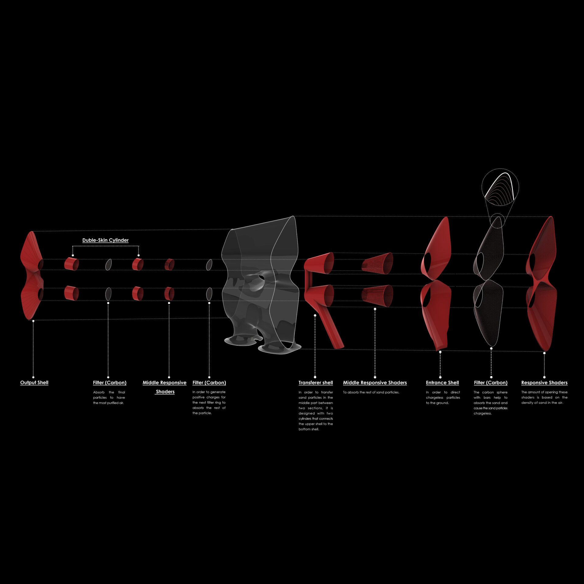 Studies showed that soil particles are electrically charged. Therefore, the main structure of the towers consists of two deep cavities to absorb soil particles via magnetism, removing the electrical charge from the particles. Sand particles enter the cavities and are attached to the smart panels inside the holes, which will open to a certain extent according to the storm’s intensity. Then to ensure that all particles are neutralized, all their electric charge is taken in two different stages. Due to the larger diameter of the soil particles at a lower height, the lower cavity has a larger opening.