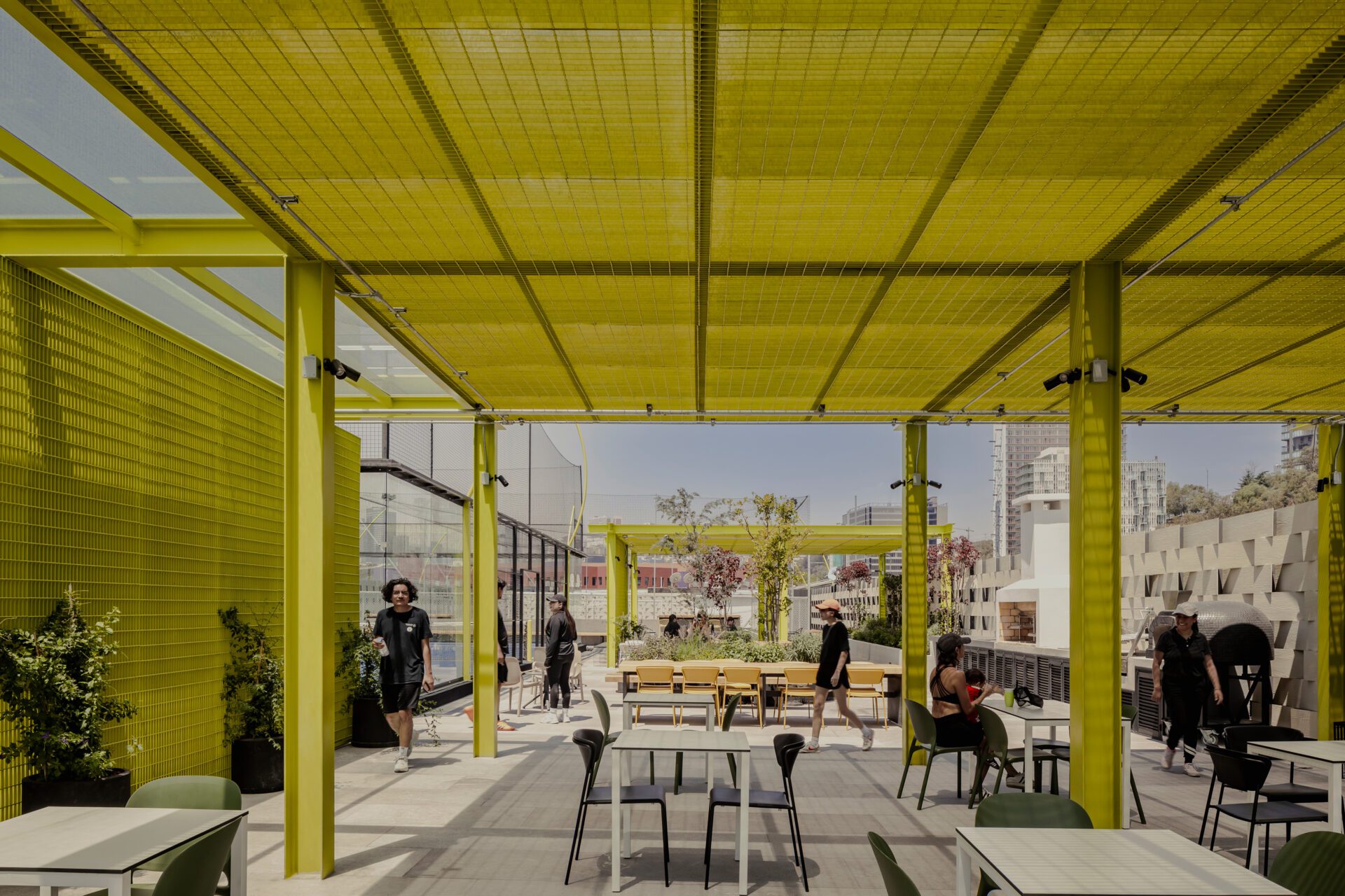 Terraza Santander is located in Santa Fe, Mexico City, on the rooftop of the Work Lab Santander offices—an experimental, holistic project fully designed by the studio, aiming to break paradigms in the design of corporate banking