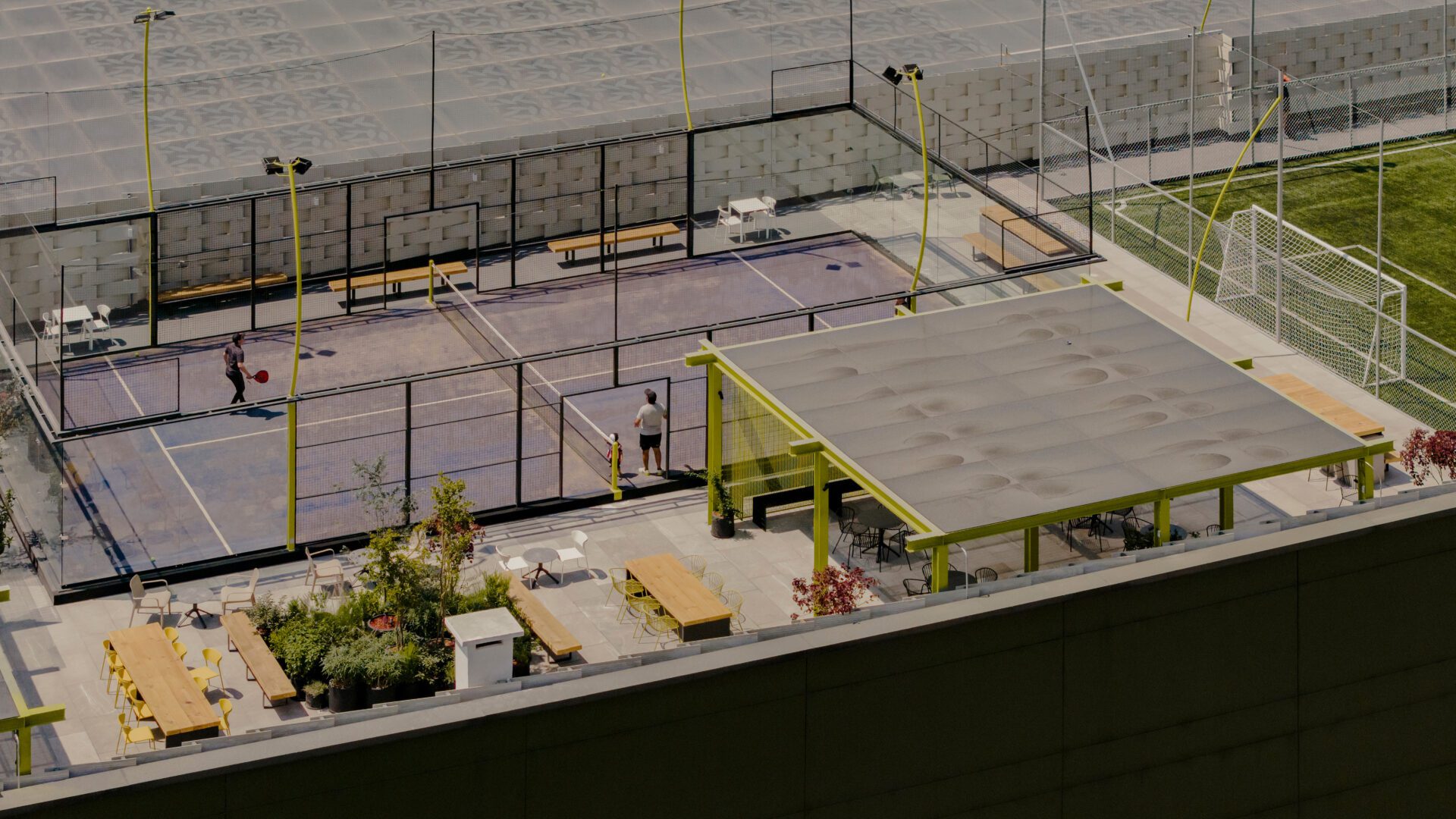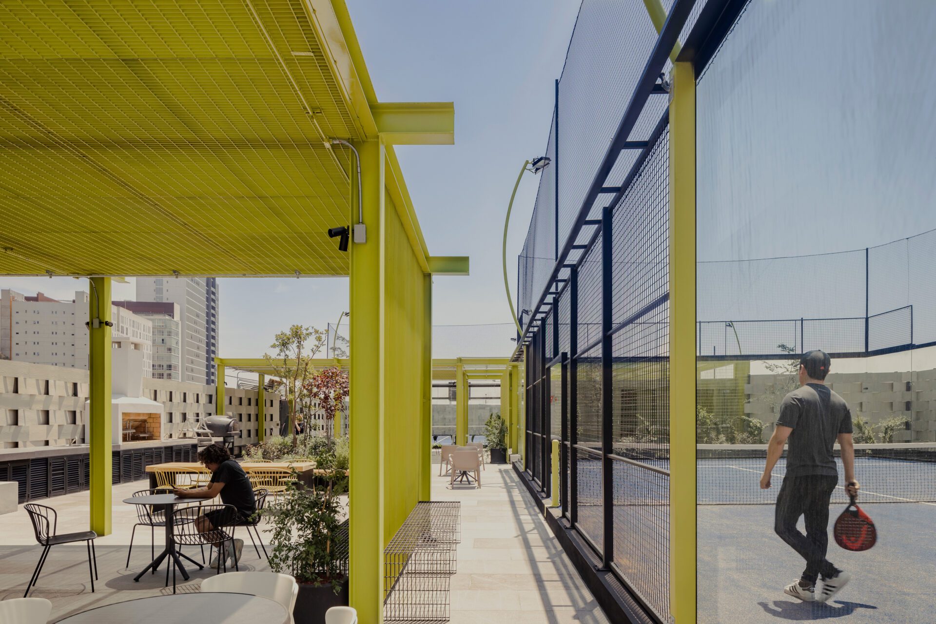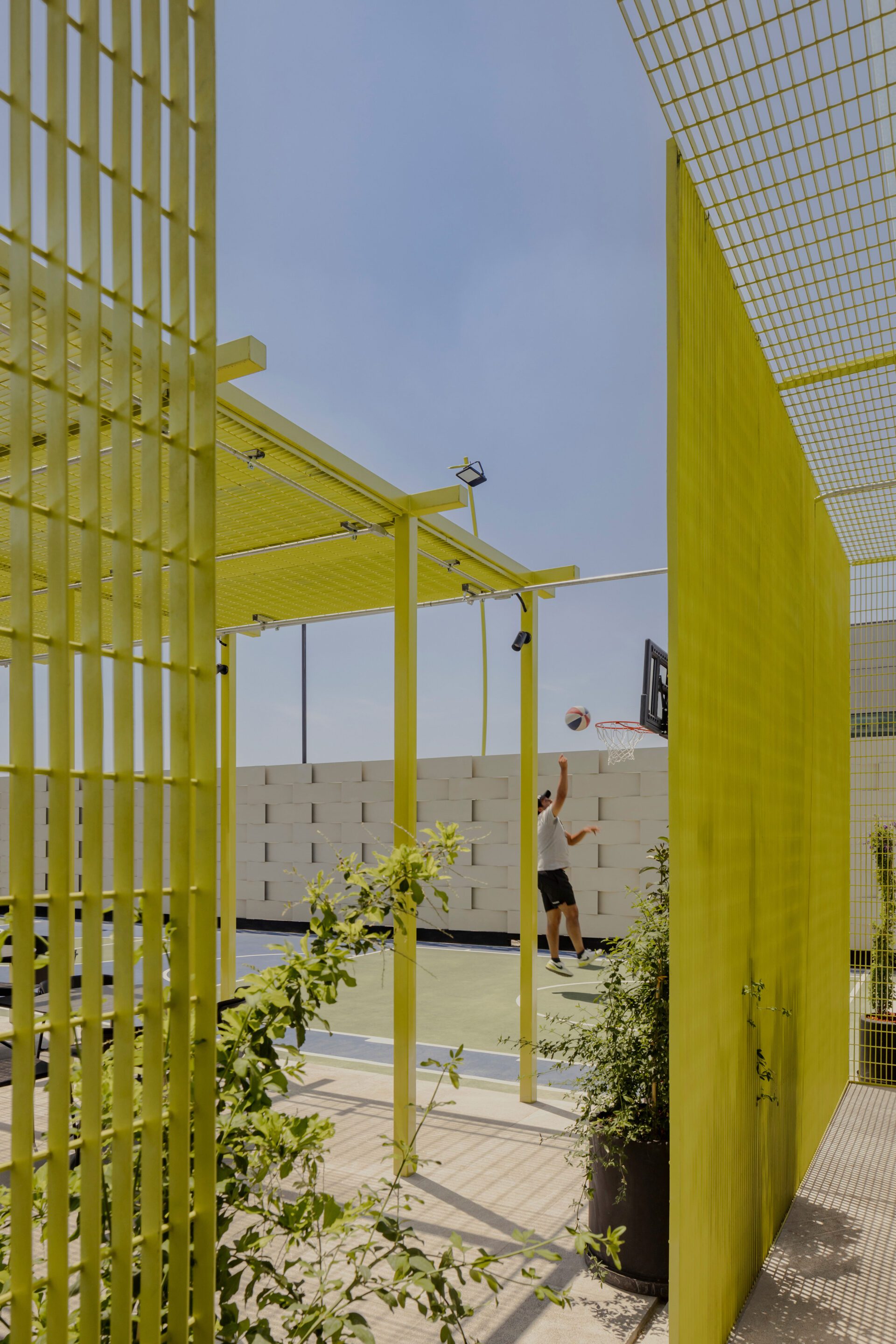 experience. Leisure areas are spread throughout the rooftop, offering spaces for informal gatherings equipped with grills and outdoor tables. These zones not only complement the sports activities but also encourage social interaction, strengthening bonds and fostering a collaborative and friendly work