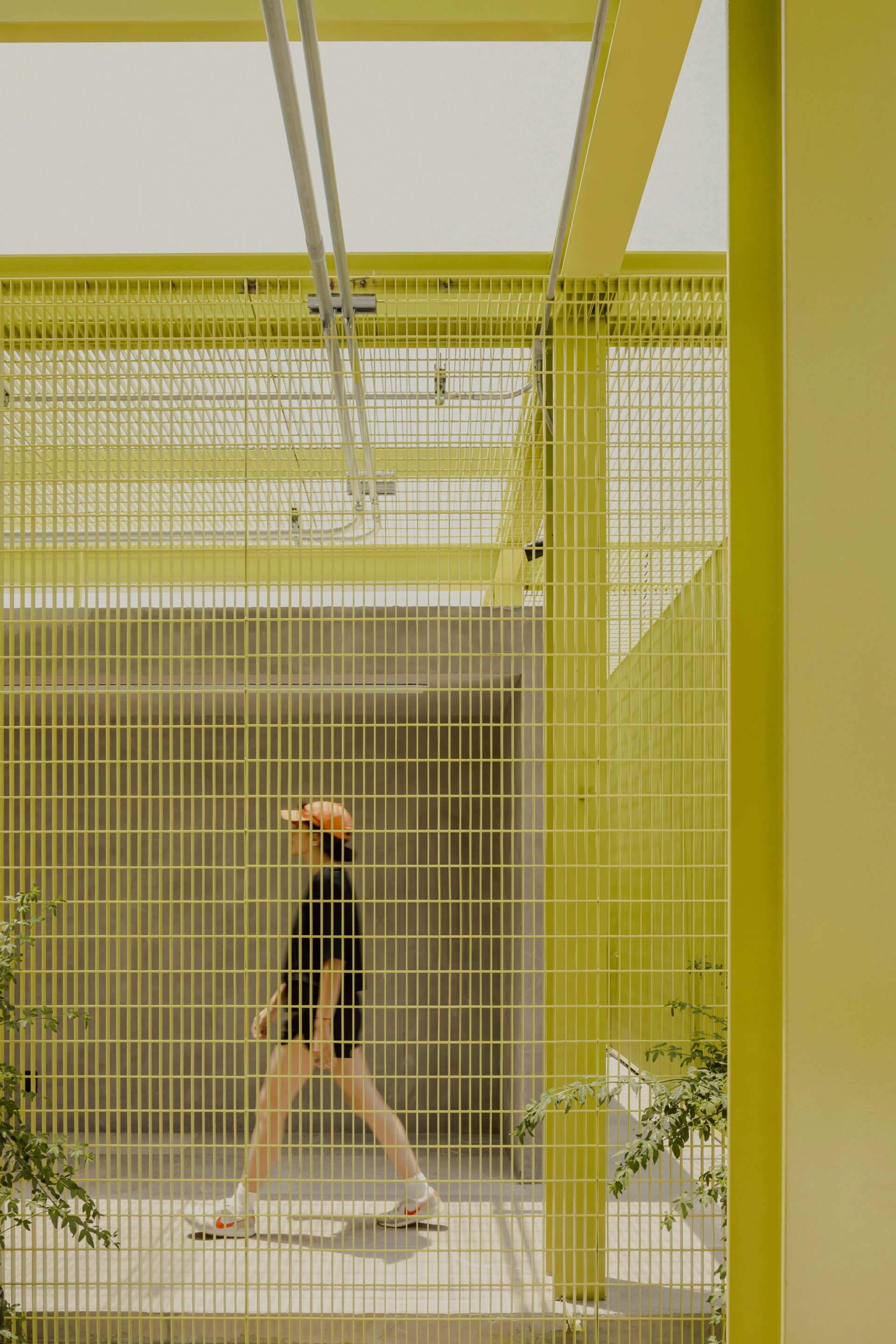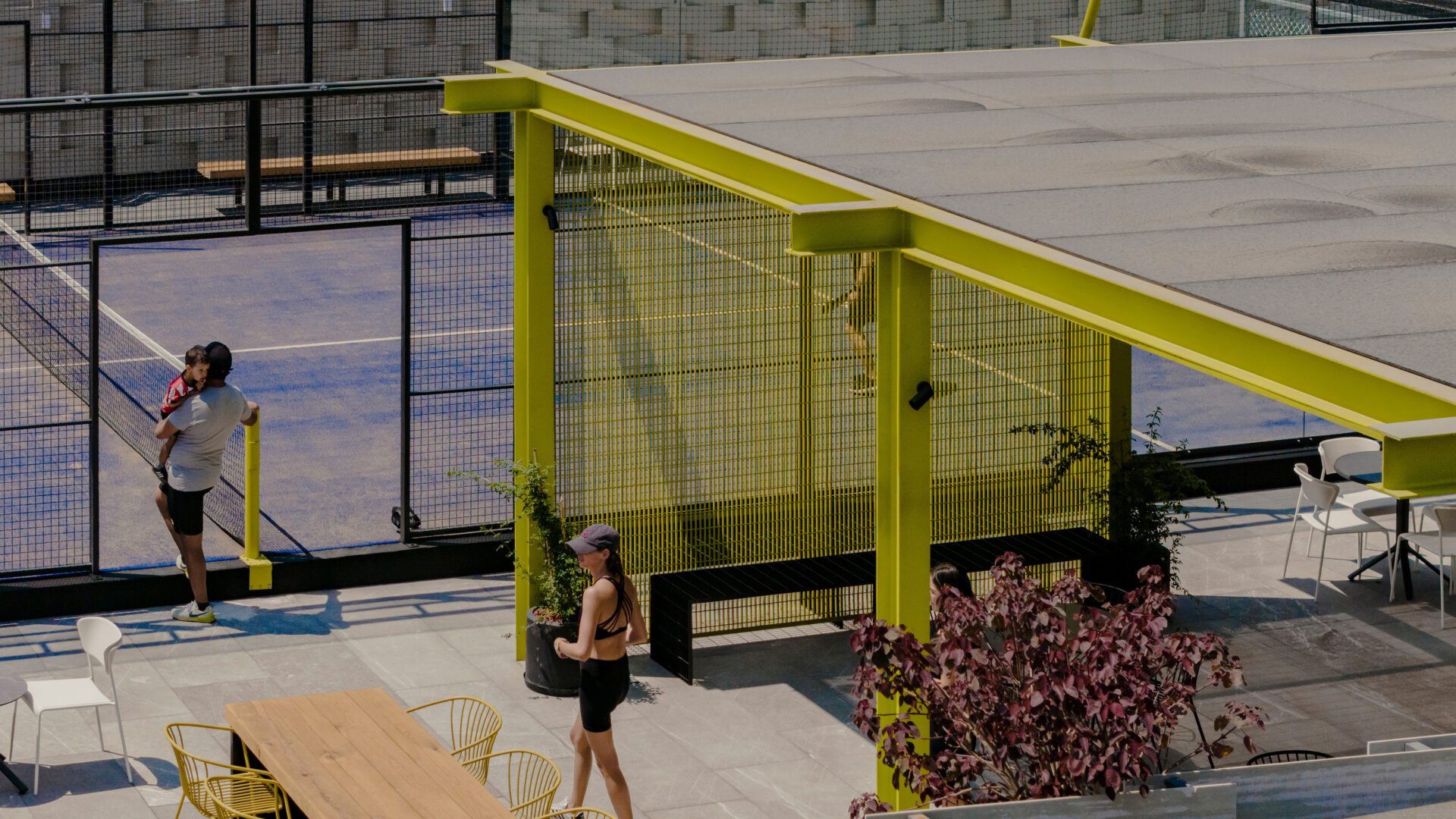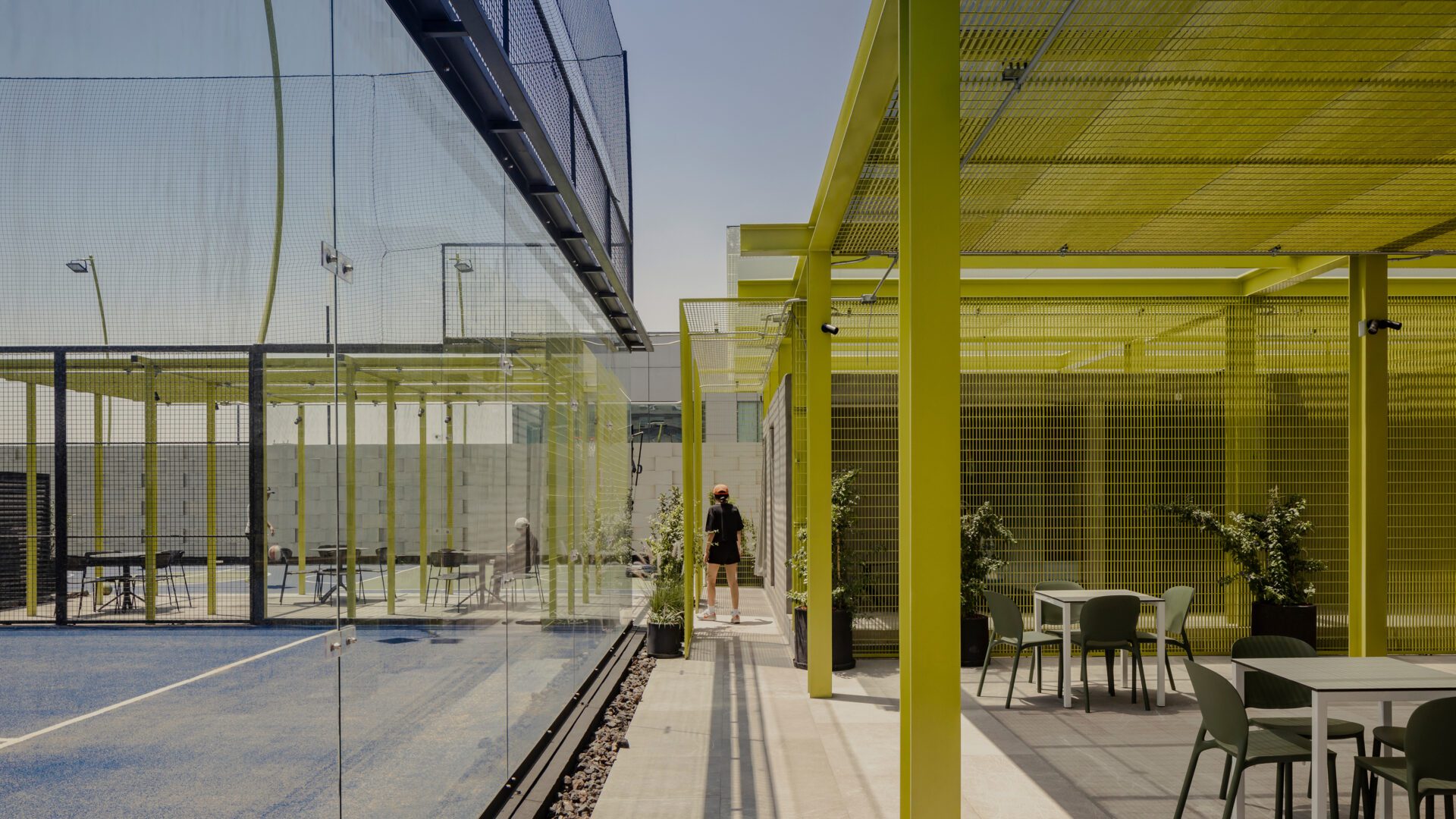 area. These coverings not only provide shade and a touch of color to the space but also create a welcoming and dynamic atmosphere that invites physical activity. The choice of a vibrant yellow for the metalwork adds a distinctive visual element while contributing to an energizing and optimistic ambiance—perfect for motivating the team during their sports and recreational
