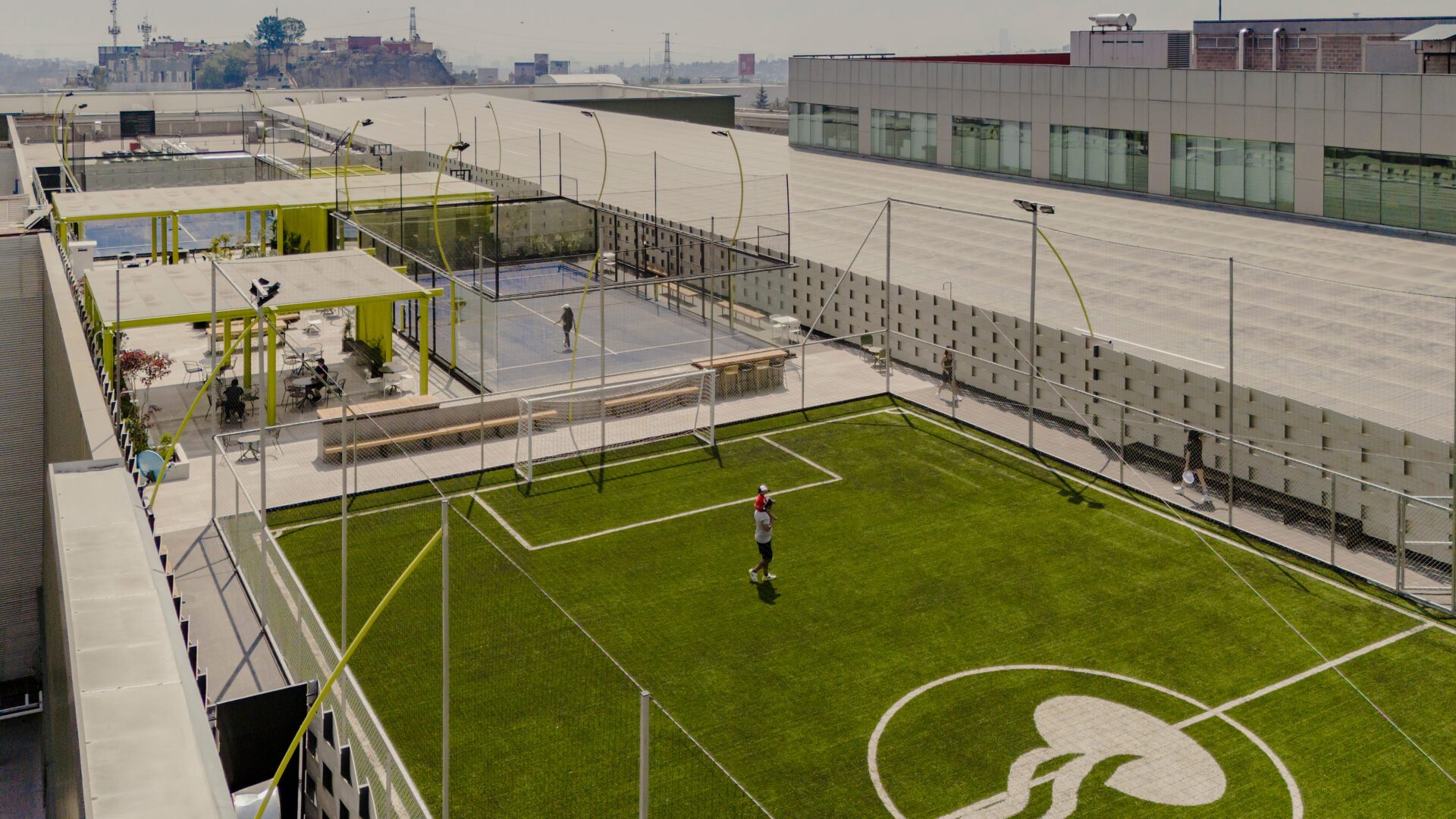aesthetics. Previously used for electrical and HVAC installations, the rooftop has been meticulously transformed to host various sports and recreational facilities. At the heart of this space lies a soccer field, accompanied by two tennis courts, designed to foster friendly competition and active exercise among the corporate team. Additionally, locker room cubicles equipped with essential amenities ensure that users enjoy a complete and comfortable sporting