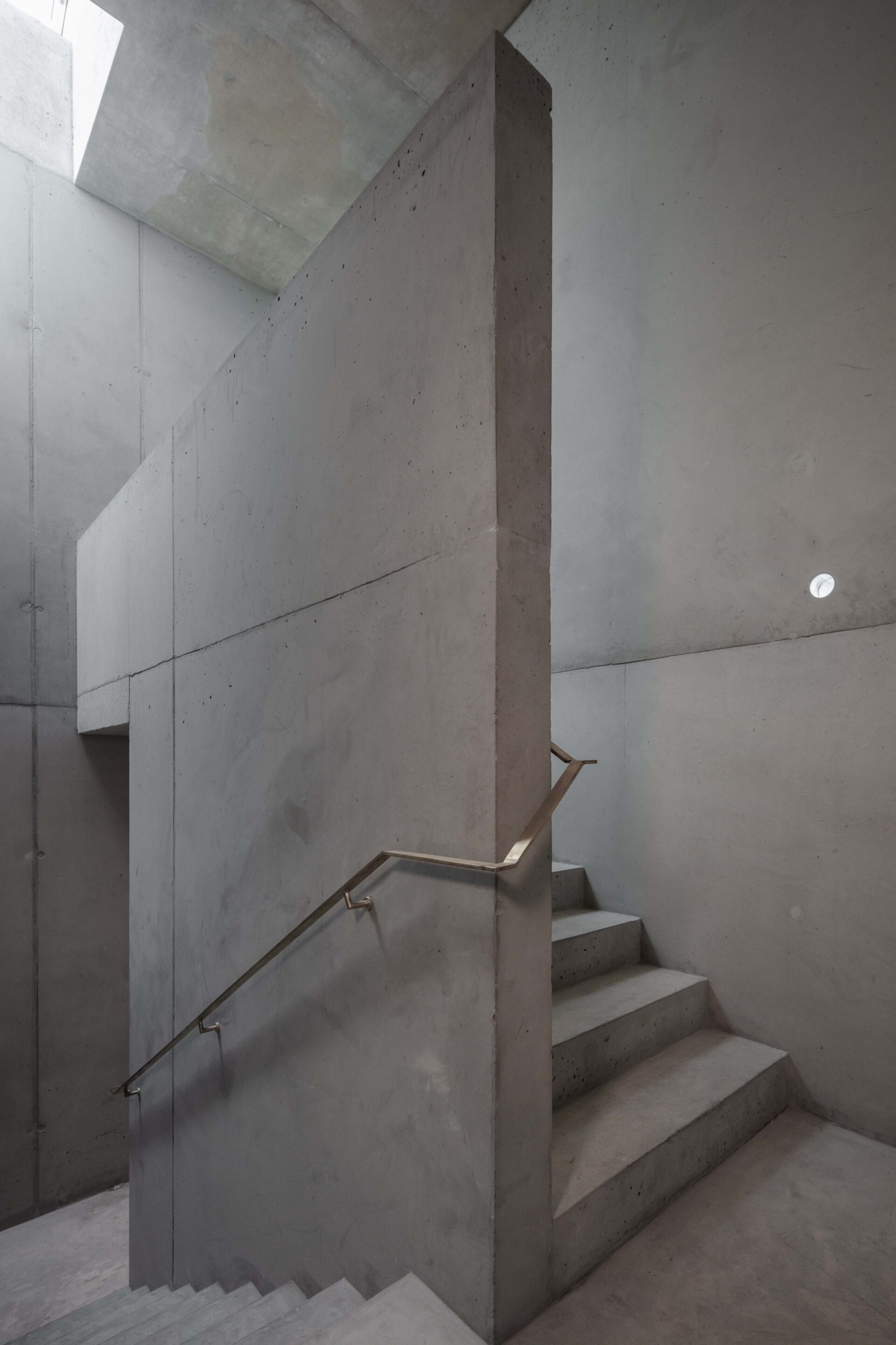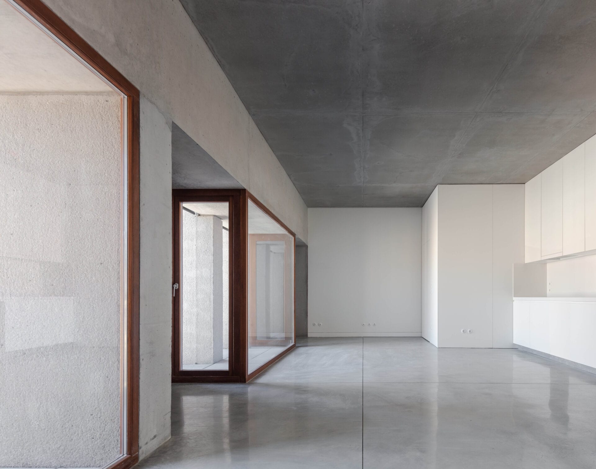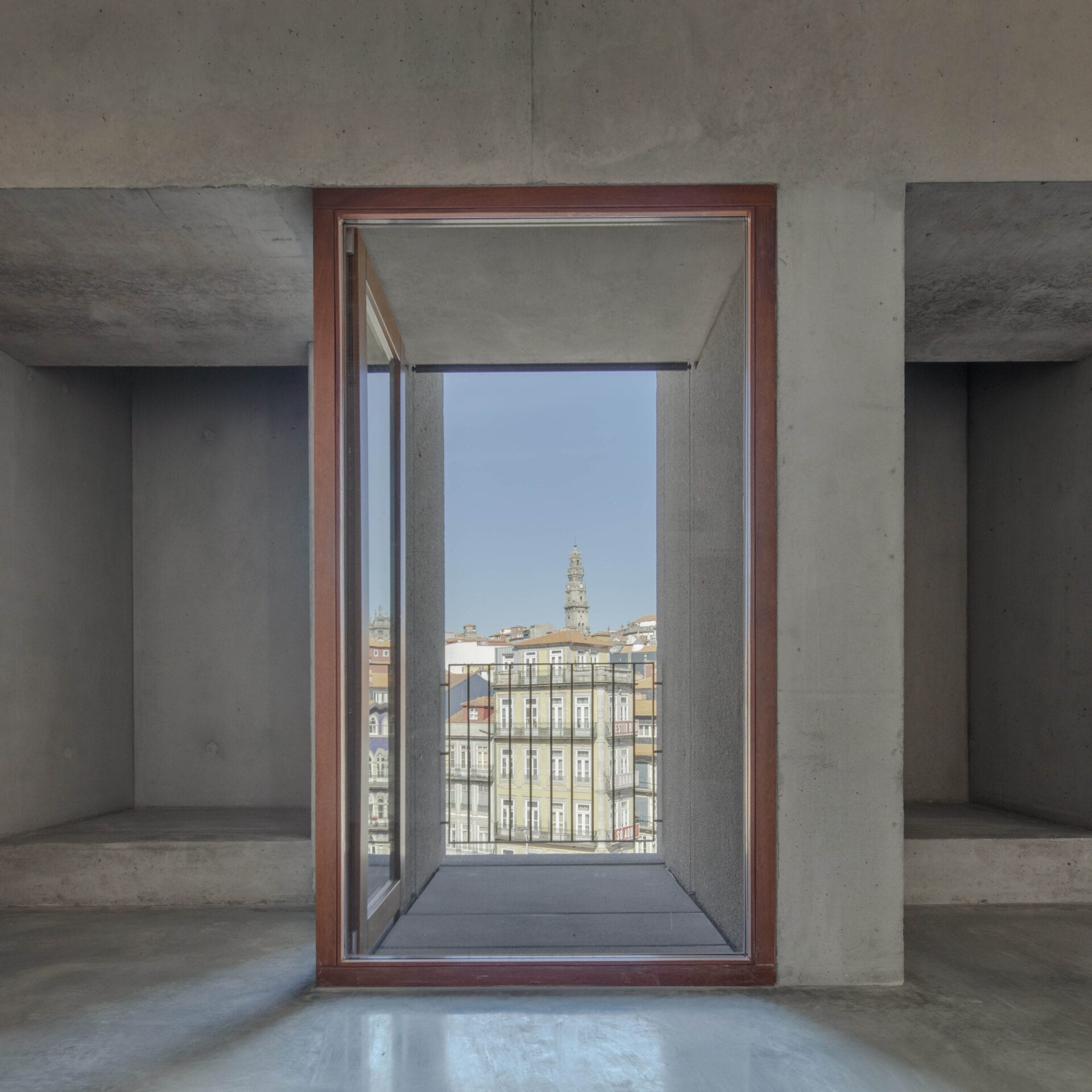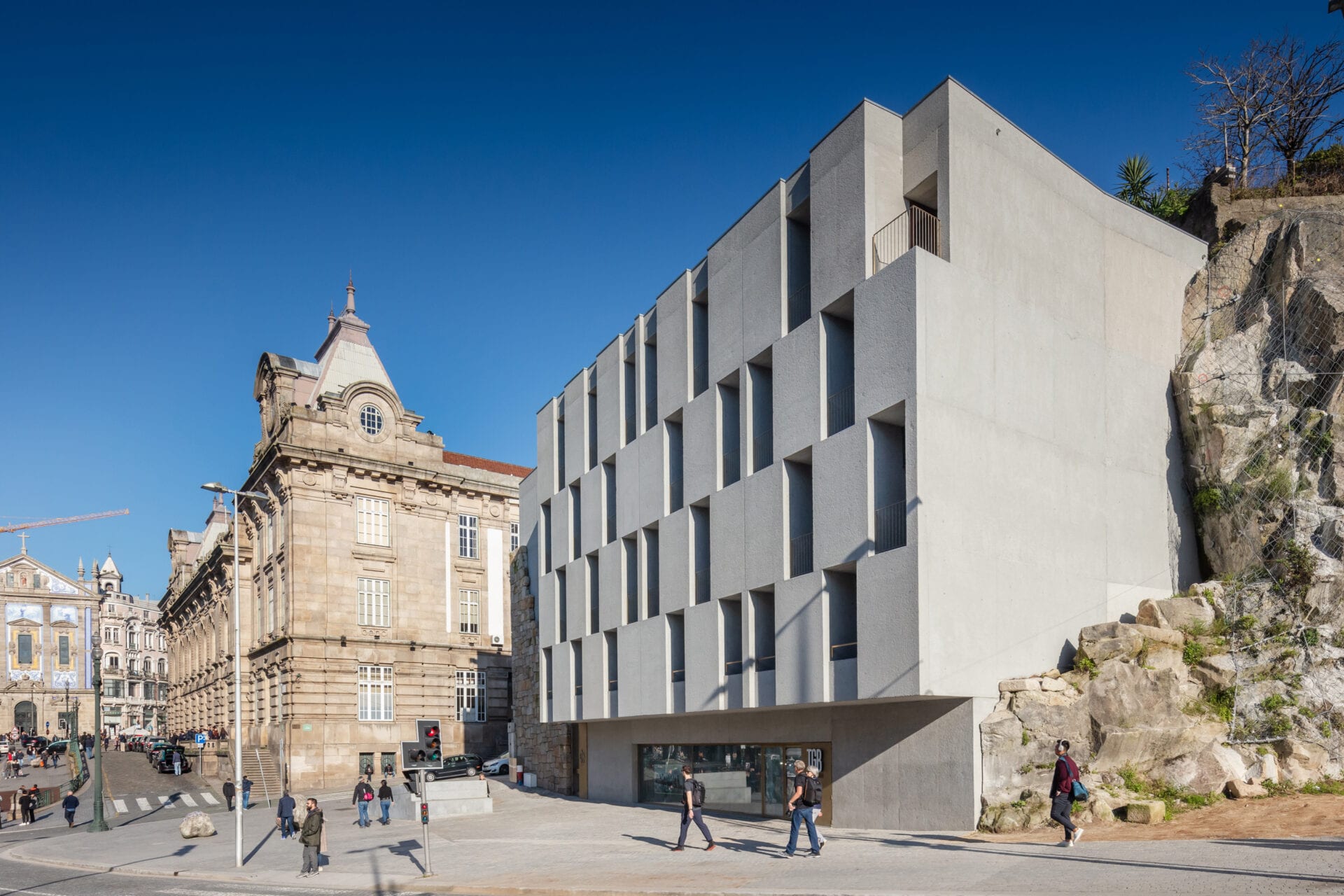 The São Bento Residences project is located on a notable corner of Porto's Historic Centre, next to the city’s main station and just a few meters from the old cathedral. This corner results from a 1940’s demolition plan for the development of a Modern avenue. Assuming its contemporaneity, and avoiding any kind of architectural pastiche, the project seeks to establish continuities between a remnant granite façade of the 18th century and the vast mass of an escarpment which resulted from that urban demolition. A monolithic block, built in exposed concrete, hammered “in situ”, conforms itself to those prevailing shapes and scales. The rhythmic composition of its main façade reinvents the vertical proportions and the refined brass detailing of Porto’s traditional architecture.