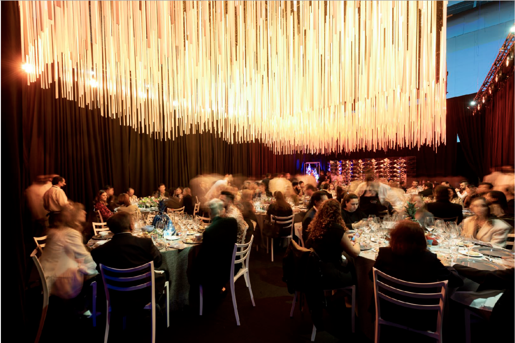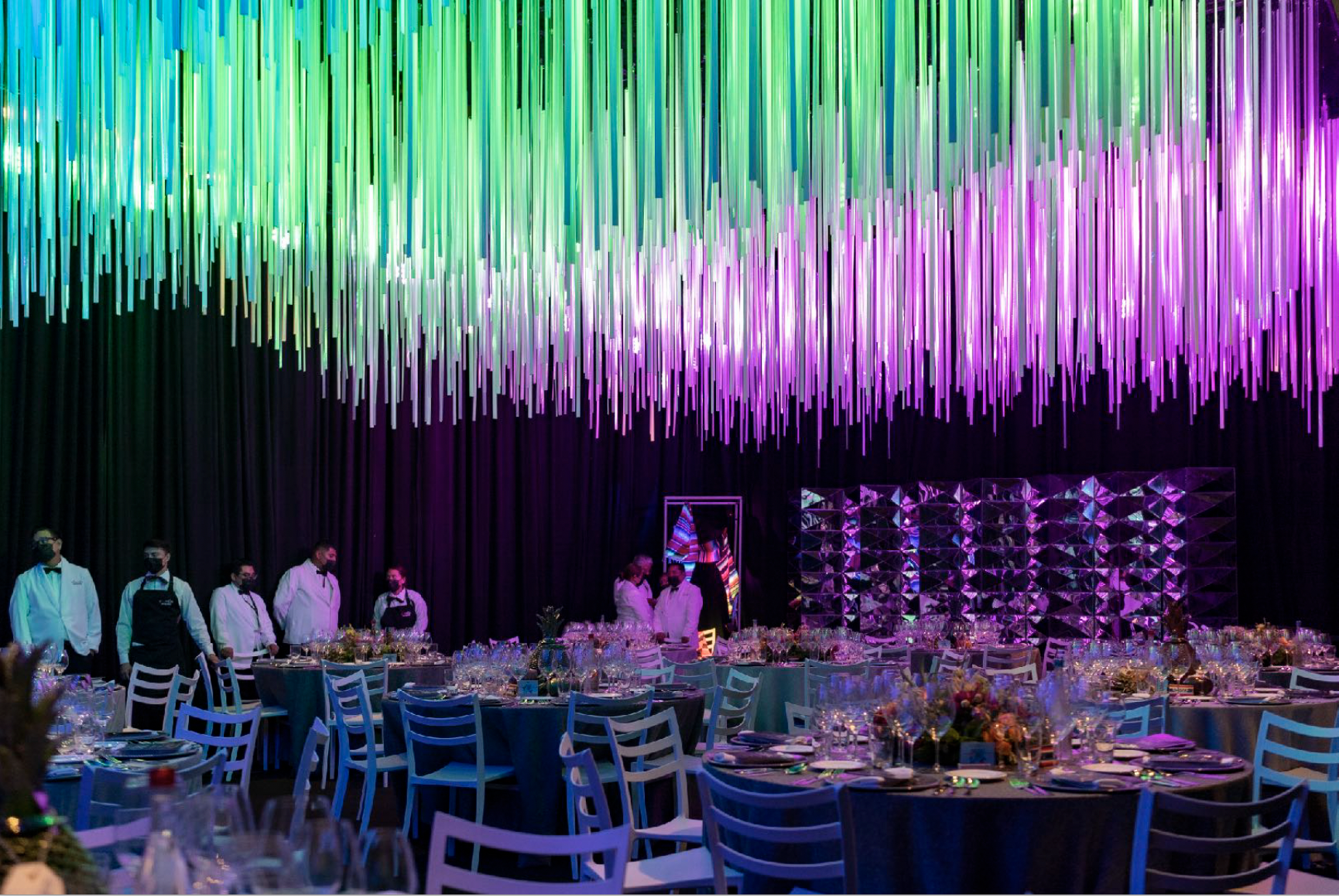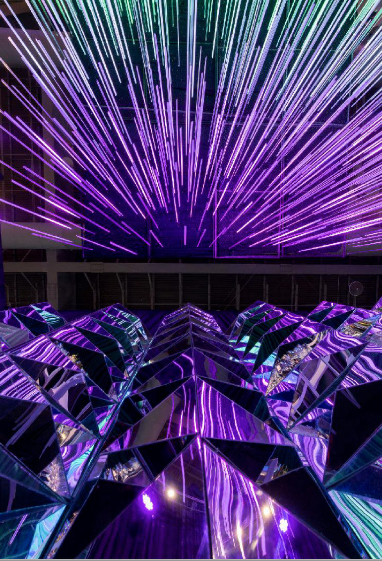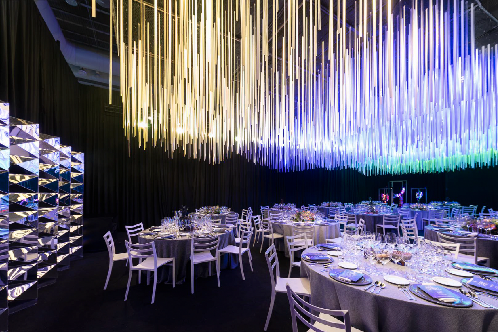 Sarape It is a light experience together with an ephemeral gastronomic proposal. The main objective was to convert the void into content, intertwining time and space with the aim of creating a visually spectacular environment and in an abstract way. The contrast is the mirrored tables that allow the diner to feel in a different environment with each change of tone. Assembled in just 48 hours, the lighting has to do with the concept, the interstellar film where an attempt was made to make a representation of the Mexican serape and its colors. The way that was chosen was through 3,000 tubes and strips of transparent and white acrylic .9w woven together, 24 projectors programmed to project the different colors of 7 different serapes, with transitory changes every 10 minutes Reinterprets and honors the serape in various ways with a series of walls in different cloths and with different colors, with a lamp of 90m2 and with a 7m wall of diagonal mirrors that, with the reflection, generates some abstract serapes, thus the vibrantness of each color could be simulated. They were placed randomly to give that idea of the space that in some areas there is more crowding of lights and in some others fewer lights were placed. This effect was emphasized by adhering the cloth canvases to be able to give stages of organic forms and proximity and distance from the lights with the falls of the cloth. A special LED was selected that had a temperature neither too cold nor too warm, 2700k so that the sum of the strips would create an atmosphere of diffused and dim light where a pleasant and enveloping lighting is created since the user feels immersed in the space created. .