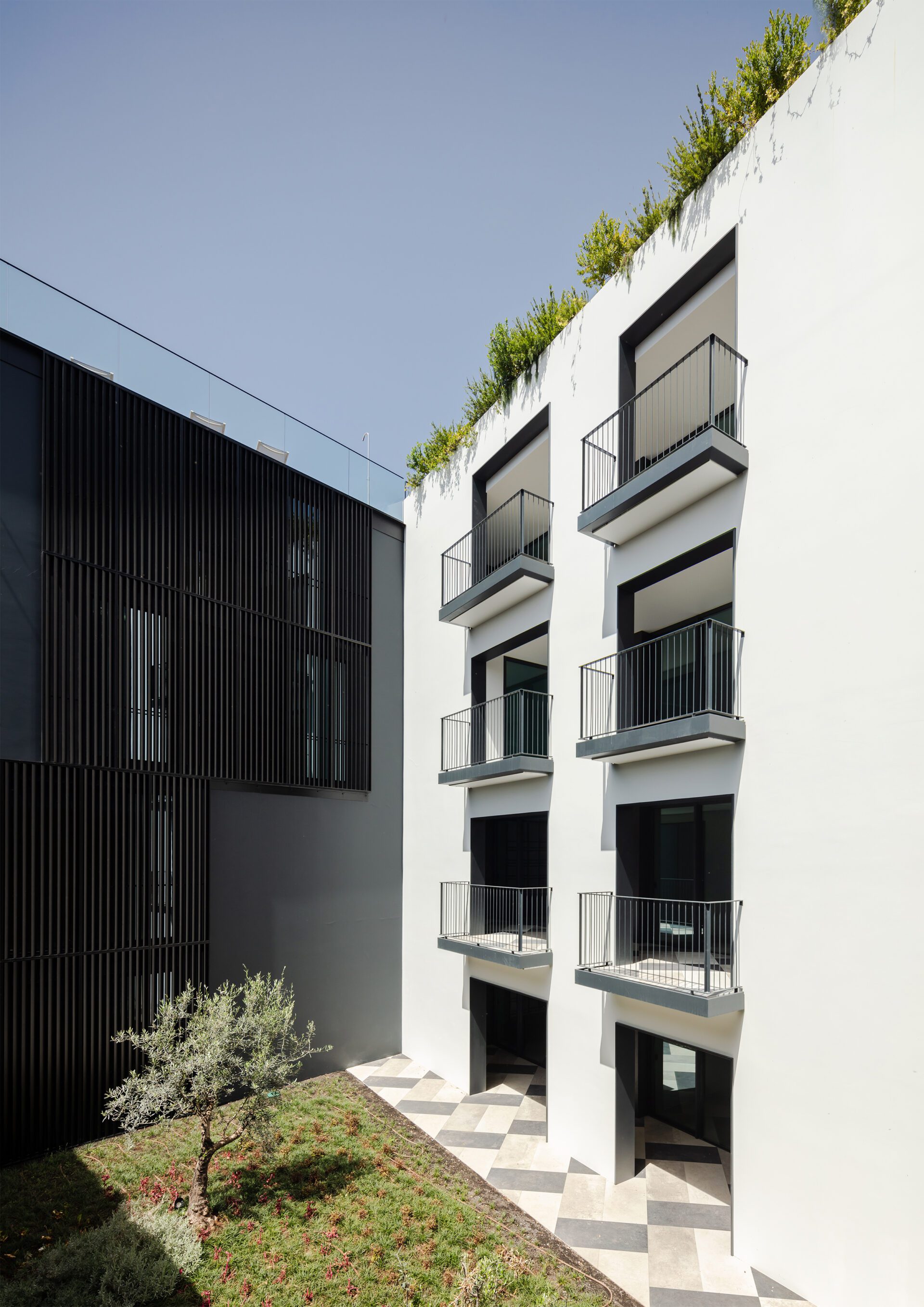 Savoy Residence | Insular features 49 luxury residential units and 12 commercial spaces, distributed in four distinct volumes that reflect the pre-existing structures, unified by materials. The Block B stands out, an old deactivated factory, preserved and adapted for residential use, maintaining its volume, geometry, metal structure, and glass elements.