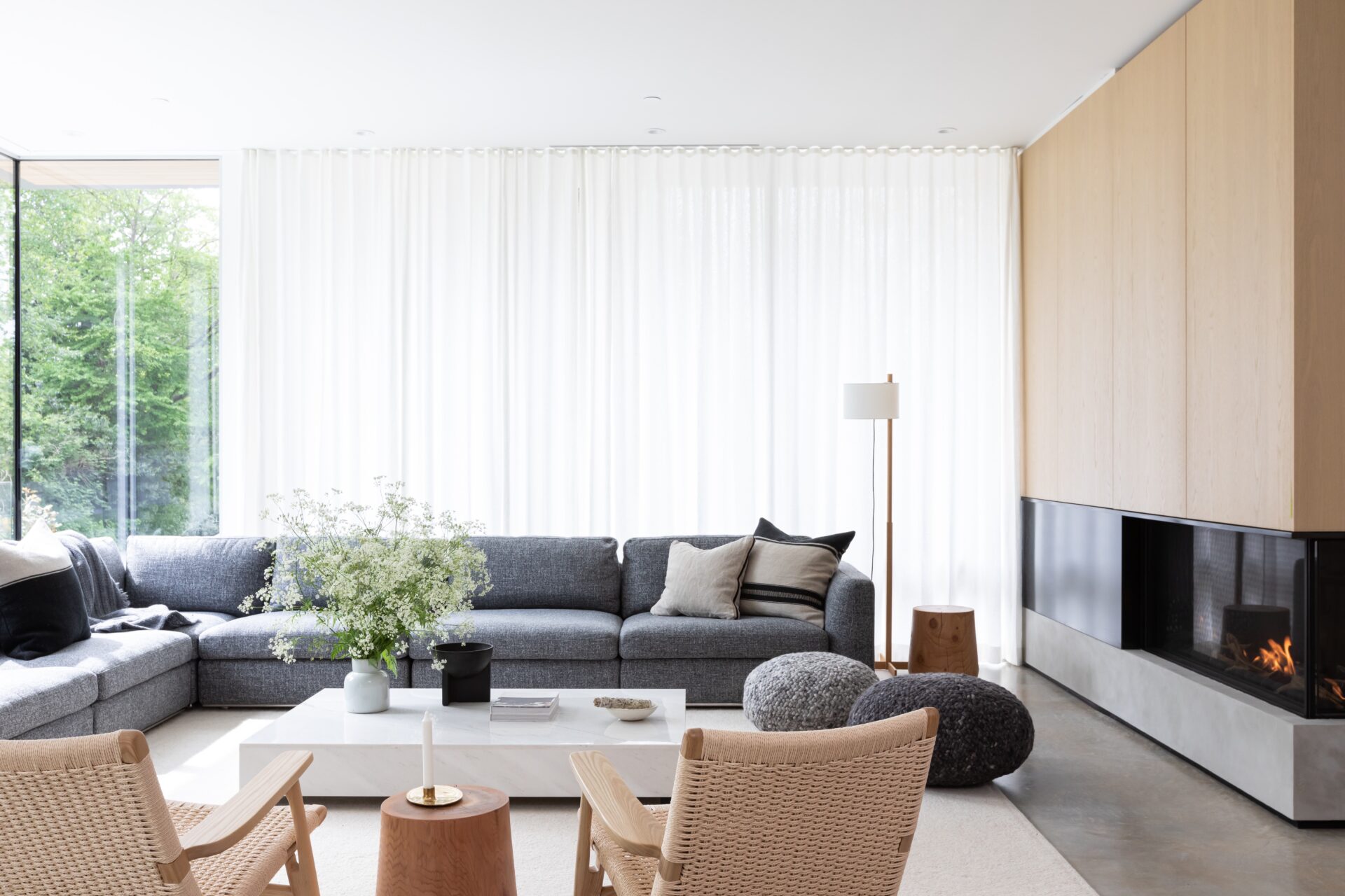 This five-bedroom, 3850 sq ft project is situated in a part of the city historically known for rural farmland and equestrian clubs. The architecture of the house references a pastoral barn vernacular that complements the setting and suits the family’s desire for relaxed family living. Large expanses of glass take advantage of lush tree lined views but are softened on the interior with natural linen floor to ceiling drapes. The easy-going concrete floors are visually warmed by the ample use of flat cut white oak millwork throughout the home.