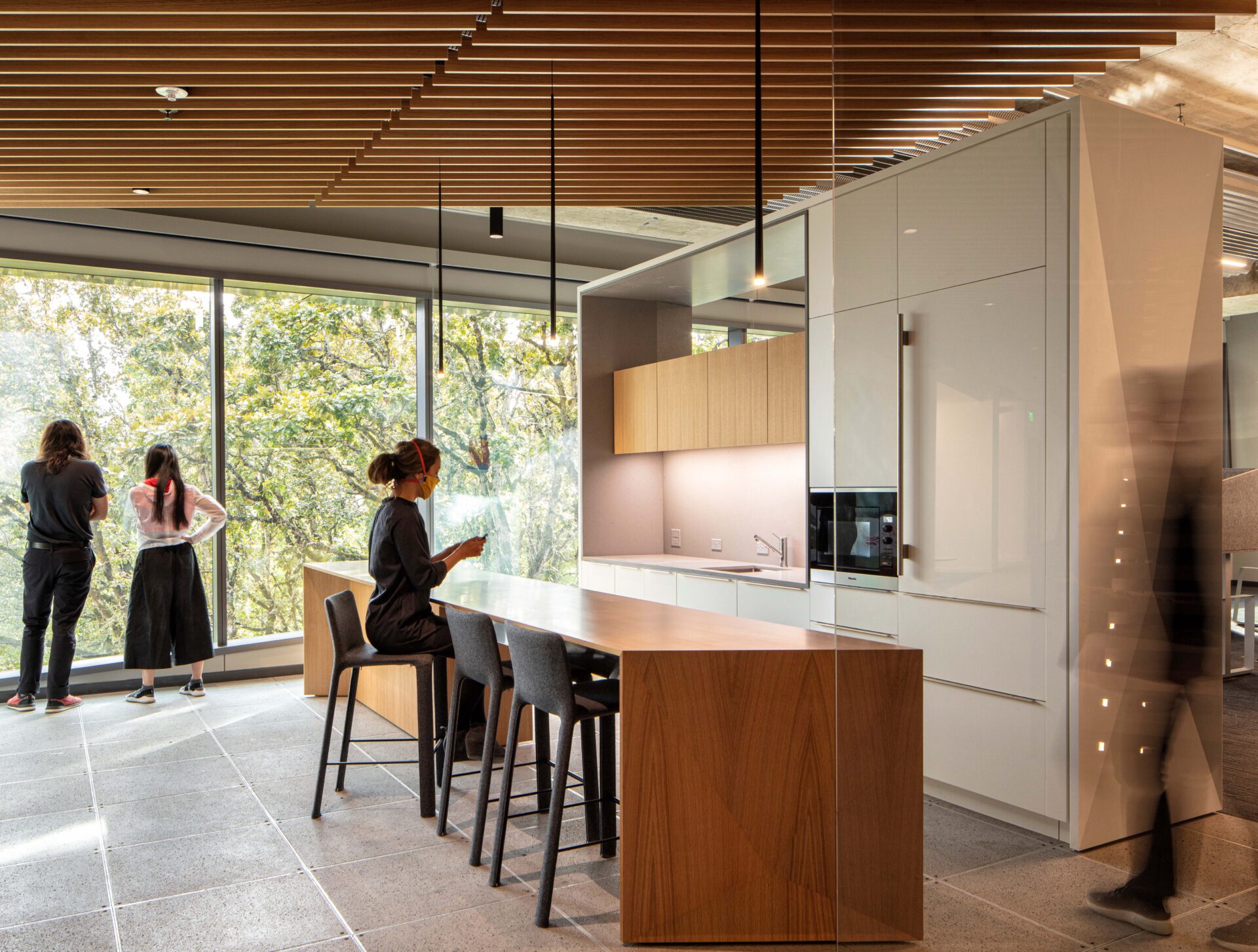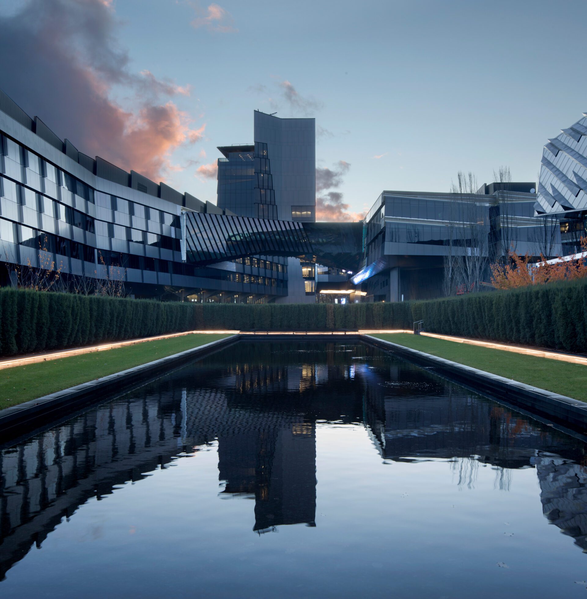 LEED Platinum design works with nature in respectful site design and intelligent construction with responsible systems and materials. The existing access road, parking, and loading are buried to minimize the visual presence of vehicles. Each of the building’s distinct bars cascade to the south, featuring inhabitable, interlacing green roof terraces overlooking the nearby wetland where collected stormwater is returned. A rooftop photovoltaic array screens mechanical units from view. Energy efficient mechanical systems included central plant facilities, displacement ventilation, greywater systems, and radiant sails.