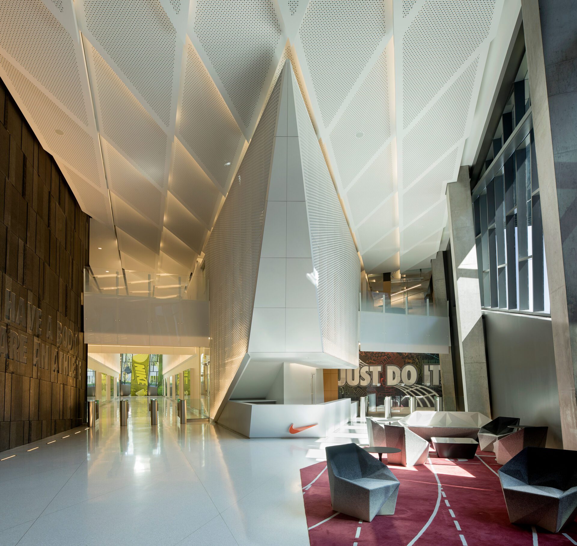 The building consists of four parts: an underground parking garage and loading dock; a merchandising center for prototype retail spaces; integrated design studios for multiple product categories; and a 12-story tower with shared amenities for all of campus. Integral to the design is the concept of flow: a fluid state design strategy facilitating unexpected connections and possibilities among designers and between disparate parts of Nike.