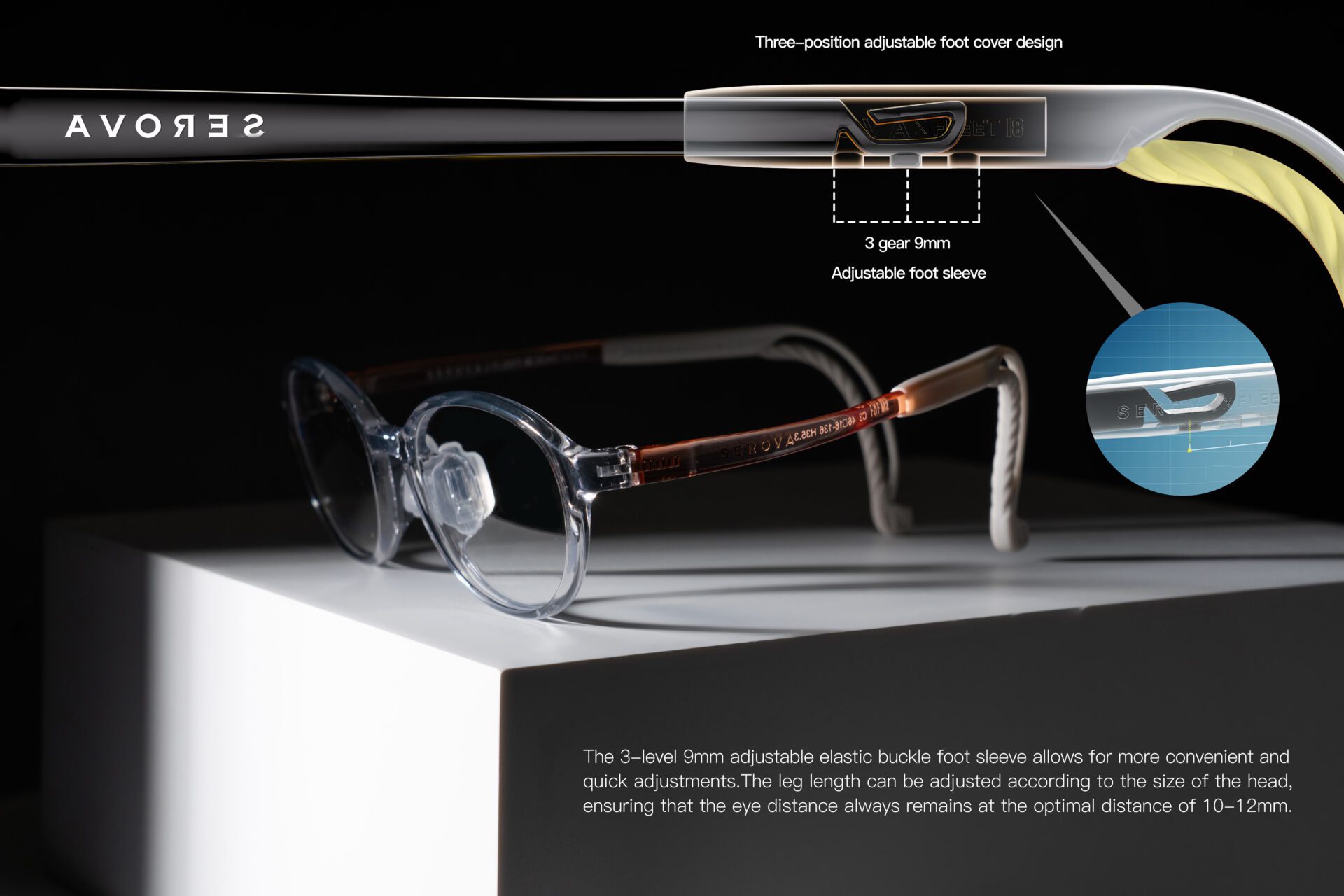 At the connection between the temples and the ear tips, a three-level, 9mm adjustable elastic clasp is designed, allowing children to personalize the fit according to their head shape, maintaining a consistent eye-lens distance.