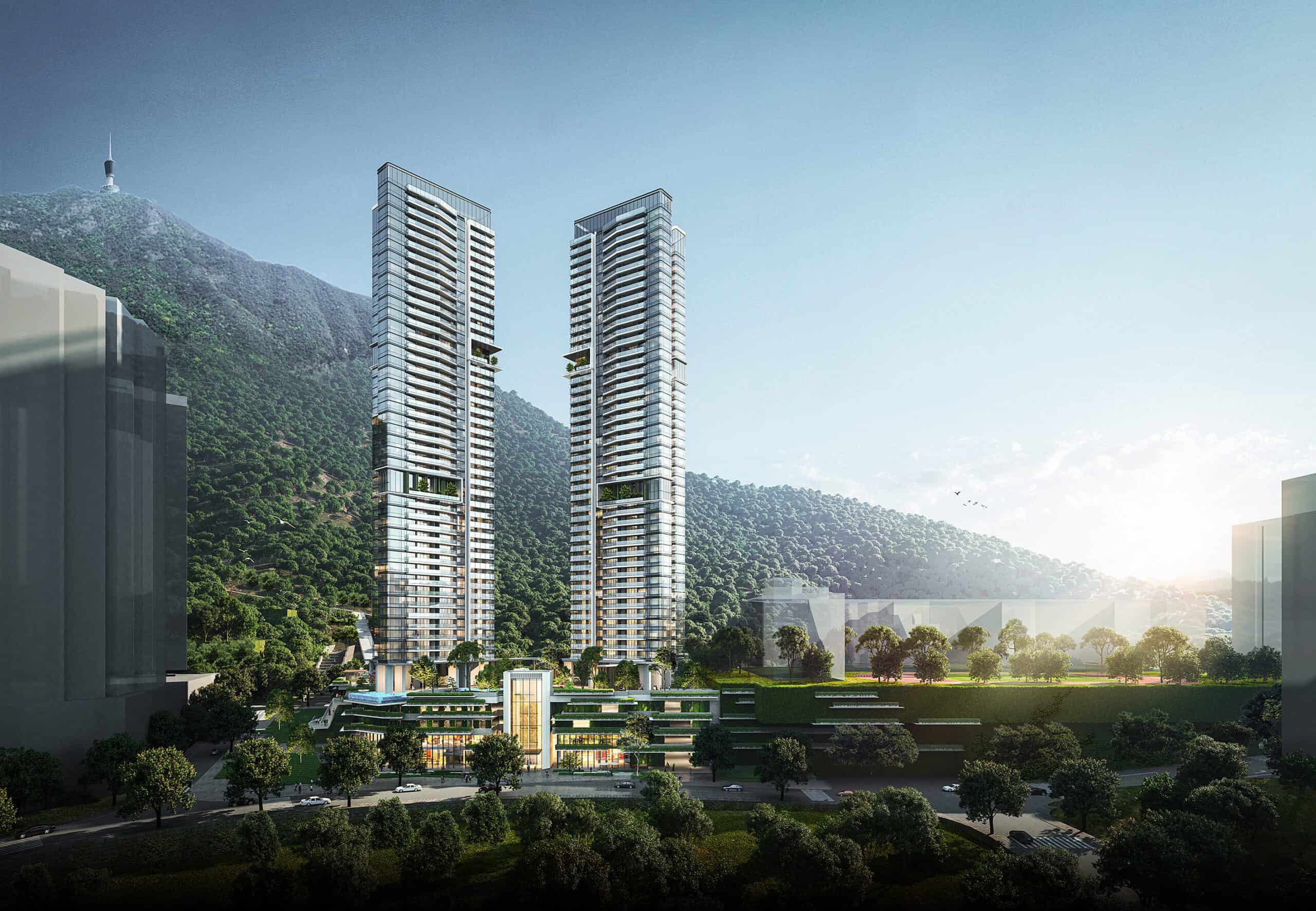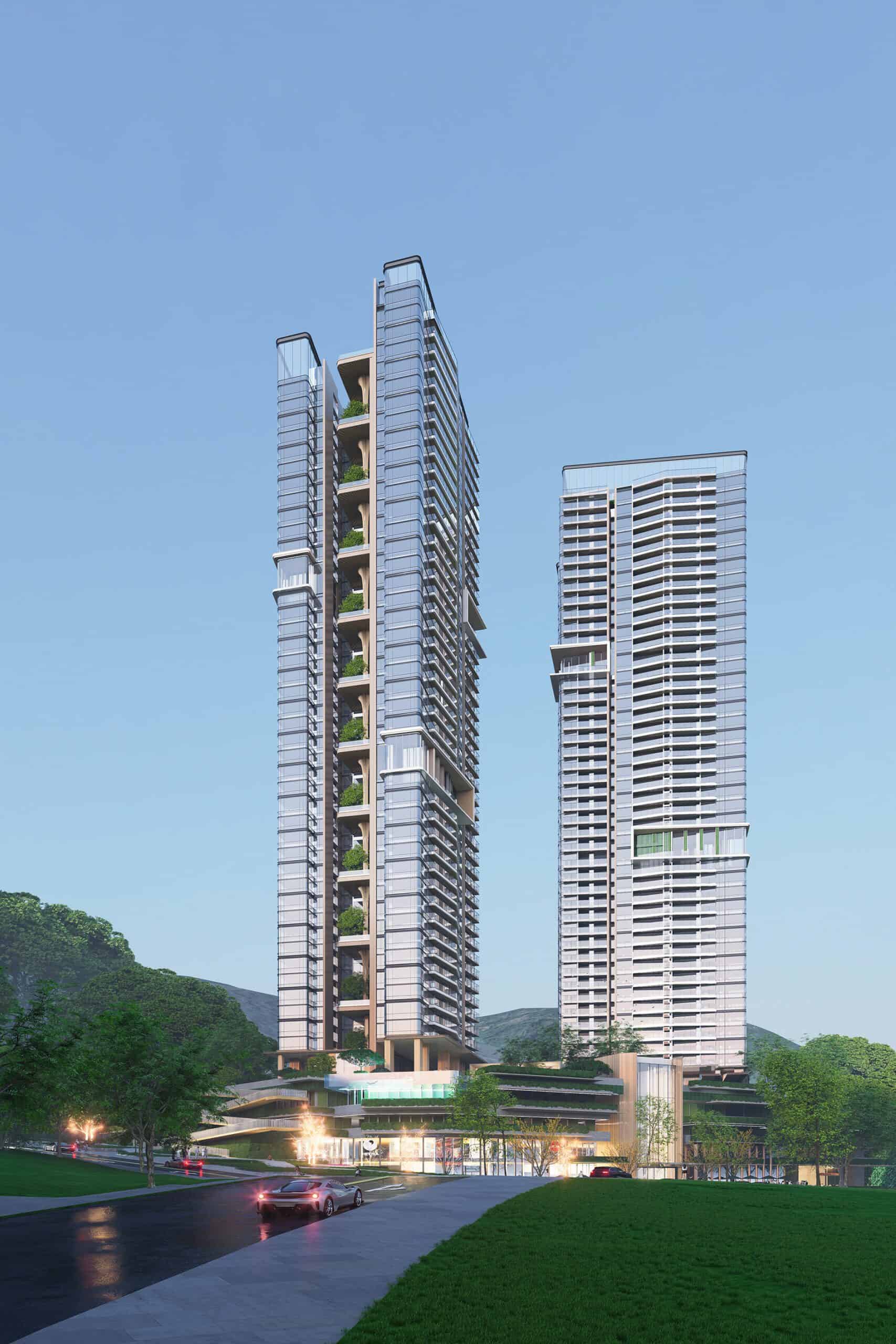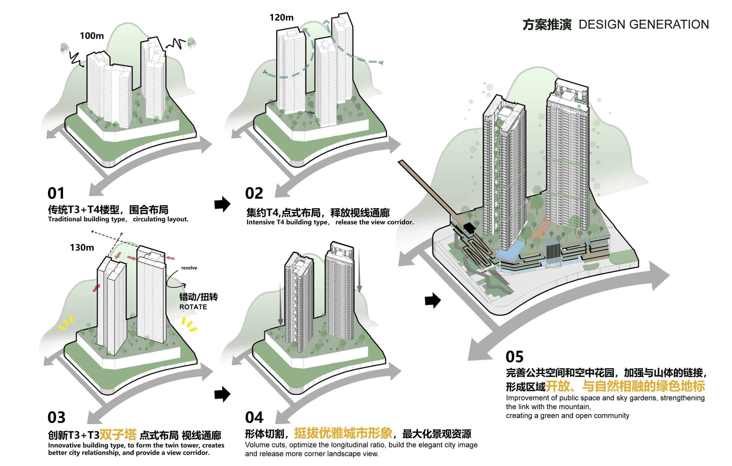 In the preliminary plan deduction, the traditional building type and enclosed layout were abandoned, and the innovative twin tower type and layout mode were adopted to maximize the visibility of the corridor and enable households to enjoy the view. At the same time, through form cutting and depiction, the upright and elegant city image was established to strengthen the connection with the mountains, obtain more landscape resources, improve public spaces, introduce hanging gardens, and create a green landmark that is open and integrates with nature.
