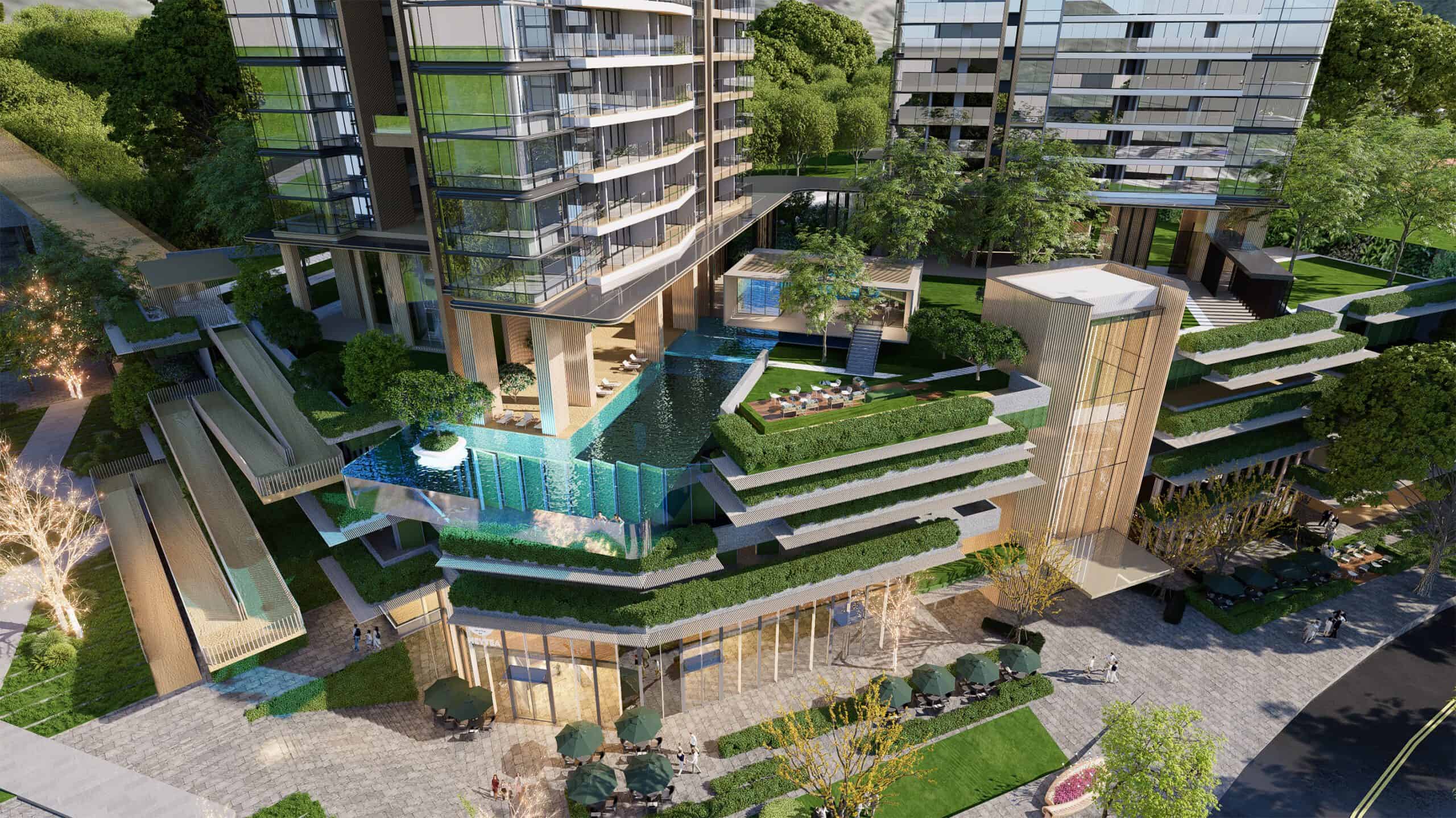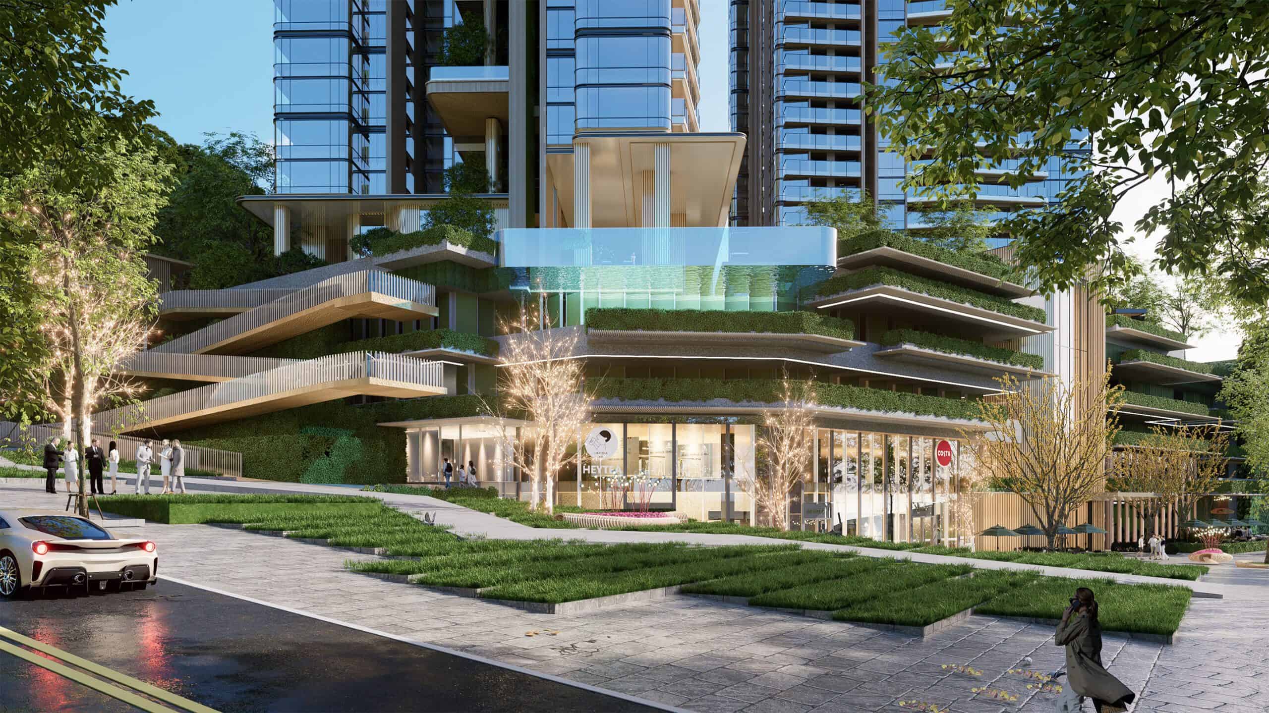 At the main interface of the city, the green twin towers bring a three-dimensional community image of ecology and integration with nature to the city, take the waterfall in nature as the modeling inspiration to depict the smooth vertical flow of water and the agility of jumping between rocks, integrate geometric lines and straight variations in the natural world using contemporary techniques, and emphasize the creative concept of elegance, simplicity, and modularity.