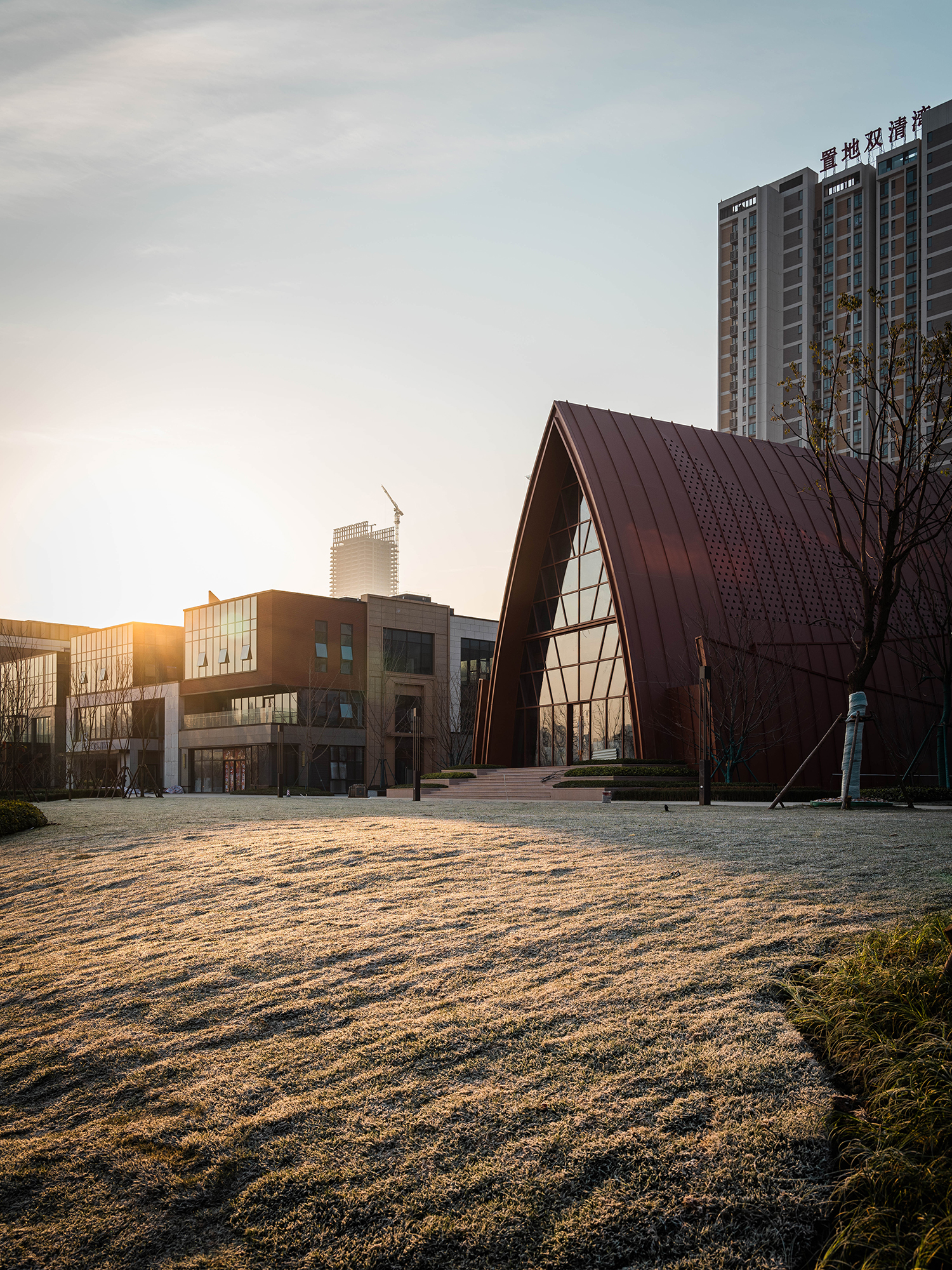 The project is located next to the Central Square at Shuangqing Bay commercial district, north of a commercial pedestrian street and south of a tributary of the Shuangqing Bay. The building is conceived as an arched sculptural volume, which becomes a part of the square and extends the square activities.