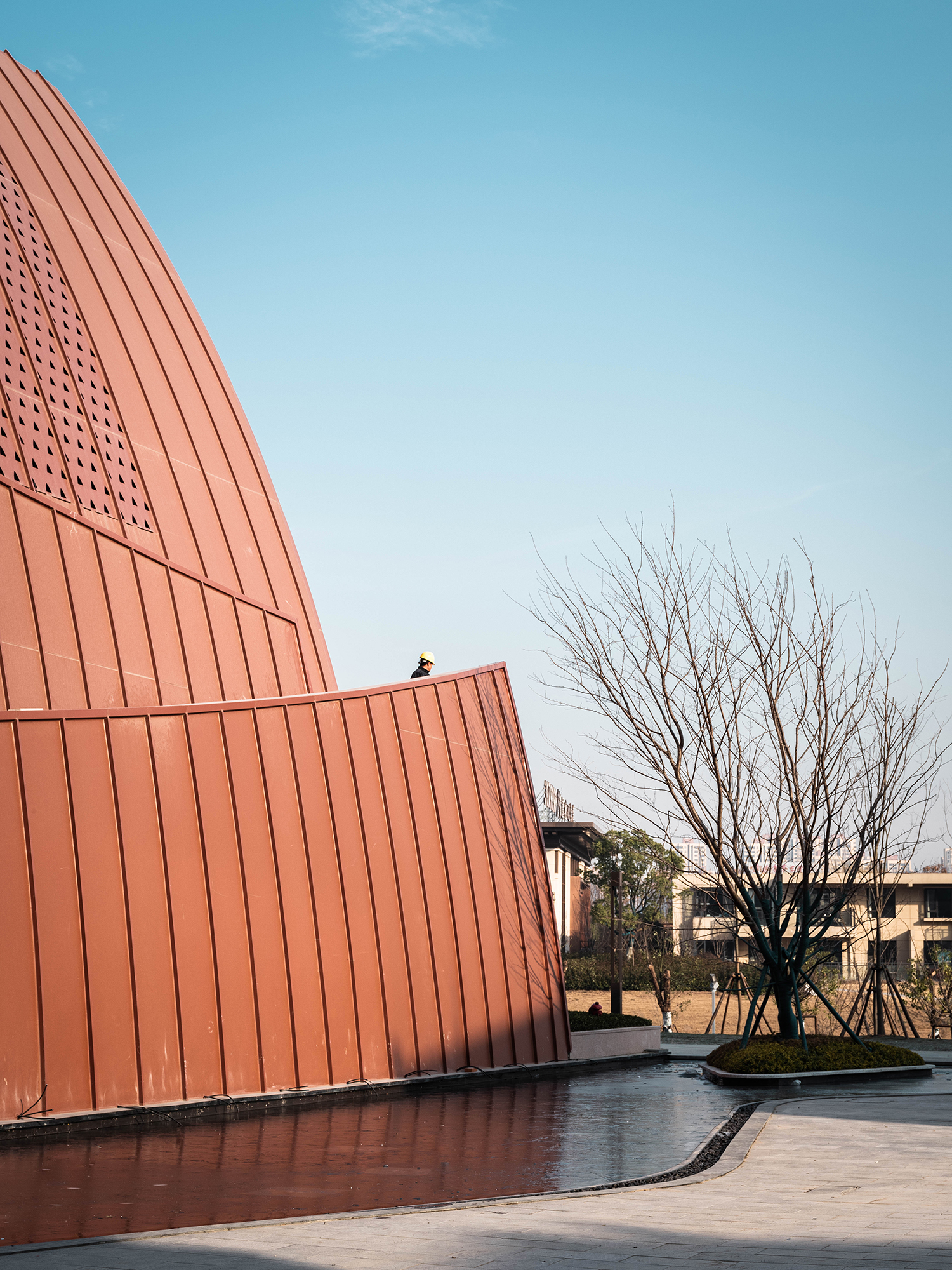 Occupying a gross floor area of 500 square meters, the architecture adopts steel structures with the exteriors made of specially treated rust-red aluminum plates. It functions as a wedding house, a temporary place for performance, and a versatile space.
