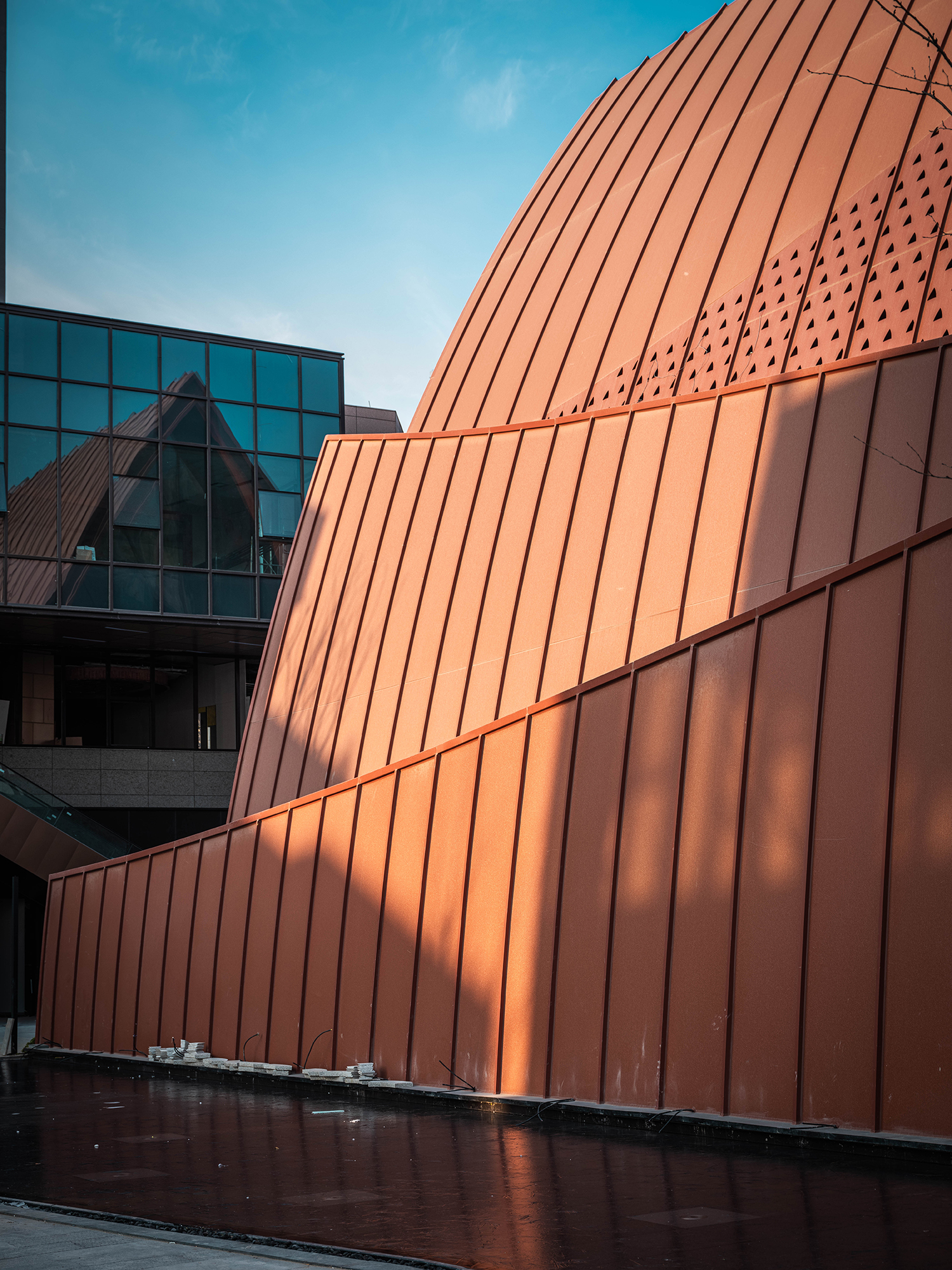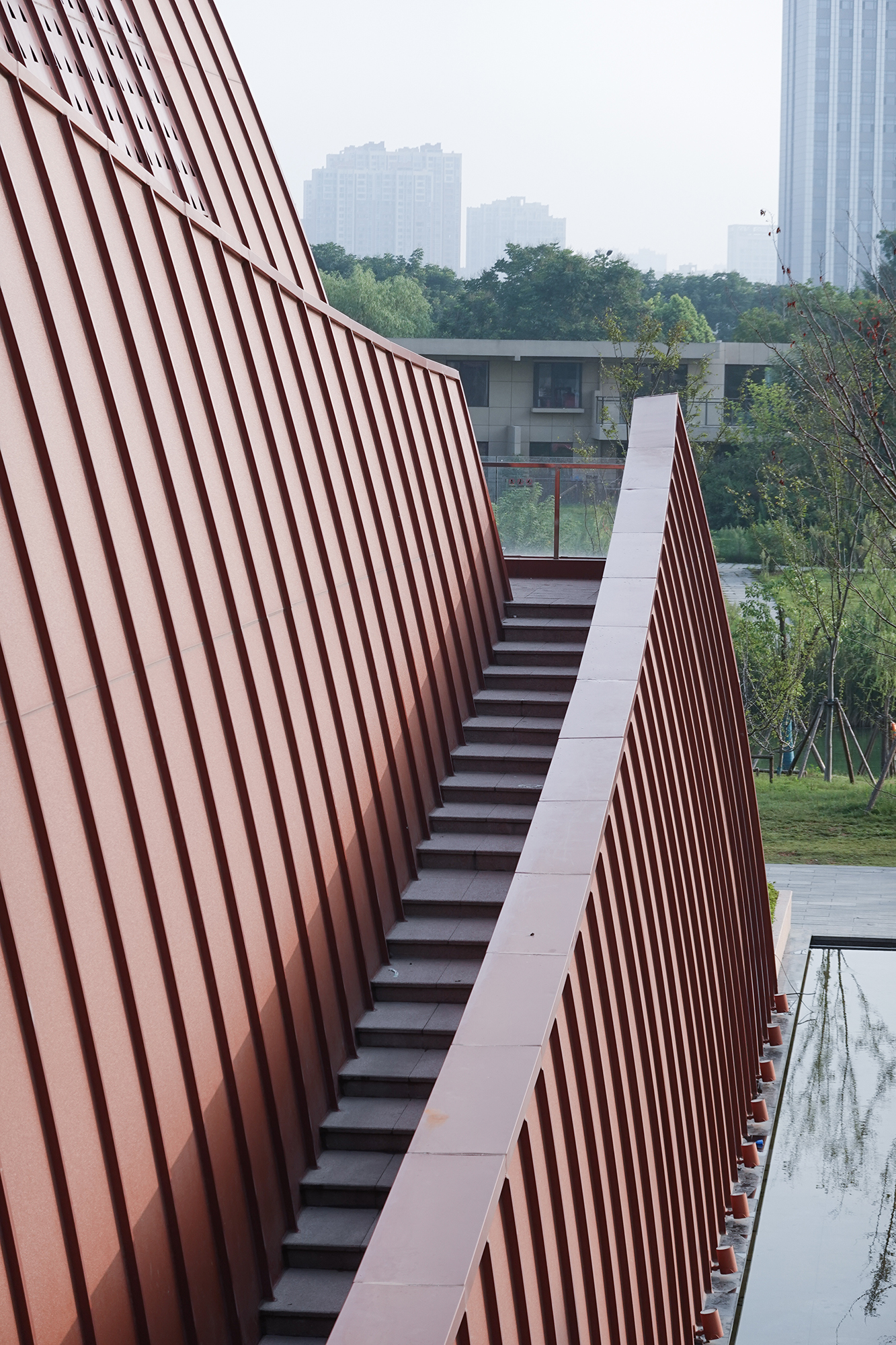 For the square-facing facade, steps are set between two curved walls, and the continuously upward curves lead citizens to climb up. Along the way, activities on the square, the riverside scenery and varying scenes at different heights gradually come into sight. The steps form a walkable facade, which extends the public activity space of the square. The pool is designed with a reflective surface, which creates a stretching visual effect for the architecture. The pool, as a part of the water system at the district, offers an intriguing experience for kids in the summer.