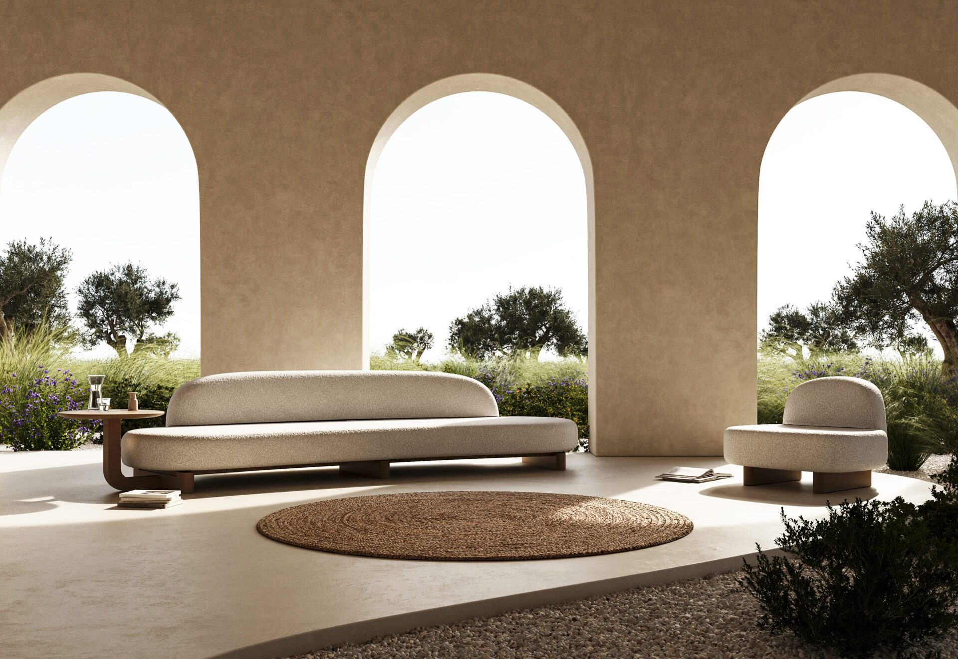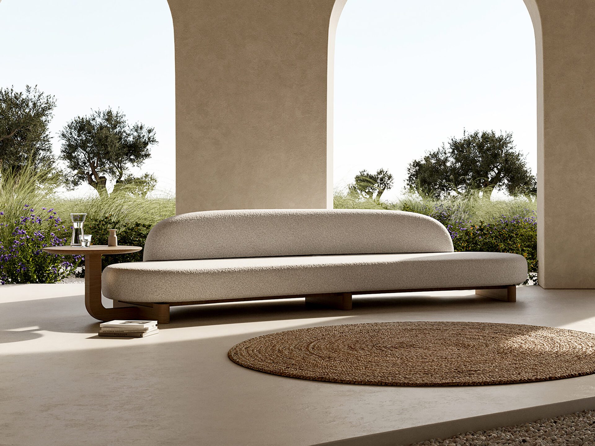 The Sofi Collection is a sculptural outdoor furniture series inspired by coastal landscapes and botanical forms. Featuring a sofa, lounge chair, coffee table, and side table, the collection pairs smooth, pebble-like silhouettes with expressive, plant-inspired details. Crafted from sustainable Iroko wood, weather-resistant aluminum, and porcelain, each piece balances elegance with durability. Waterproof, UV-resistant fabrics with removable covers simplify upkeep in high-use environments—ideal for luxury hospitality and elevated residential settings. Designed with sustainability, comfort, and maintenance in mind, Sofi transforms outdoor spaces into sophisticated extensions of the interior experience.