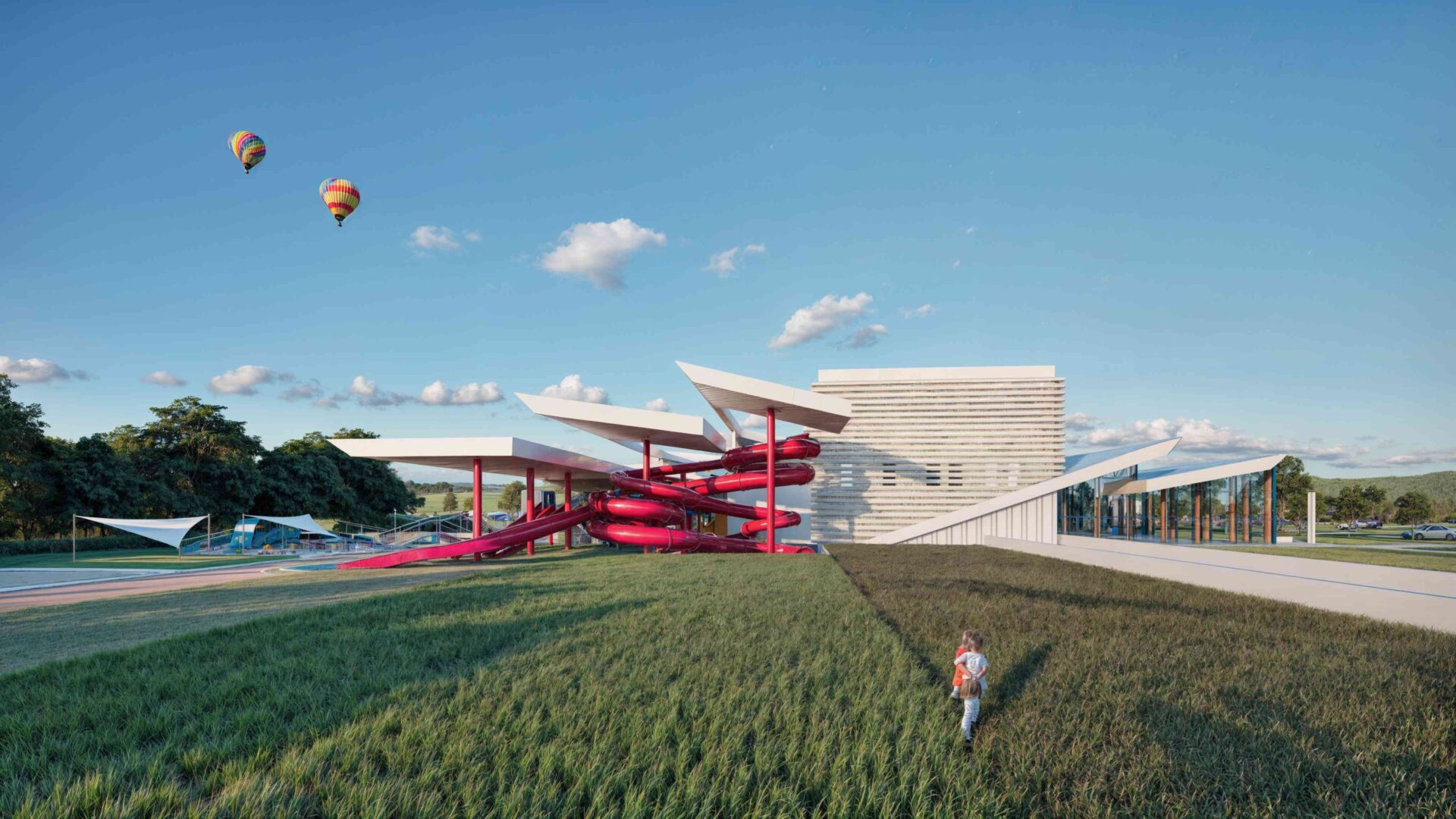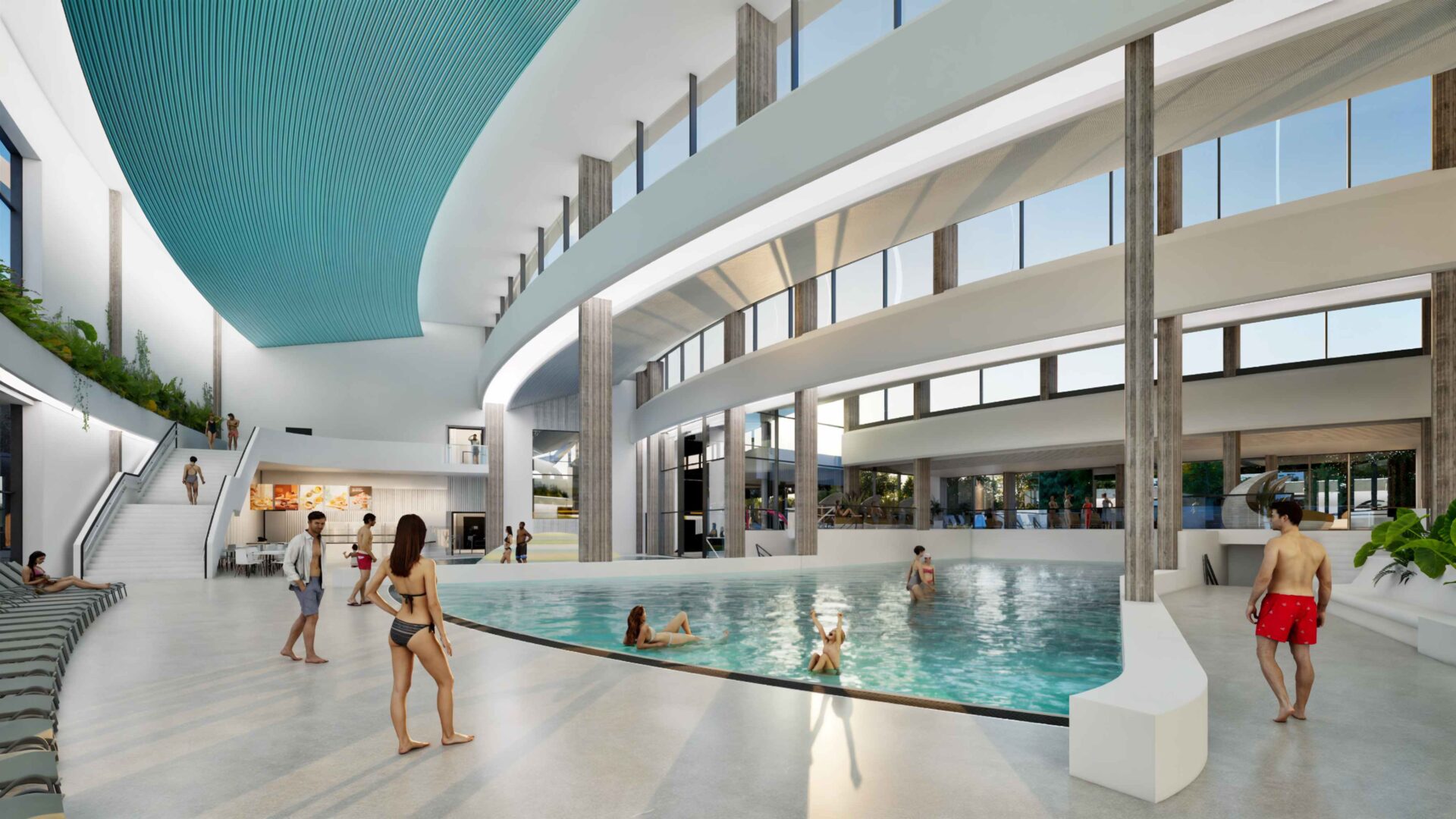 Functionally, the design responds to all generations, all bodies, all weather. Recreational and sport pools, VITAL thermal zones, and children’s areas with beaches and interactive water features offer something for every visitor. The EduBox© concept transforms learning into play- modular, tactile installations that invite experimentation and parent-child connection.