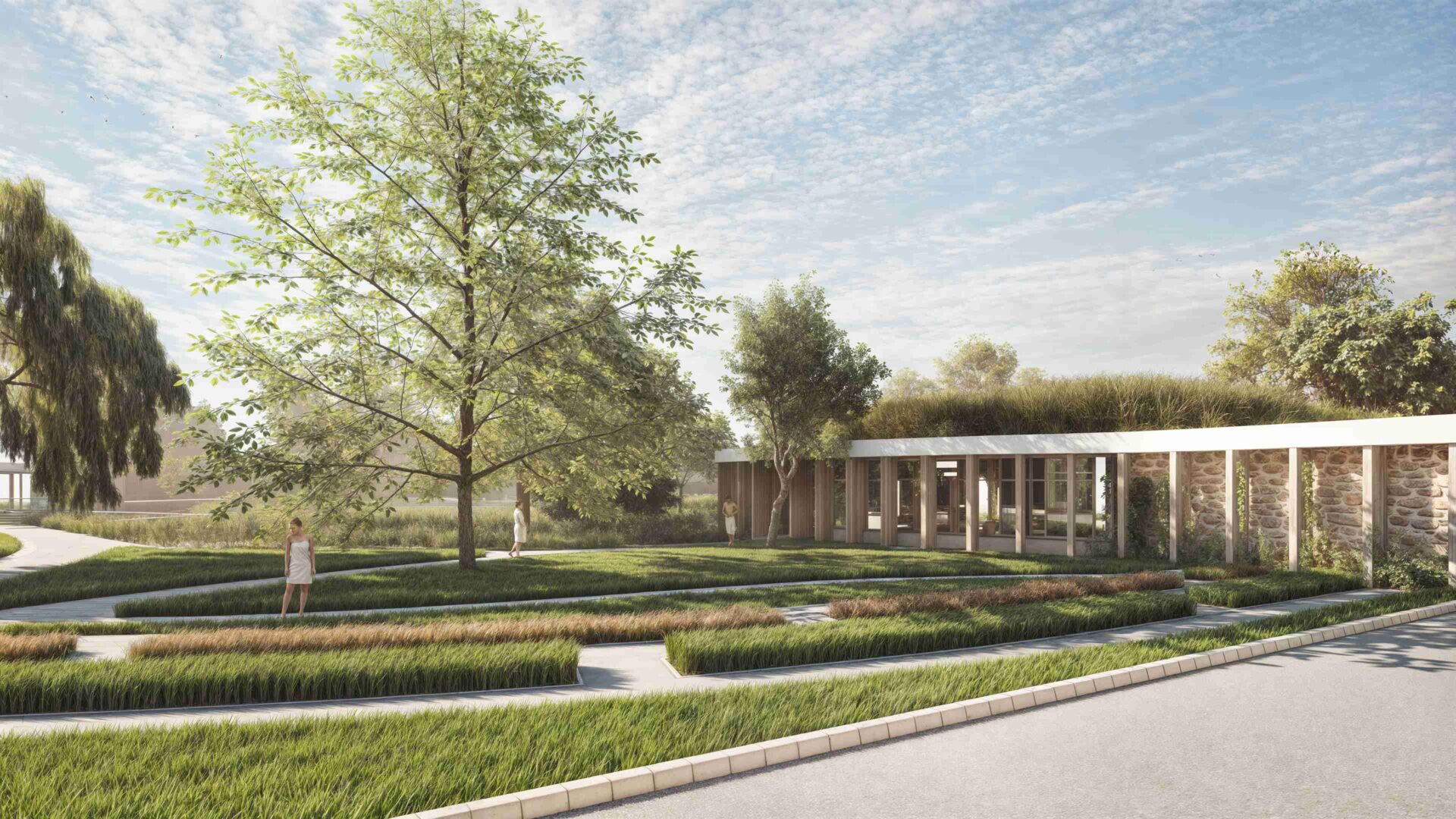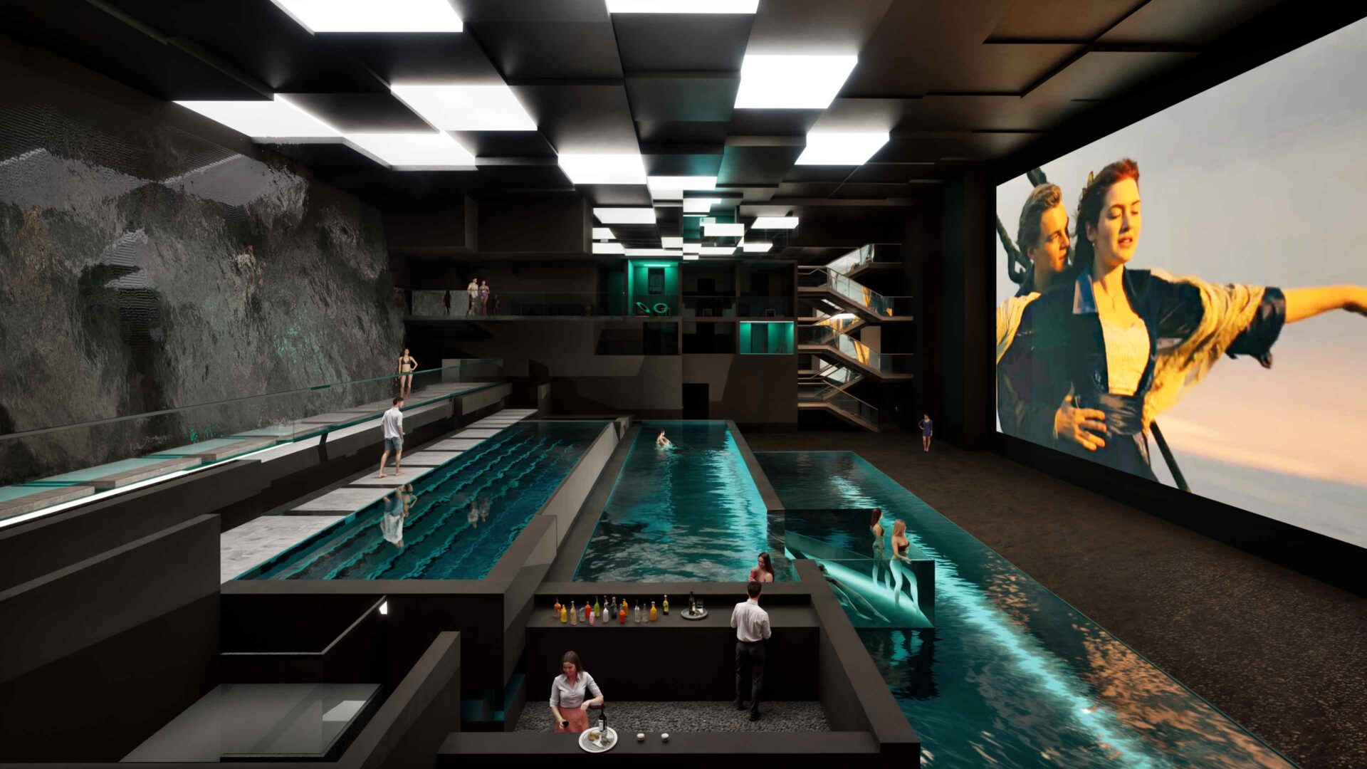 The masterplan divides the site into three interwoven zones: a northern wellness garden and saunarium, an eastern educational and entry plaza, and a southern summertime world of outdoor pools and sunlit beaches. This zoning is spatial storytelling, allowing the visitor to experience the passage from civic life into leisure, from movement into stillness.