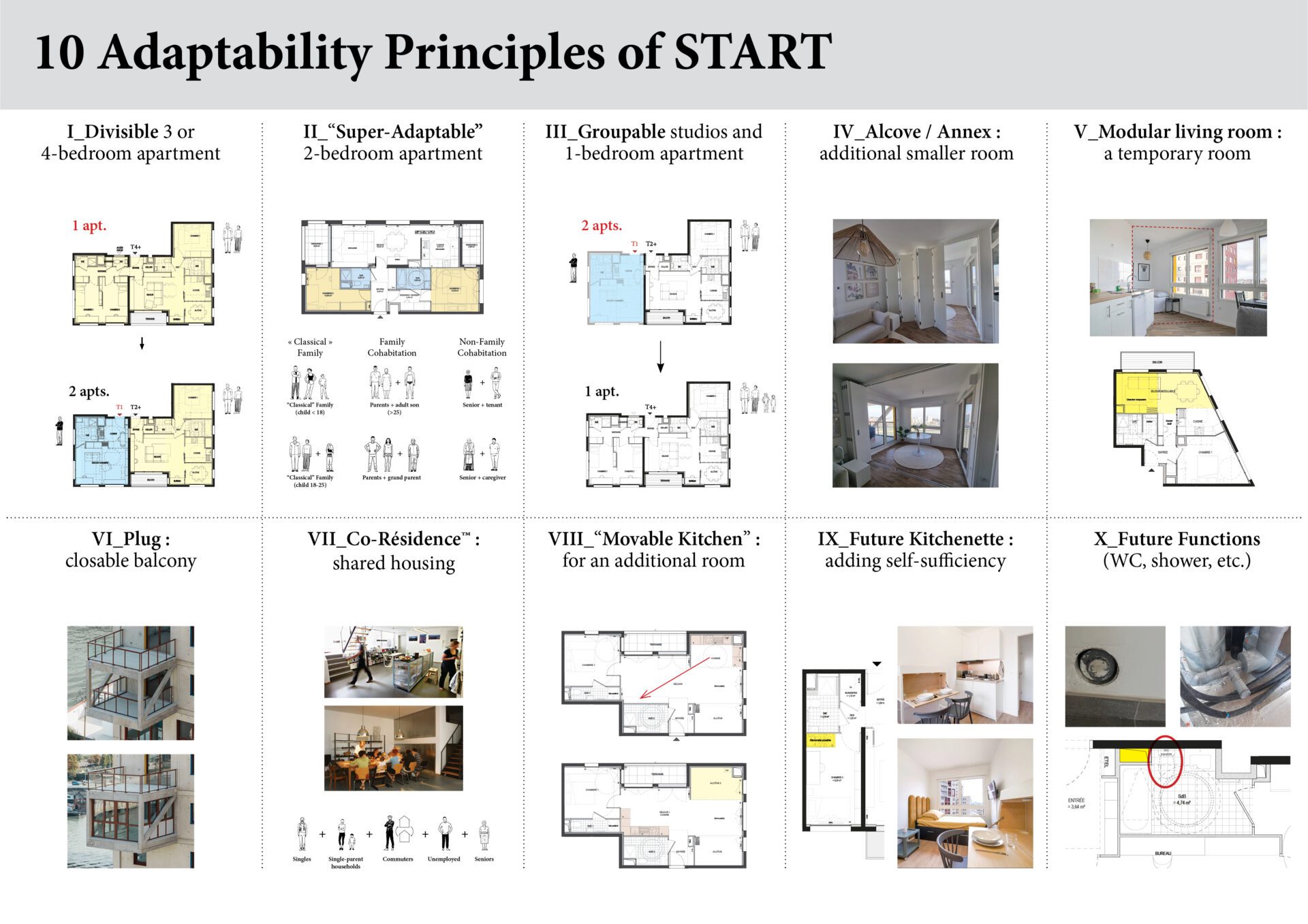Three series of principles were set up in order to orchestrate the project: “10 Adaptability Principles” (see image), to ensure flexibility and resilience in the apartments, “8 Space Quality Principles”, and “10 Principles to create a Good Tower”, for a positive declination of density.