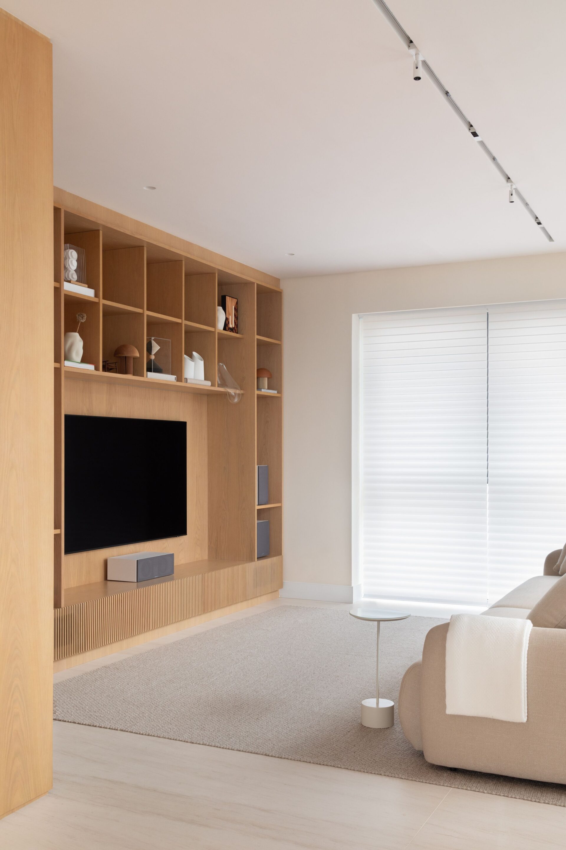 Millwork plays a fundamental role in the project’s identity, blending precision with lightness. A natural oak wood bookshelf with integrated lighting becomes a focal point, adding depth and warmth to the living space. Custom-designed built-in elements integrate seamlessly into the architecture, reinforcing visual continuity and the overall cohesion of the project.