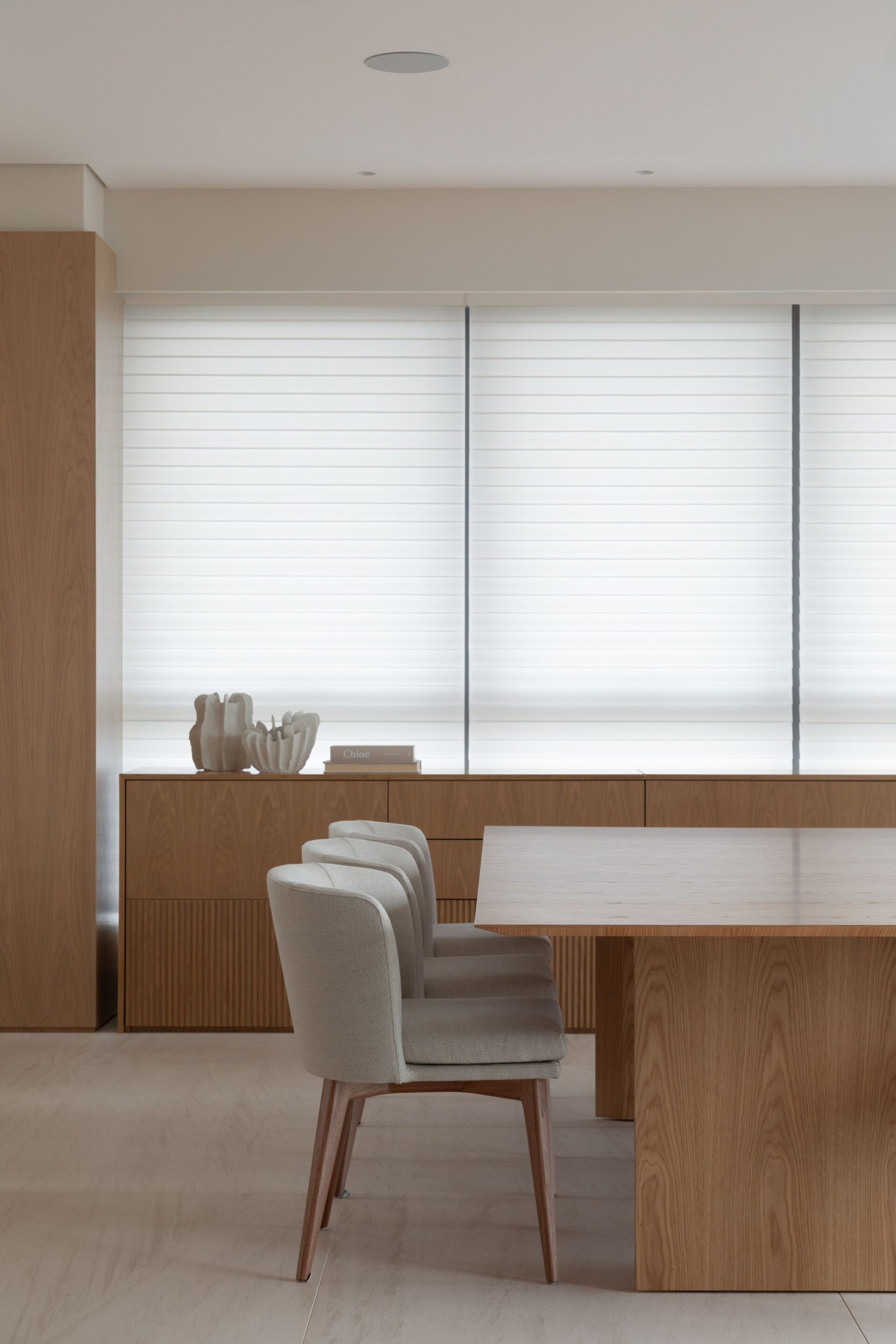 The project embraces natural light and ventilation, optimizing thermal comfort and enhancing the residents’ daily experience. The carefully selected materials follow a neutral palette and textures that evoke a sense of warmth and balance, creating an inviting and serene atmosphere. The expansive windows frame the captivating views of Barigui Park and the city skyline, seamlessly integrating the urban landscape into the everyday life of the apartment.