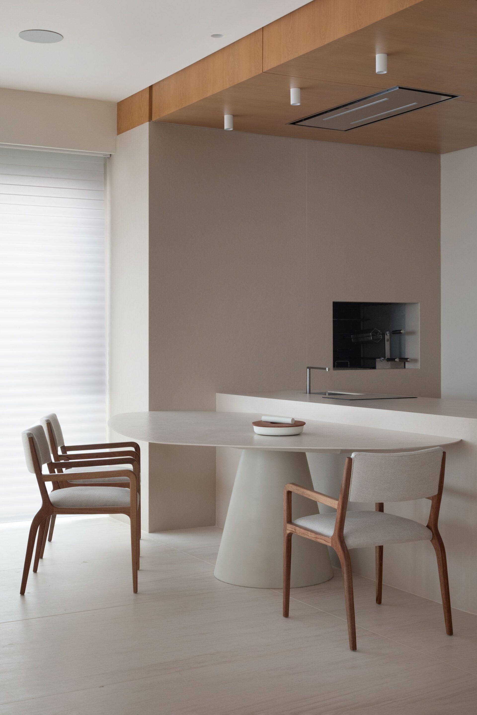In the kitchen, the central island in Dekton, with waterfall edges on both sides, creates a functional yet visually striking element. In the gourmet space, an exclusively designed table was developed to fit perfectly against the countertop, establishing a composition that balances aesthetics and practicality. This relationship between the two elements fosters versatility, allowing for different configurations—whether for hosting friends or enjoying more intimate meals.