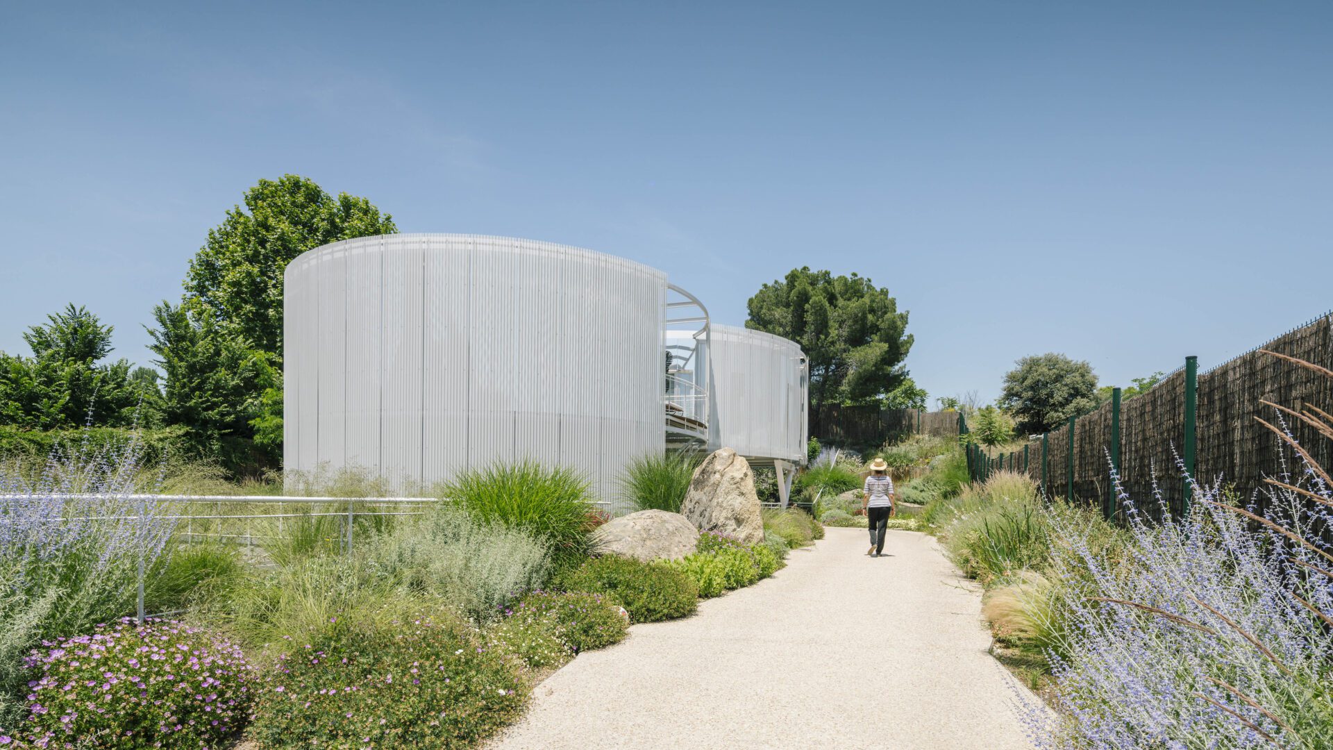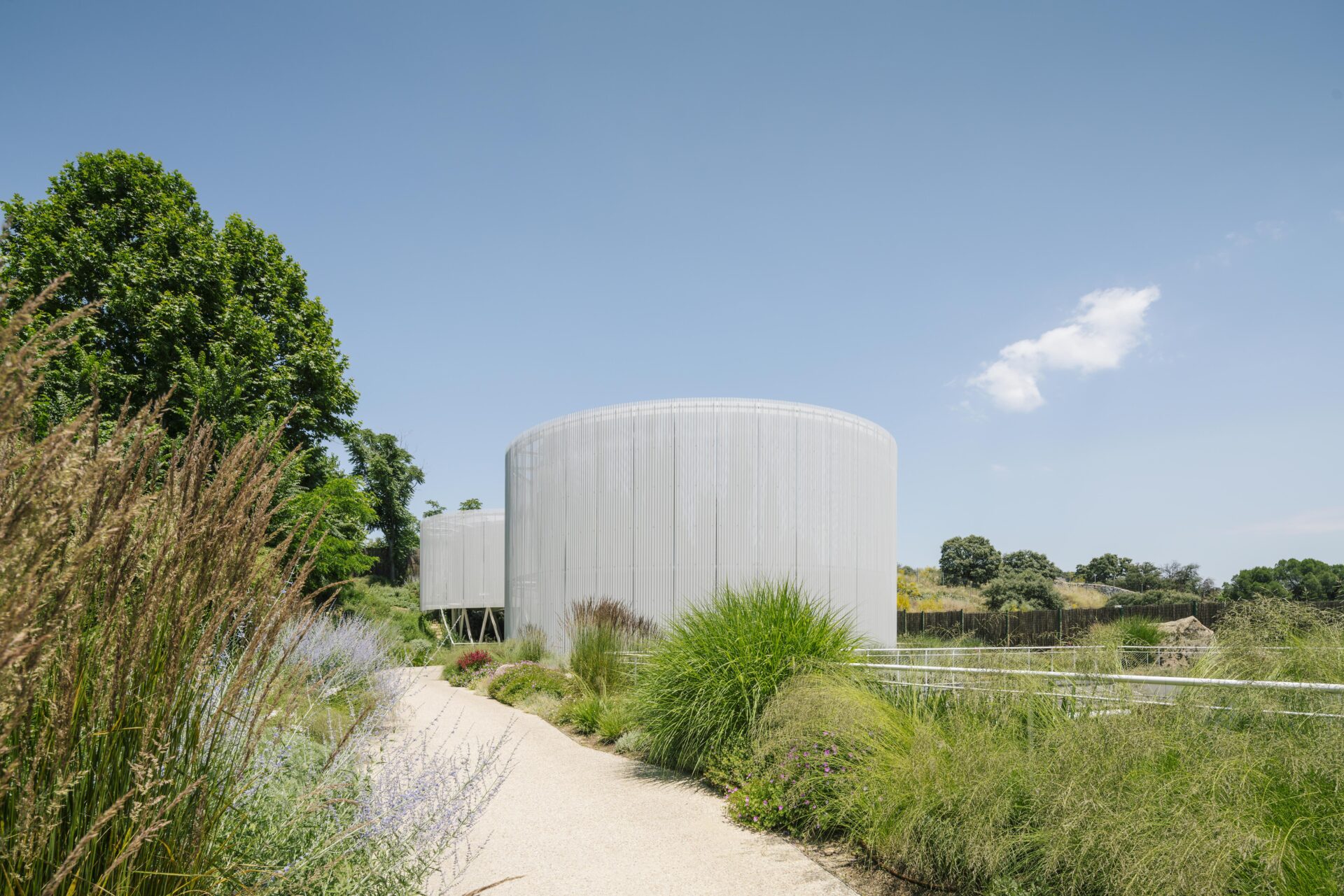 The surrounding garden has a wild, unmanicured appearance that blends seamlessly into the natural context. Granite rocks are scattered among plantings of perennials and ornamental grasses, creating rich textures and a constant sense of movement. Barely visible dirt paths lead to the house or meander through the landscape in an organic, fluid layout. The use of local and natural materials is prioritized, reinforcing the connection to the site. Over 50 plant species were chosen to provide seasonal color, texture, and biodiversity, attracting pollinators and other insects during spring and summer. It is a dynamic, living garden—vibrant in the warmer months, then resting through the winter to withstand Madrid’s harsh seasonal shifts.