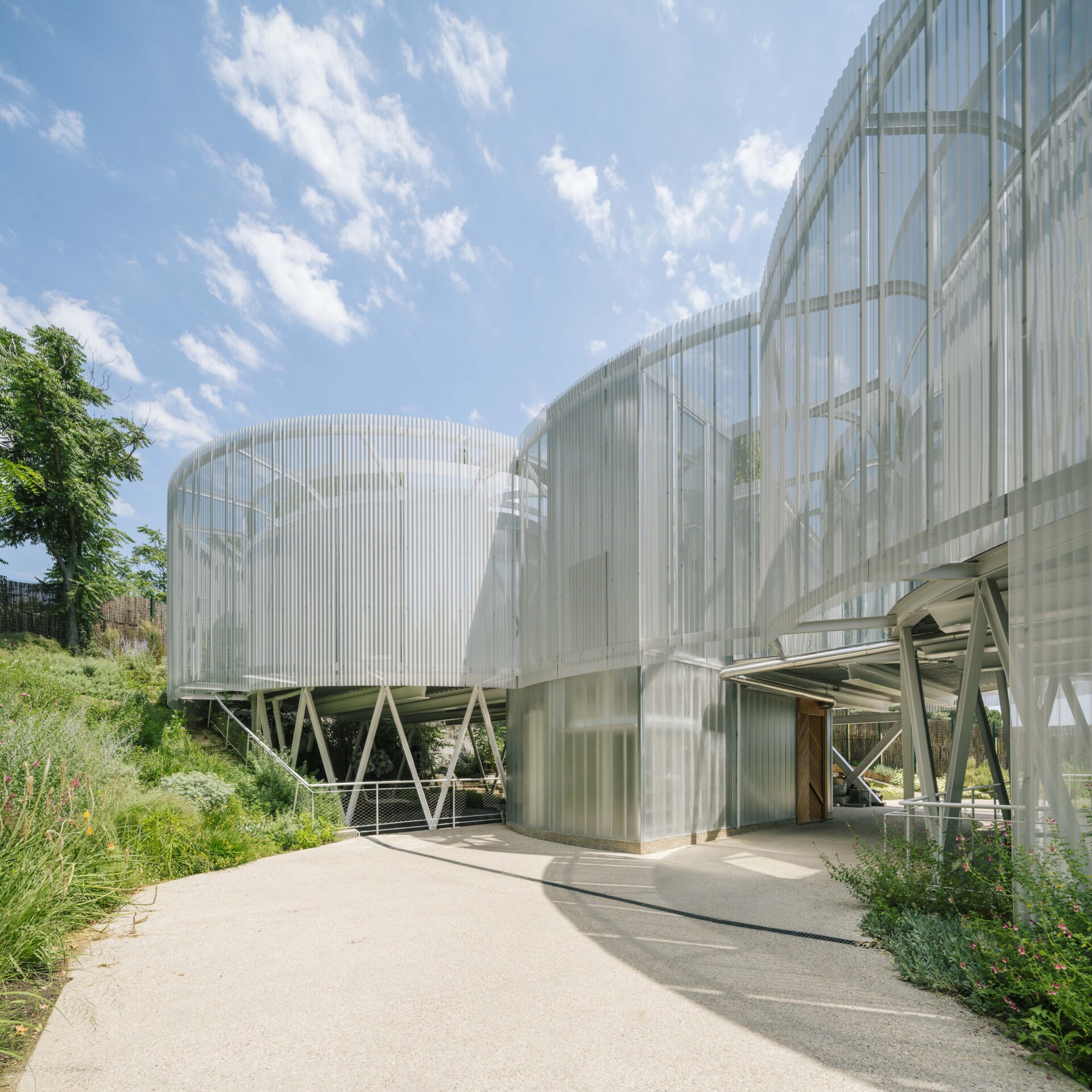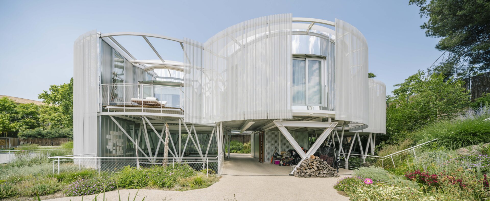 Known as the "Slide House", this unique three-story home is built into the terrain through a deep cut framed by two concrete walls. The basement level sits within this cut, while a lighter structure above houses the remaining two floors. The design seeks to recreate a natural landscape on the hillside, from which cylindrical volumes emerge to form the living spaces. The gap between the concrete walls creates a series of intimate gardens, conceived as outdoor living rooms that extend the interior spaces.
